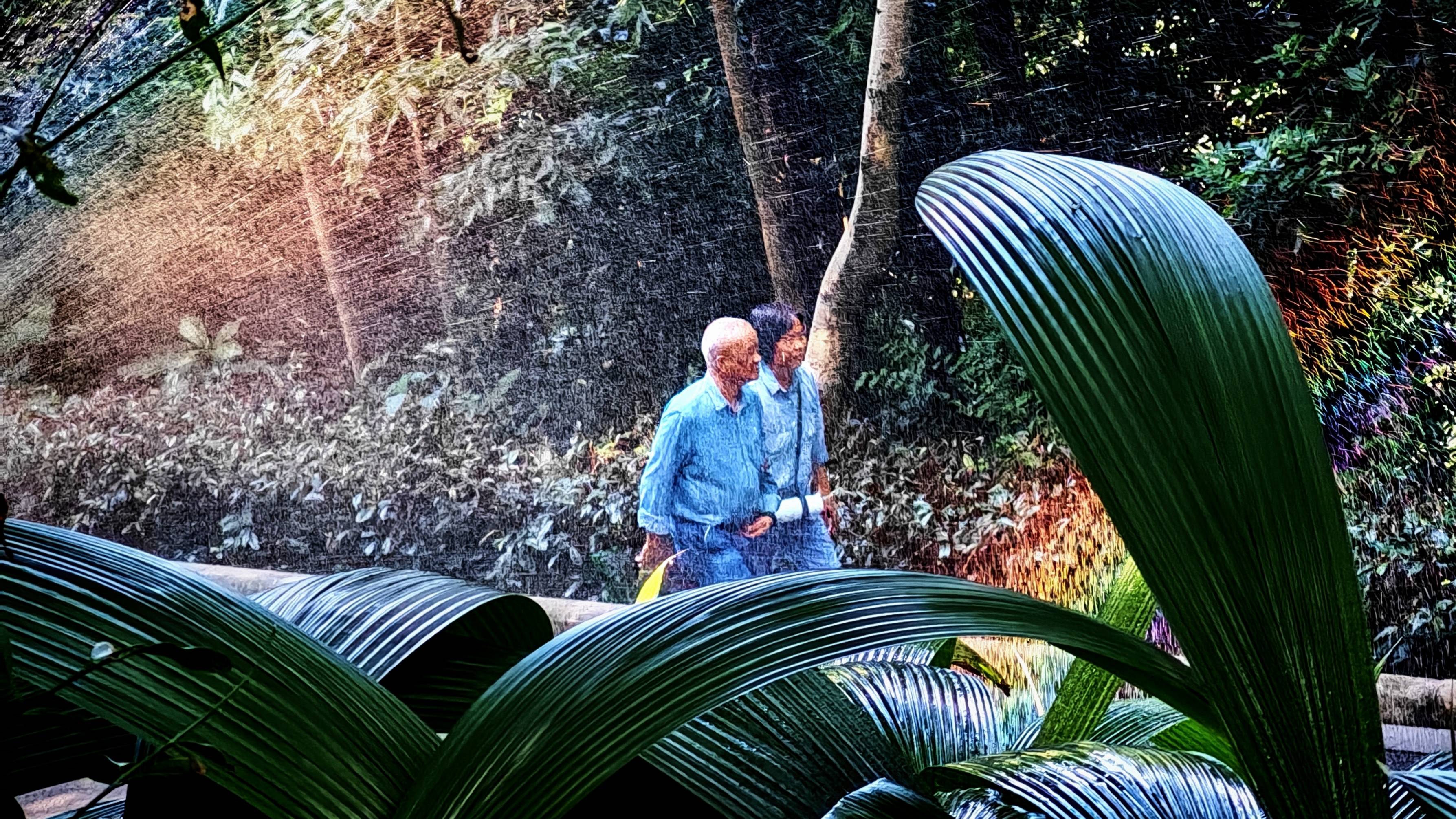 主题阐释:公园内两位蓝衣老人手挽手走过正在洒水的绿化带,在阳光的照映下老人被彩虹包围,走向幸福的生活