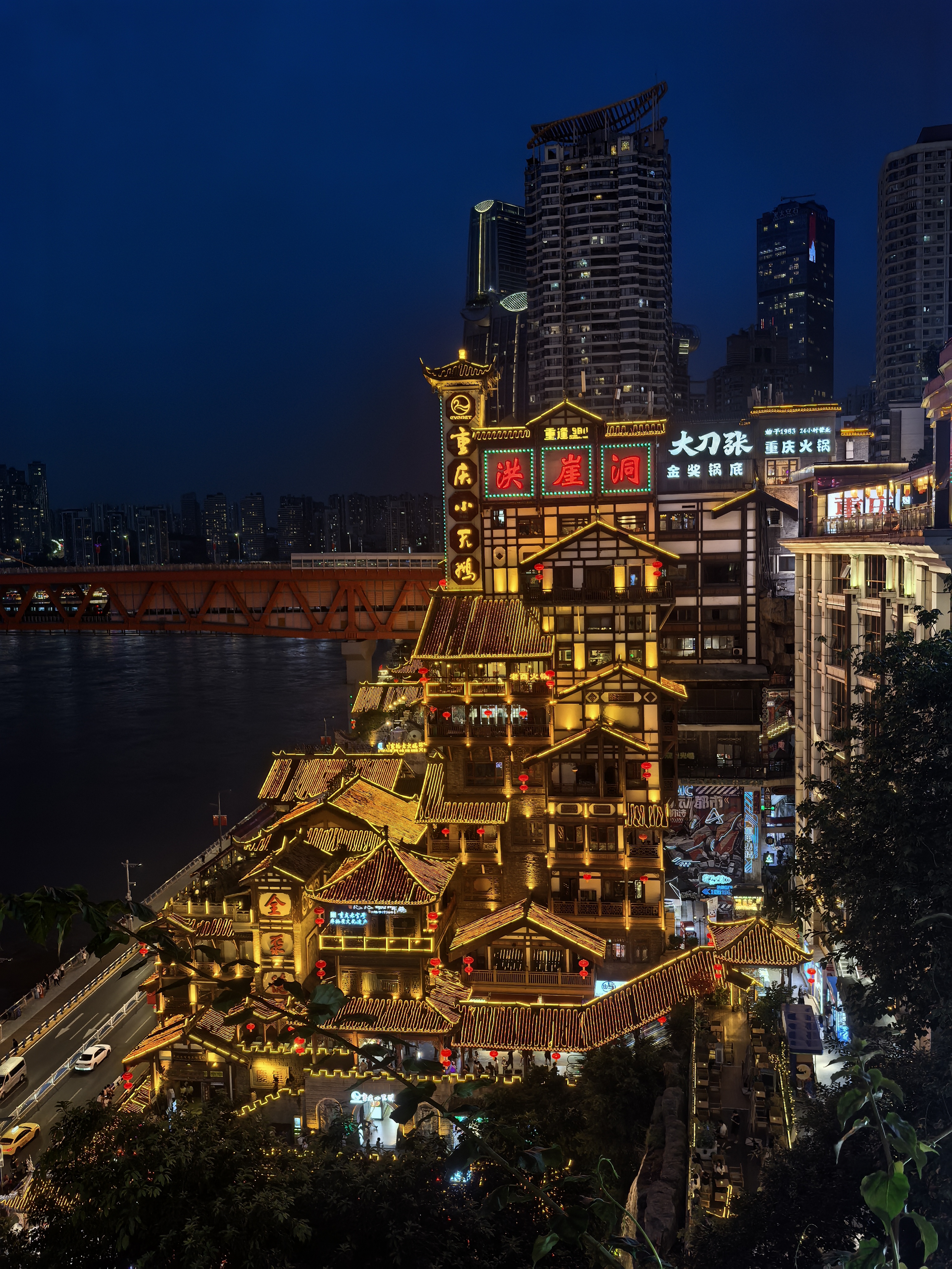 华灯初上的重庆洪崖洞,吊脚楼群在夜色中鎏金焕彩,传统巴渝建筑与背后的现代摩天楼宇相映成趣,嘉陵江畔的这一幕,是山城古今交融的独特缩影。