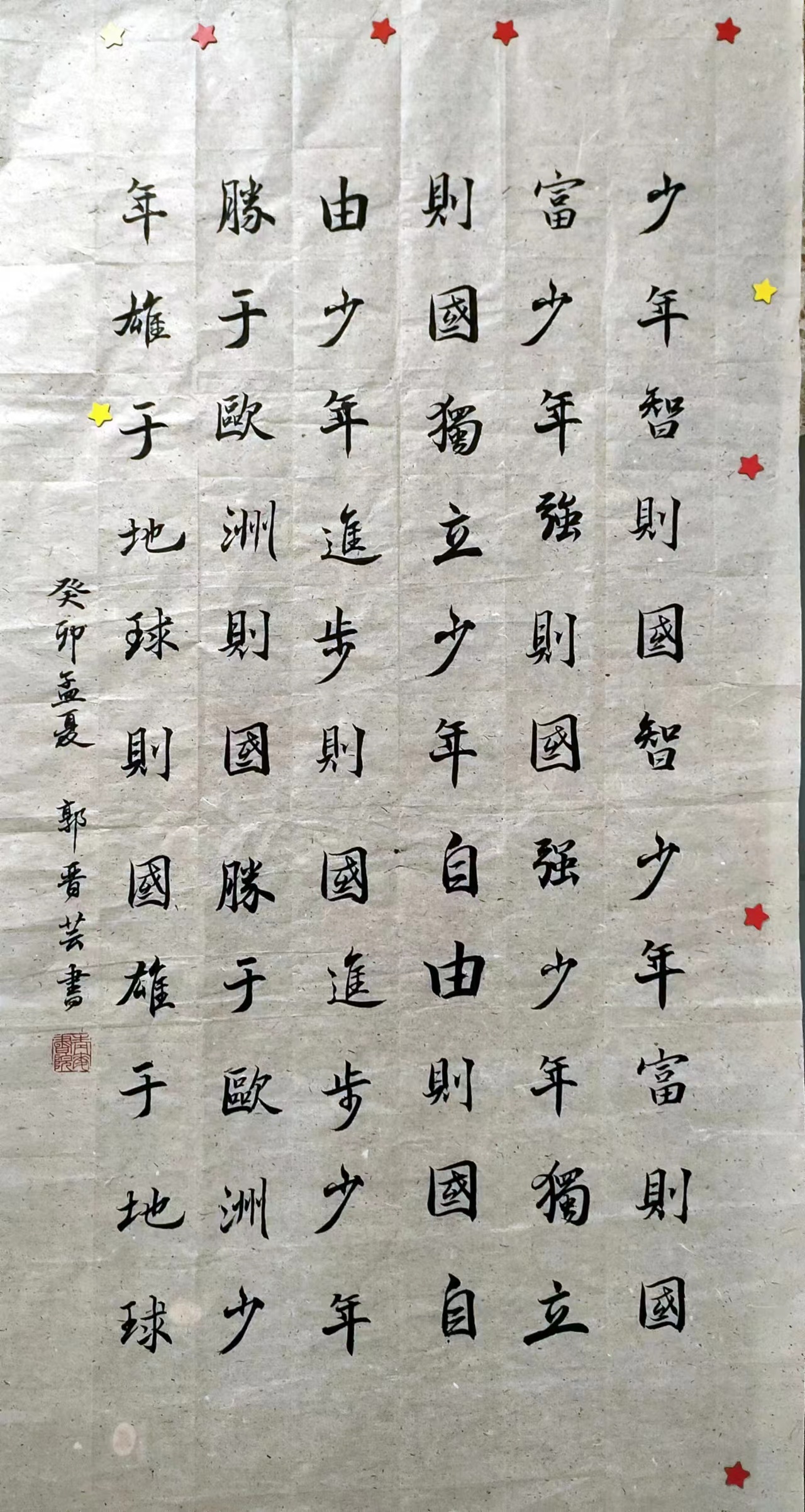 作品编号:461姓名:郭晋芸所属代表队:其他作品介绍:内容选录自《少年中国说》,用行楷进行书写创作。以激昂饱满的诗人般的笔触描绘了一幅中国少年奋发有为而少年中国豪迈崛起的振奋民众、激动人心的画面,鼓励年轻一代肩负起建设少年中国的重任,表达了对祖国繁荣富强的愿望和积极进取的精神。