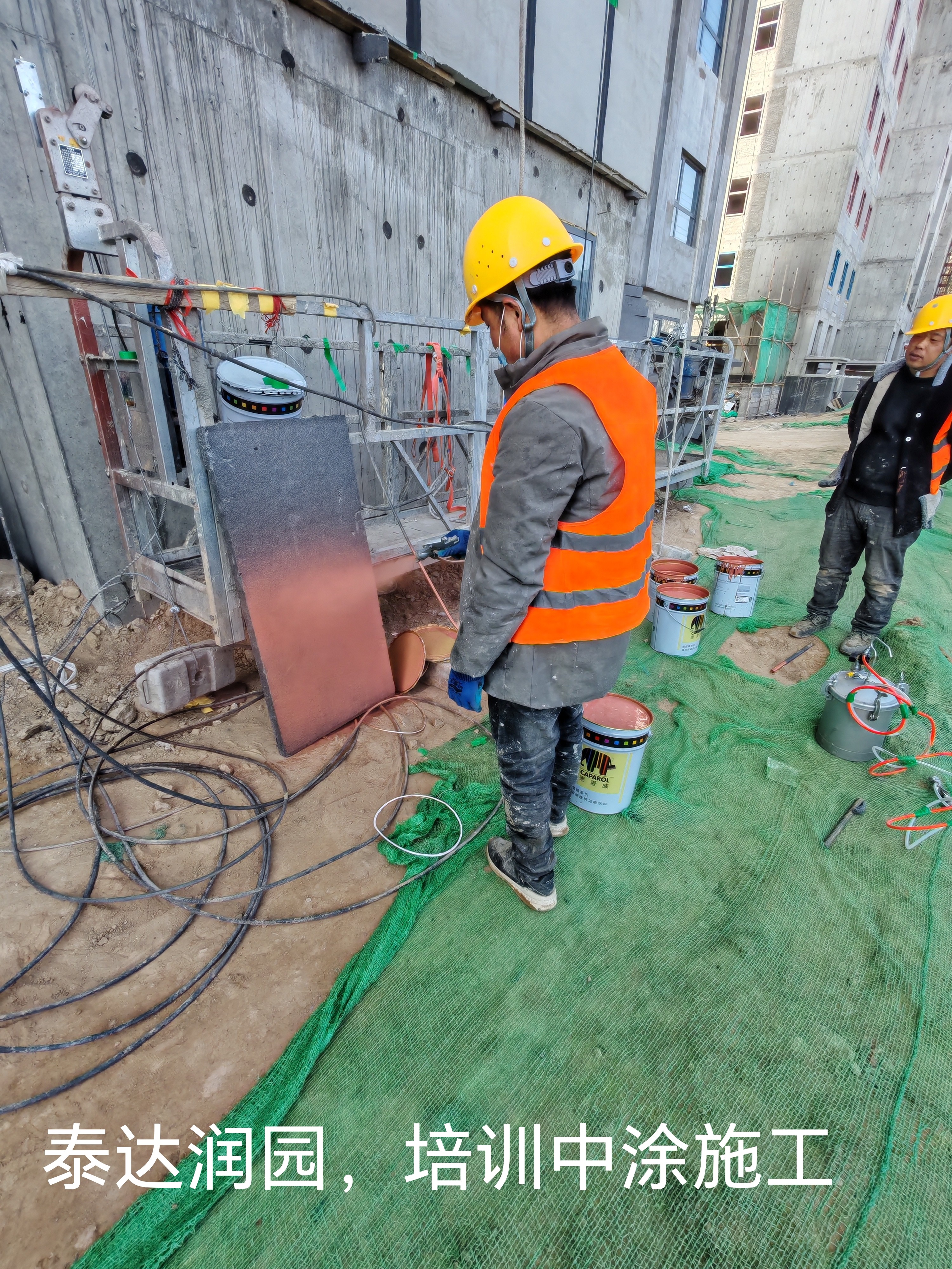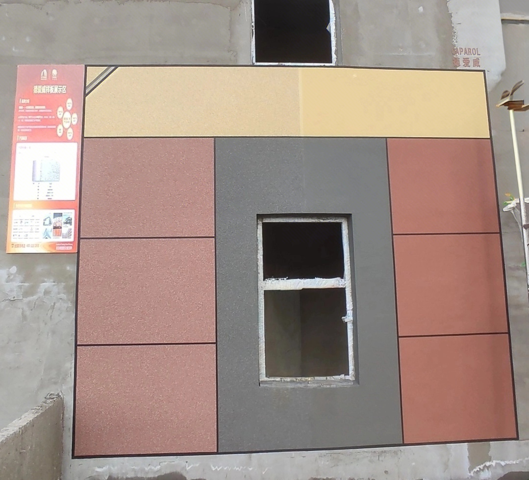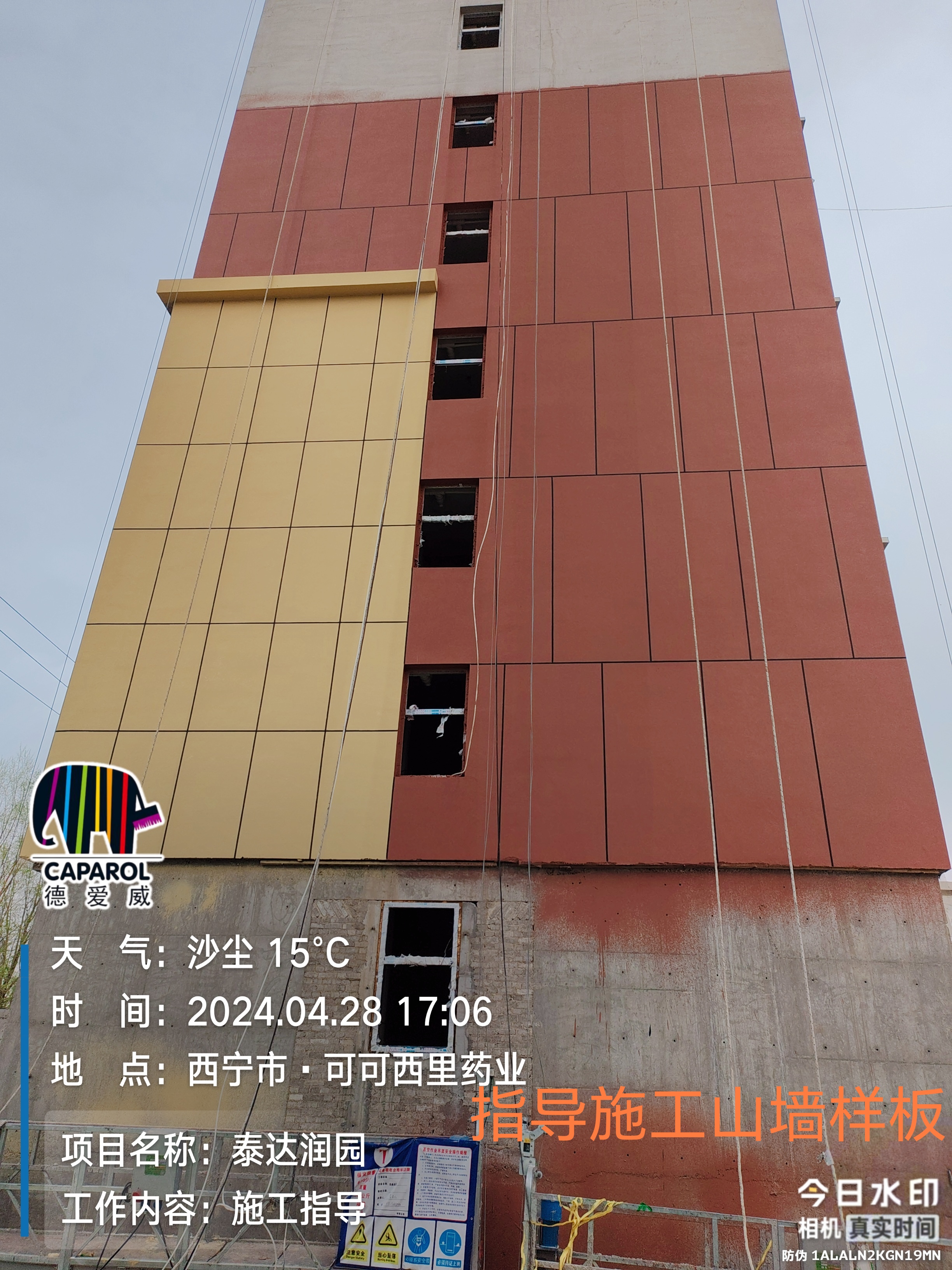 次日,脚手架搭起,涂料就位。为凸显效果,我特意将样板分置于窗户两侧:左半幅是跳跃的彩点水包砂,右半幅是沉稳的纯色水包砂,黄、灰、红的搭配恰是高原人钟爱的热烈。左侧空白处嵌入公司简介与施工工艺标牌,右上角烙下德爱威logo。最后用保护膜严密覆盖,防止竞品不小心污染。这几天尽管忙碌和辛苦,但看着成型的样板展现出来,就像是德爱威在青藏高原插下的鲜艳旗帜。瞬间疲惫化作欣慰,每一块样板都是我的作品,容不得半分懈怠,这也是我作为技术员一直坚守的信念。