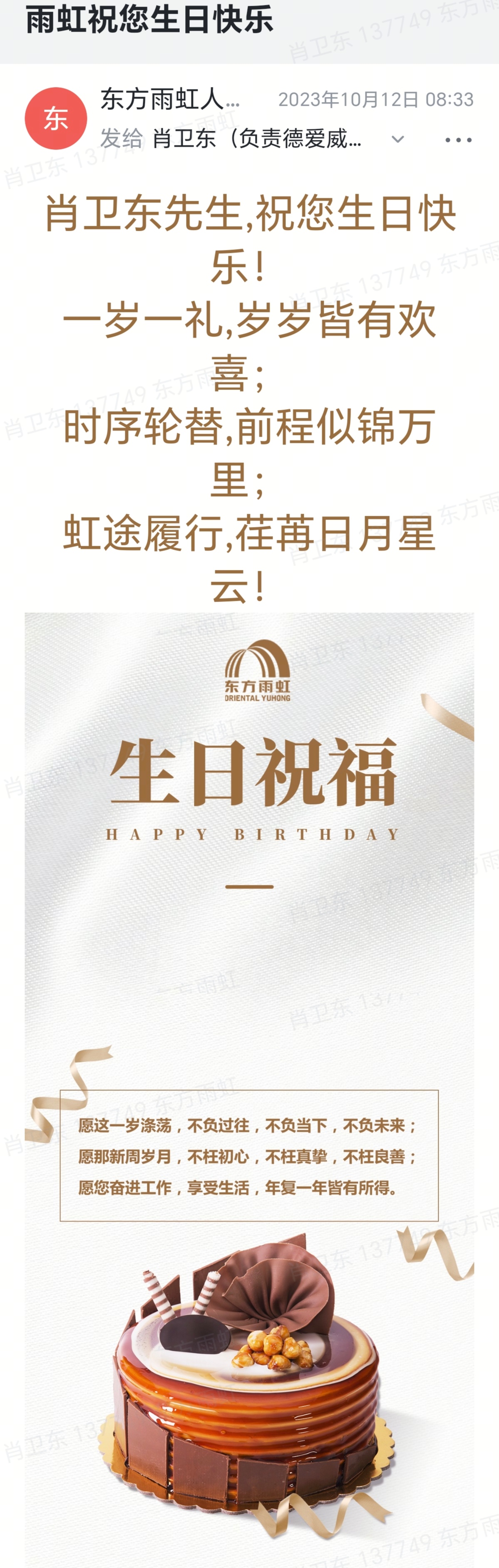 2023年10月12日,西宁的秋雨淅沥,高原的风裹着寒意扑面而来。早晨手机屏幕突然亮起竟然是公司发的生日祝福。那一刻,冰凉的雨丝仿佛被暖意驱散。回想自己2020年加入东方雨虹,是我人生最庆幸的选择。这里像家一样温馨,尊重与关怀渗透在每一处细节,这份温暖的生日祝福成了雨天里最明亮的底色。