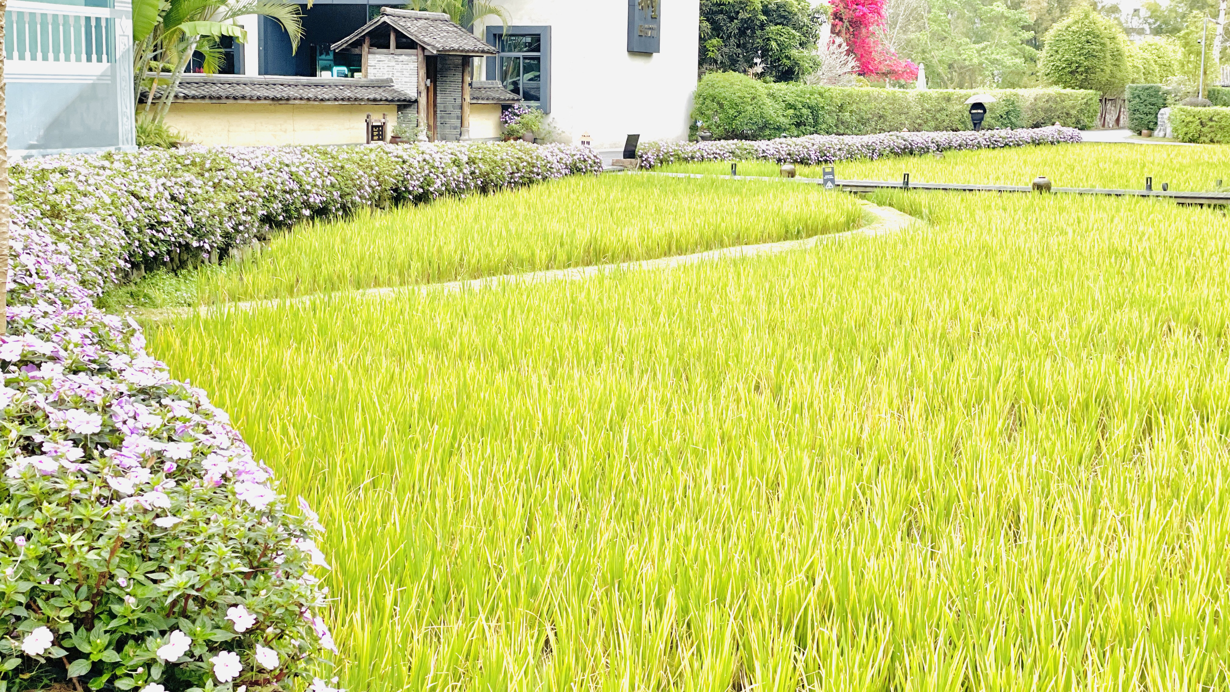 这是自然与人文的共生。稻田代表着土地的生机与农耕的本真,花径则是精心营造的诗意美学,背景的建筑是现代生活的介入。三者交织,构成了一幅“人类与自然和谐共生”的当代图景。