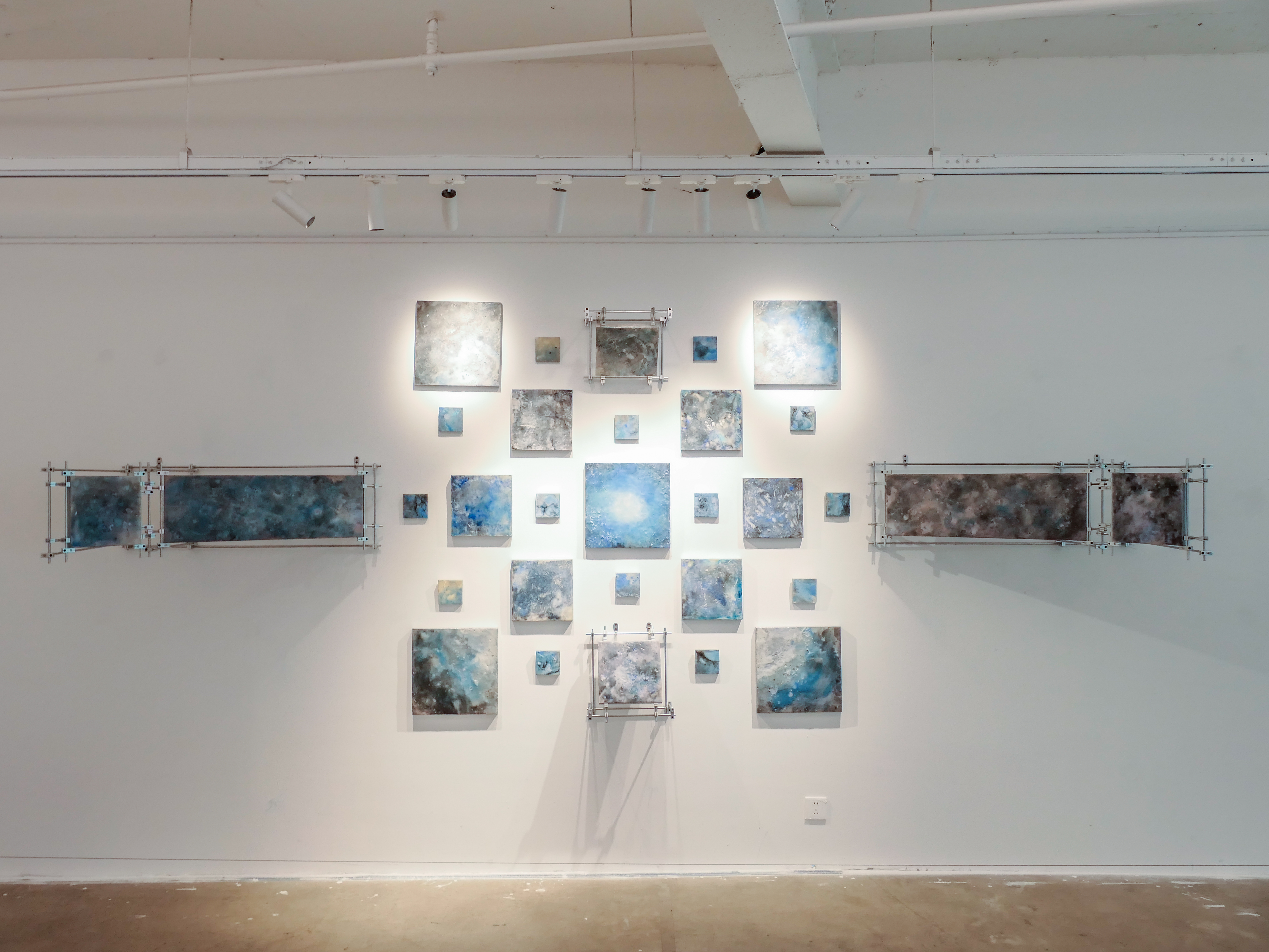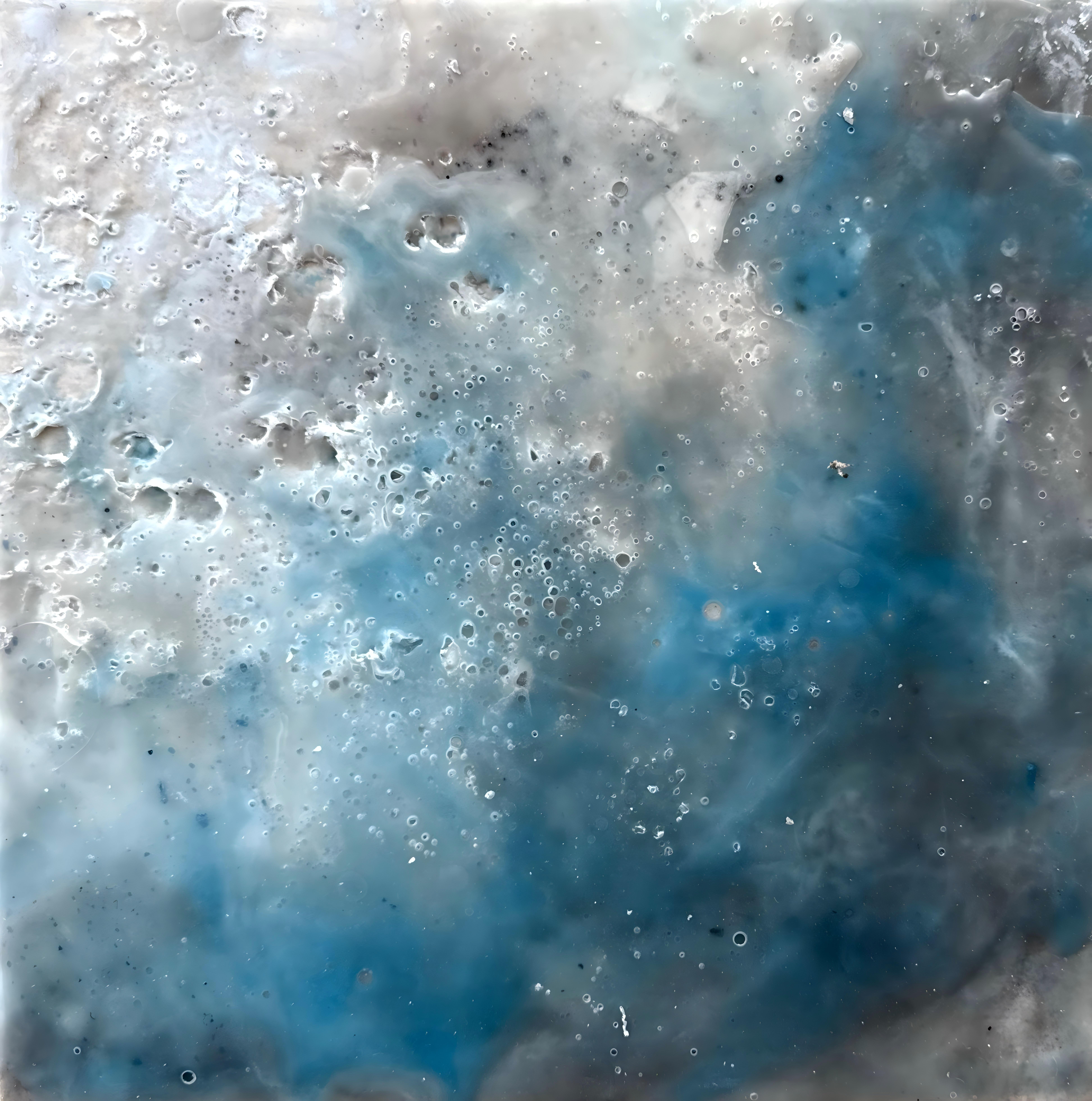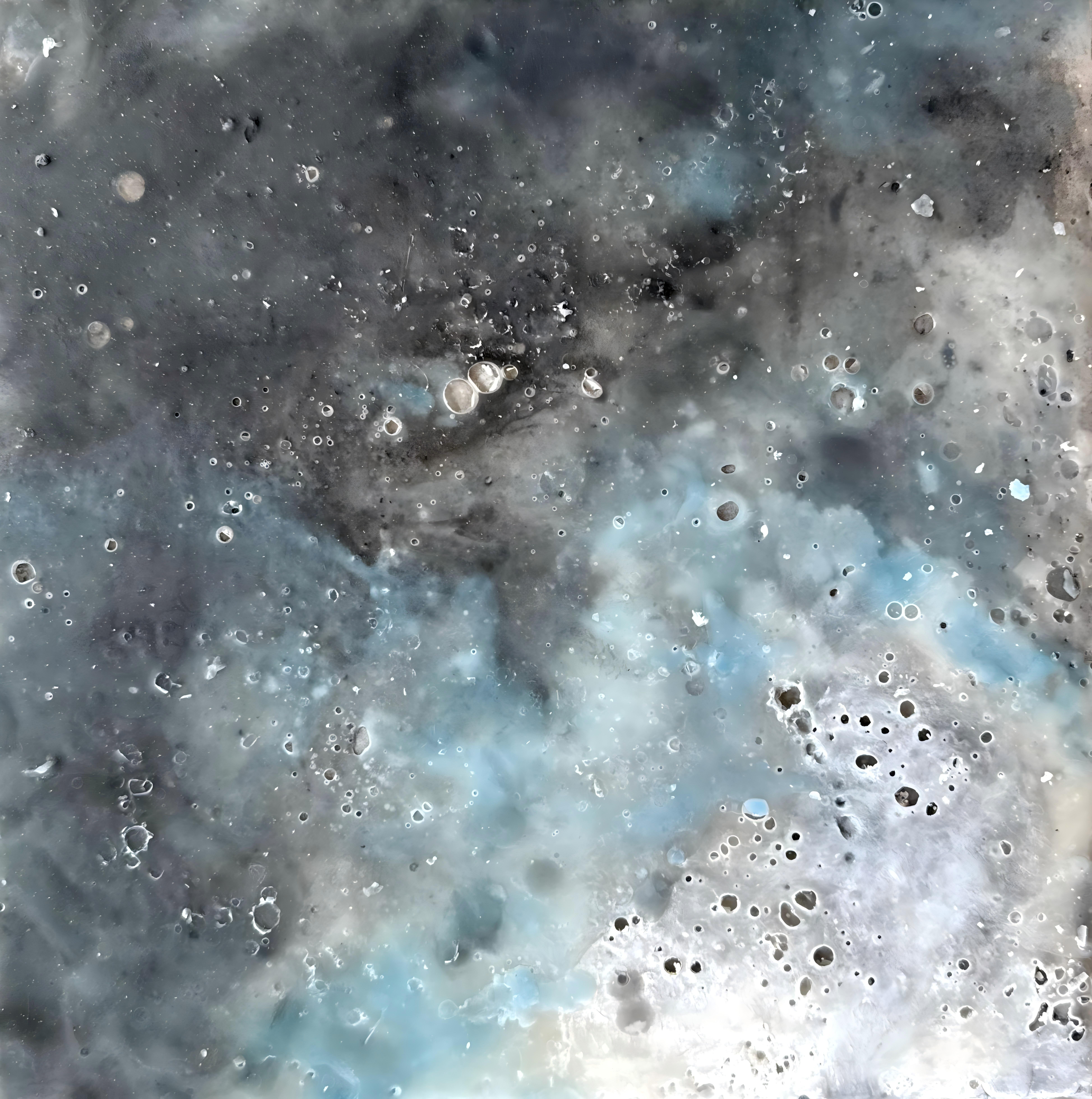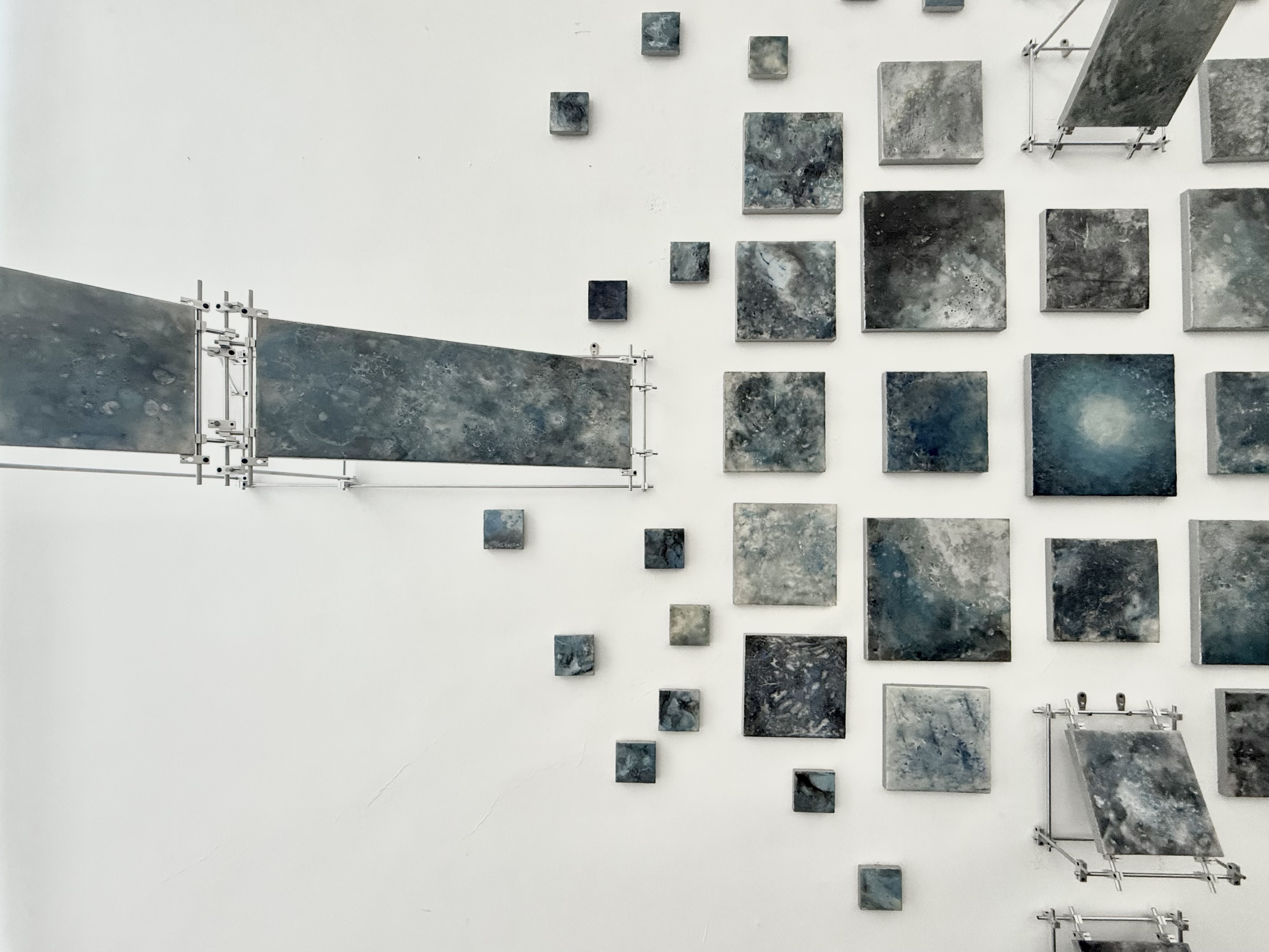作品设计思路简述 (300字左右): 月亮自古以来便是人类情感与文化的多元载体,它于神话、诗歌、科学以及日常生活中不断衍生出新的意义。本作品以月亮这一跨越文化与时代的意象为核心,借助综合材料绘画探寻情绪、自然与科技之间的全新关联。在粤港澳大湾区这样开放的环境里,潮汐的节奏、月亮的亮光与青年的情绪紧密交织。创作时运用综合材料的模糊特质与叠加效果,结合金属框架营造半立体的三维视觉结构,使画面在展现月亮这一共同记忆的同时,也象征着科技与艺术的相互依存、共同发展。希望让观者在观赏过程中自行解读图像的意义,而非进行直接的叙事性表达——正如湾区文化以多元、包容与碰撞为动力,让每一种创造力都能在其中蓬勃生长。