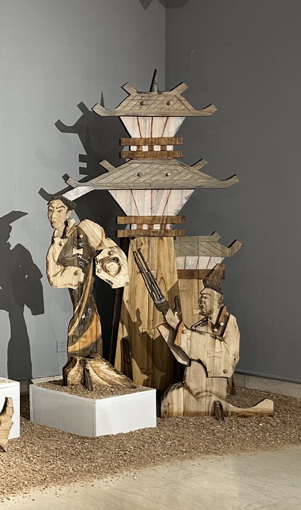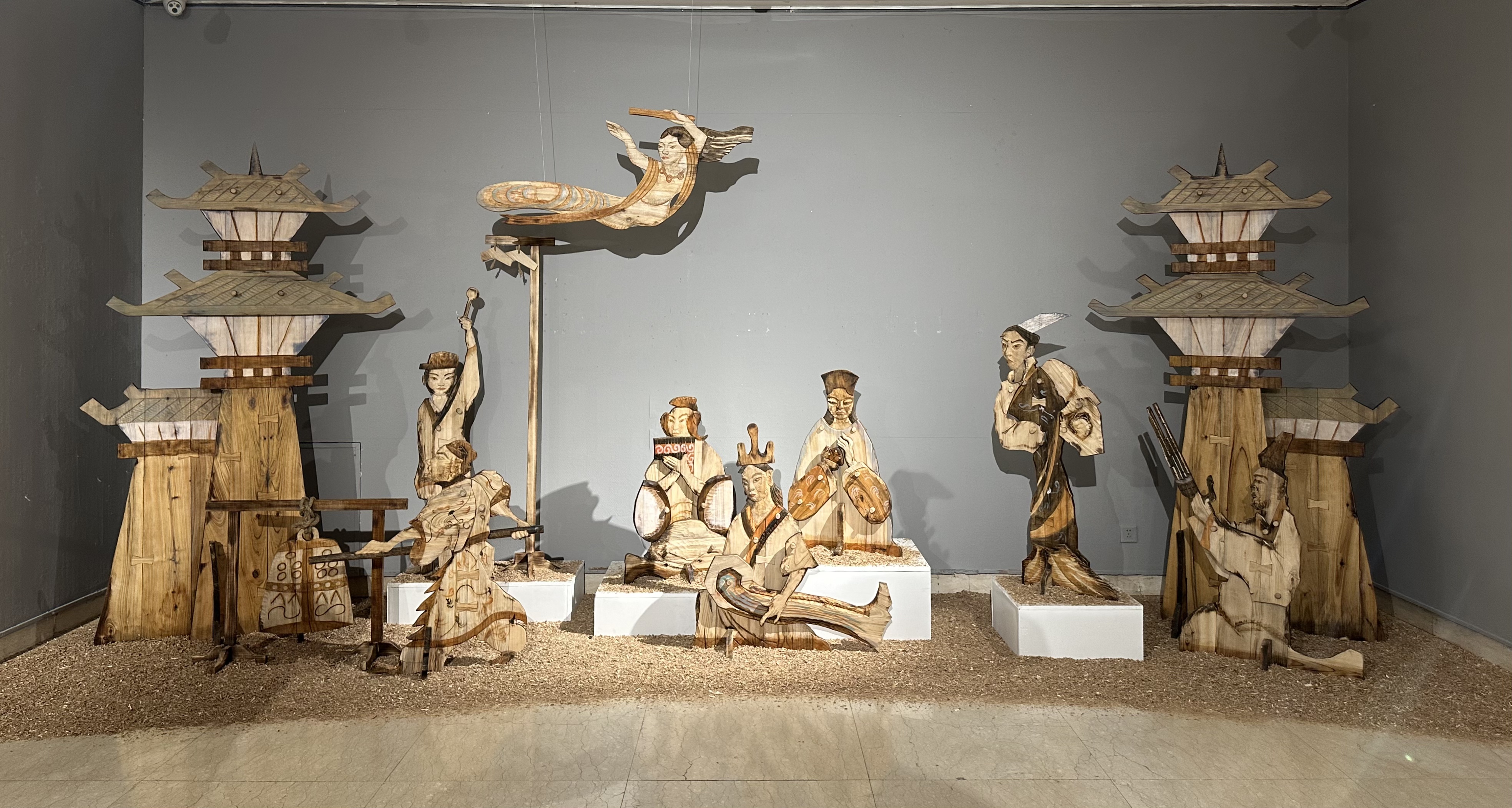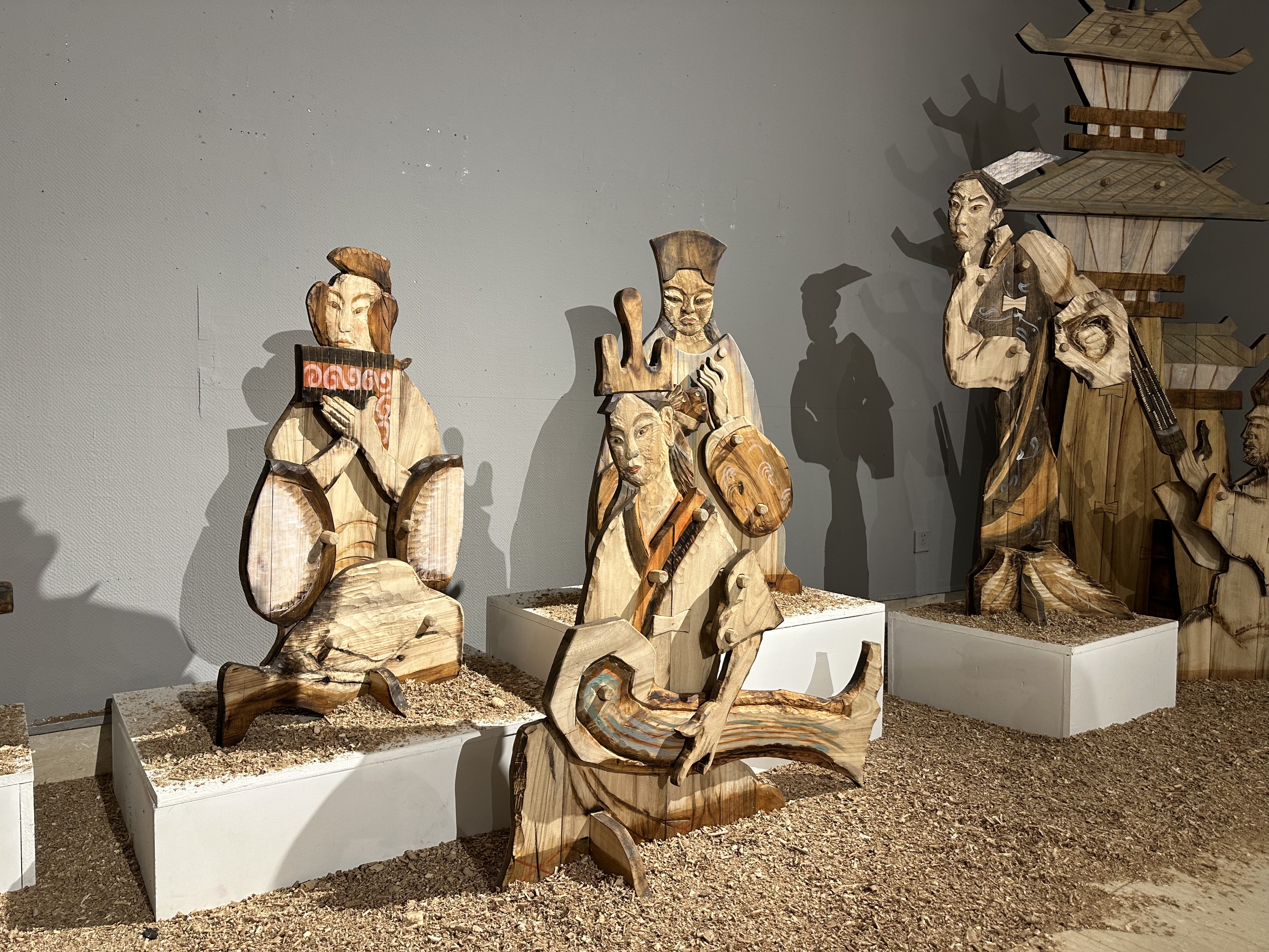作品设计思路简述 (300字左右): 将商周礼乐文化转化为当代雕塑语言,恰如粤港澳大湾区“传统根脉+现代创新”的文化基因,人物的服饰纹理藏着广府木雕的细腻肌理,楼阁的榫卯结构暗合湾区“同根共构”的城市联结;进一步揭示音乐文化与雕刻艺术在审美观念、符号象征及哲学思想上的融合,进而探索传统造型语言在当代创作中的创新性转化。打破静态、增添浪漫,复刻古建制式,强化历史厚重之感。以人物形态、乐器形制,传递“礼乐相和”的文化内涵,让观者聆听跨时空的“木韵古律”。礼乐场景既呼应岭南千年商贸文明里的“和乐共生”,也隐喻湾区当下多元文化的交融共振——就像不同木雕构件咬合出完整叙事,湾区城市群也以协作共生生长出独特活力。