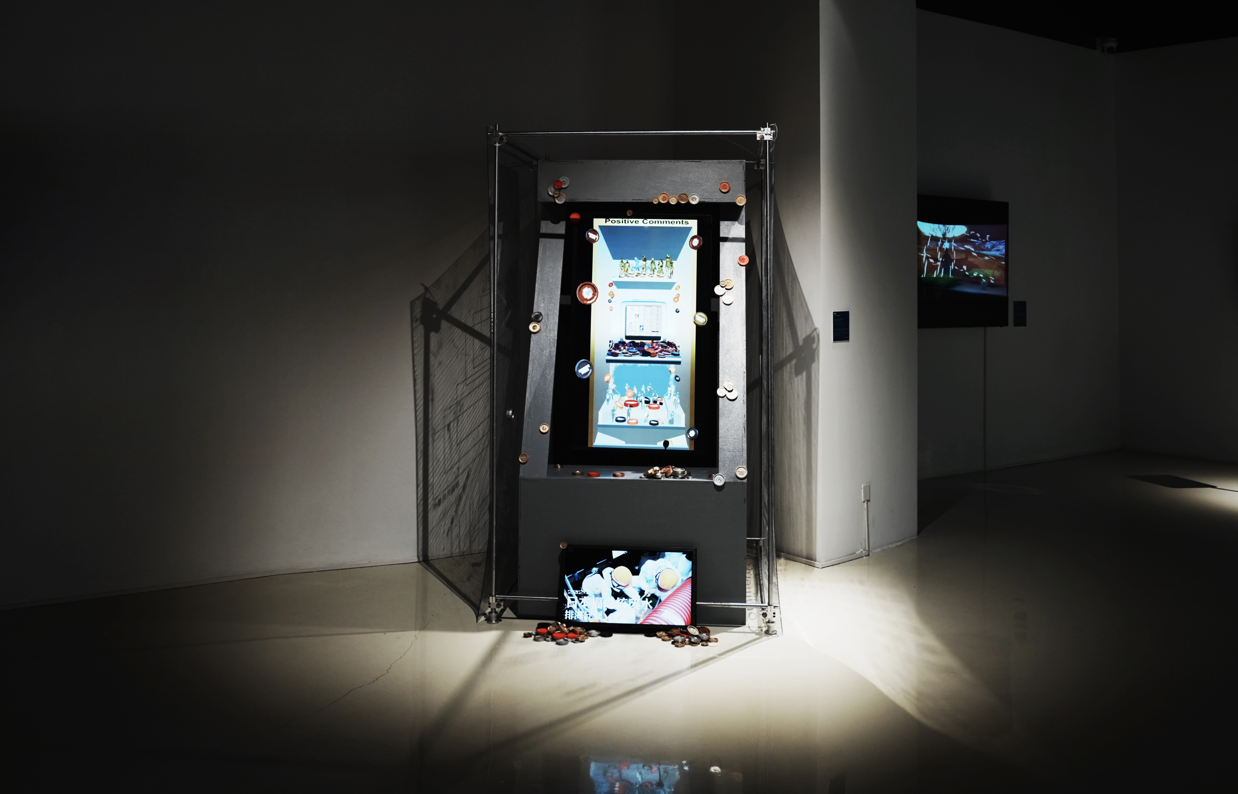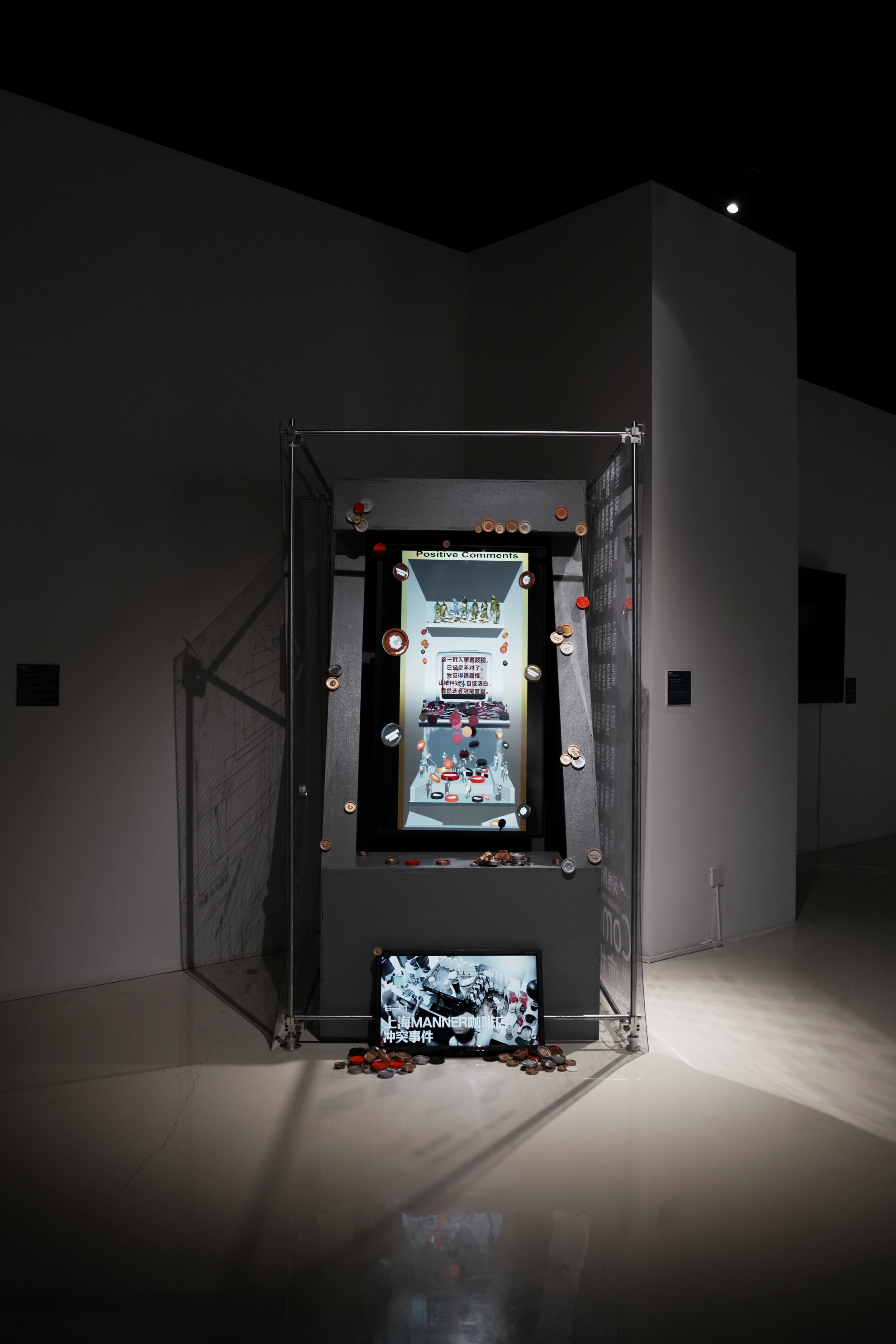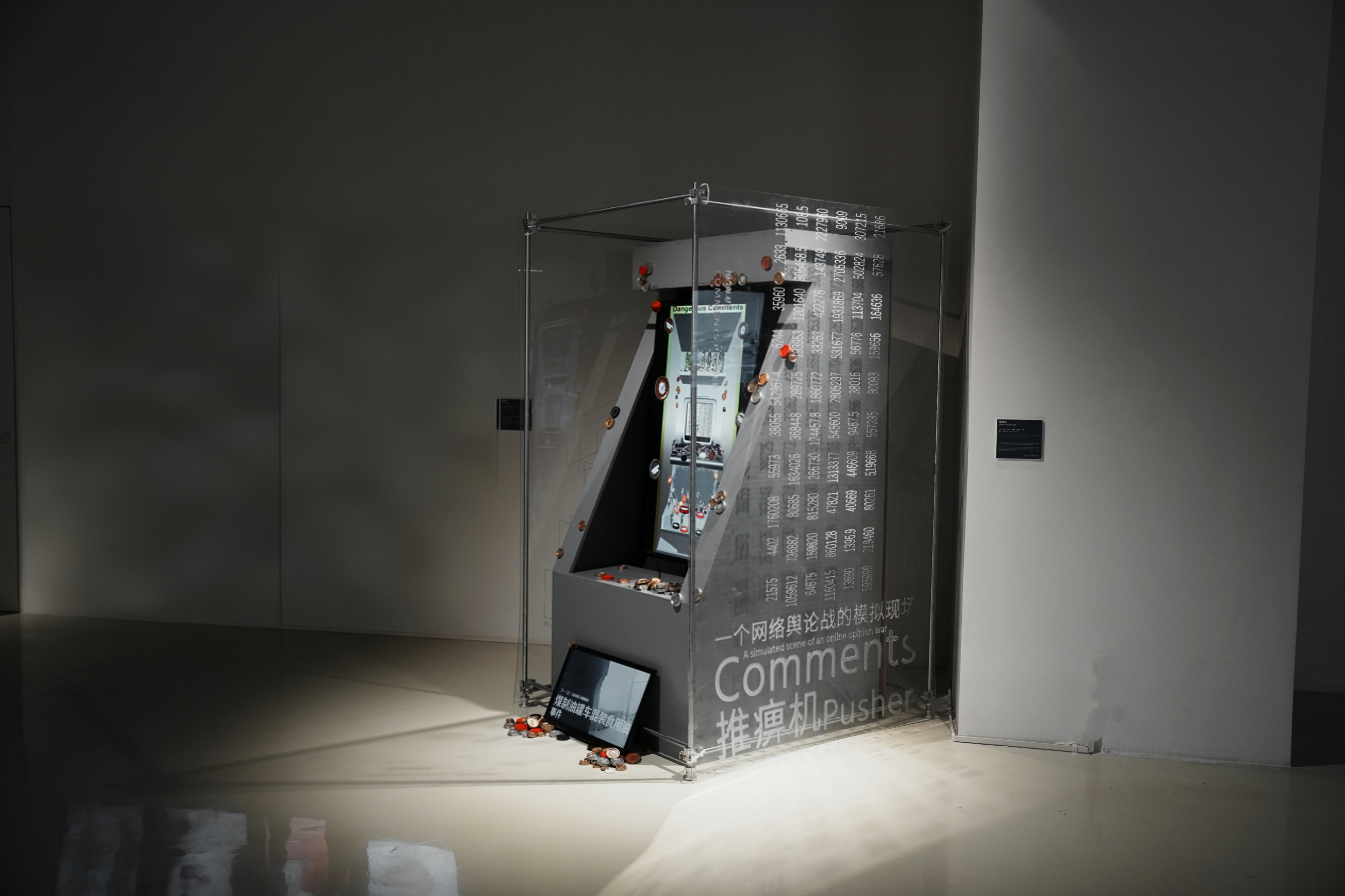 作品设计思路简述 (300字左右): 《Comments Pusher》是一件以“社交媒体情绪计算”为核心的互动装置,通过模拟传统投币机机制,重构数字时代公共舆论的生成、堆积与崩塌过程。系统实时采集观众的语音评论与线上热点话题文本,并通过情感计算模型对其进行情绪识别与强度评分。当情绪值不断累积,装置中的虚拟或实体“硬币”随之触发级联下落,形成可视化的“舆论推动”效果。观众的每一次发声,既是个人表达,也是推动整体舆论流动的关键变量。随着情绪不断叠加,讨论迅速攀升、失控、坍塌,直至被新的话题所取代,构成一场循环往复的数字意见景观。作品以模拟“推币机”娱乐化的机器结构包裹情绪数据的真实重量,将点赞、转发、评论等看似轻微的行为转化为具有物理冲击力的可视事件,揭示算法、媒体与公众情绪之间相互裹挟的关系,引导观众反思自身在数字舆论系统中的责任与位置——并以“CAM”组成临时艺术家团队,在韩国国家艺术中心展出。