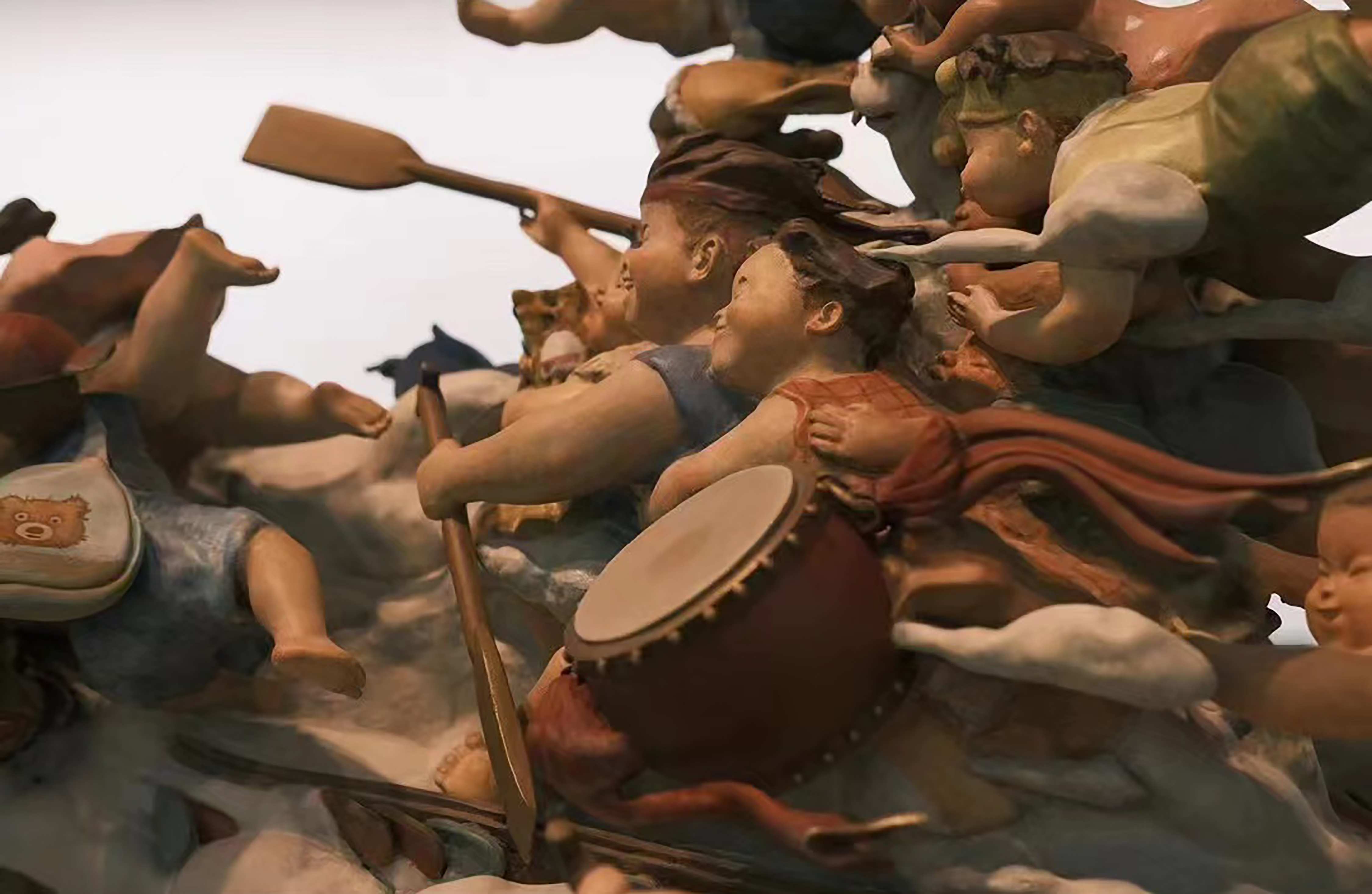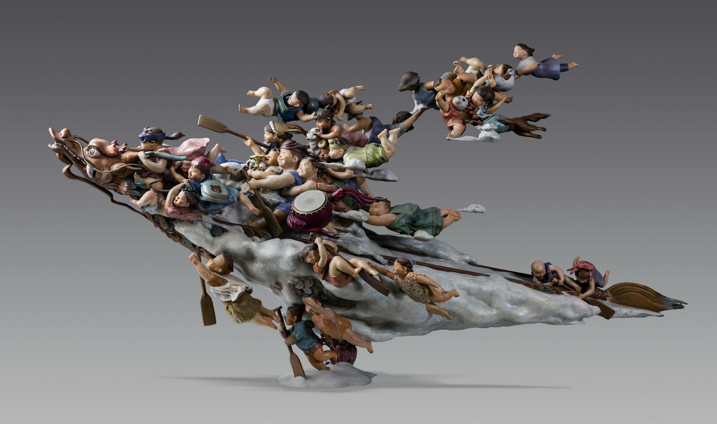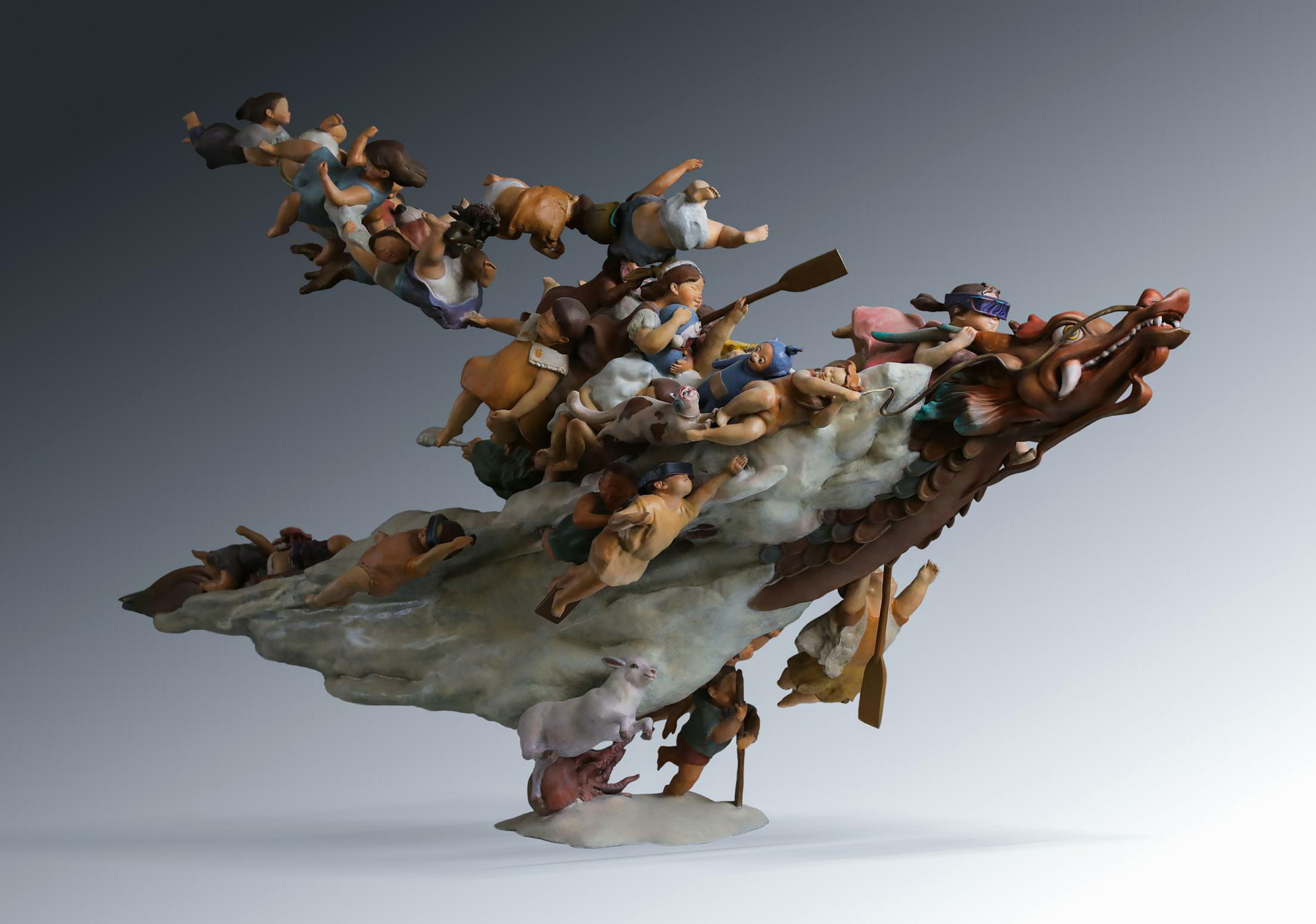 作品设计思路简述 (300字左右): 龙舟文化是中华民族的精神图腾,龙舟总能唤起人们内心深处的民族之魂。团队协作、守望相助、奋勇争先、力争上游的龙舟精神是爱国主义与集体主义精神的体现。借以“中国龙舟之乡”、“龙舟文化之乡”的岭南意蕴文化,运用超越现实的表现手法表达对自然,对龙舟的敬畏和崇拜。作品也以自身的憧憬作为灵感源泉,“乘风破浪”、“飞云踏海”、“劈波前行”是作品的潜台词,“超越现实”、“向未来”是作品追求的意境。对现实生活的思考以及对理想世界的向往是作品的主要理念。