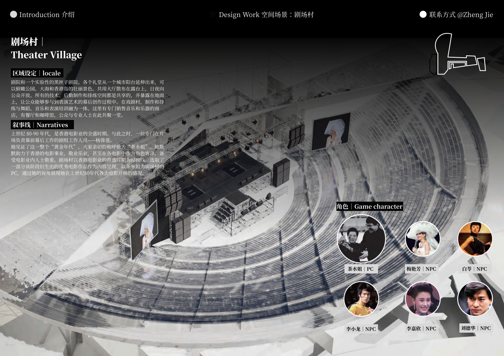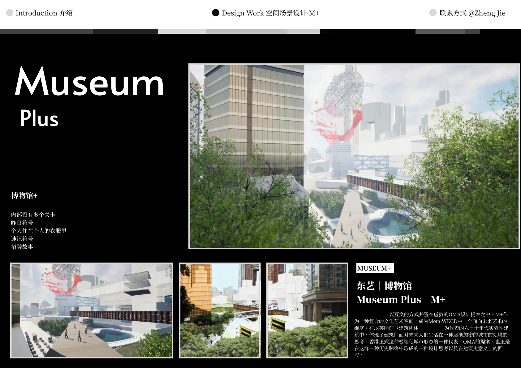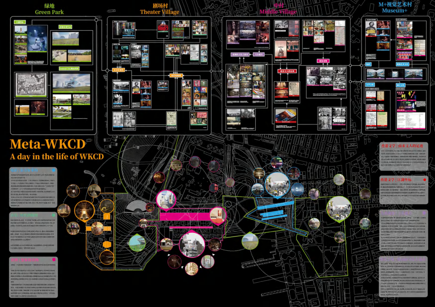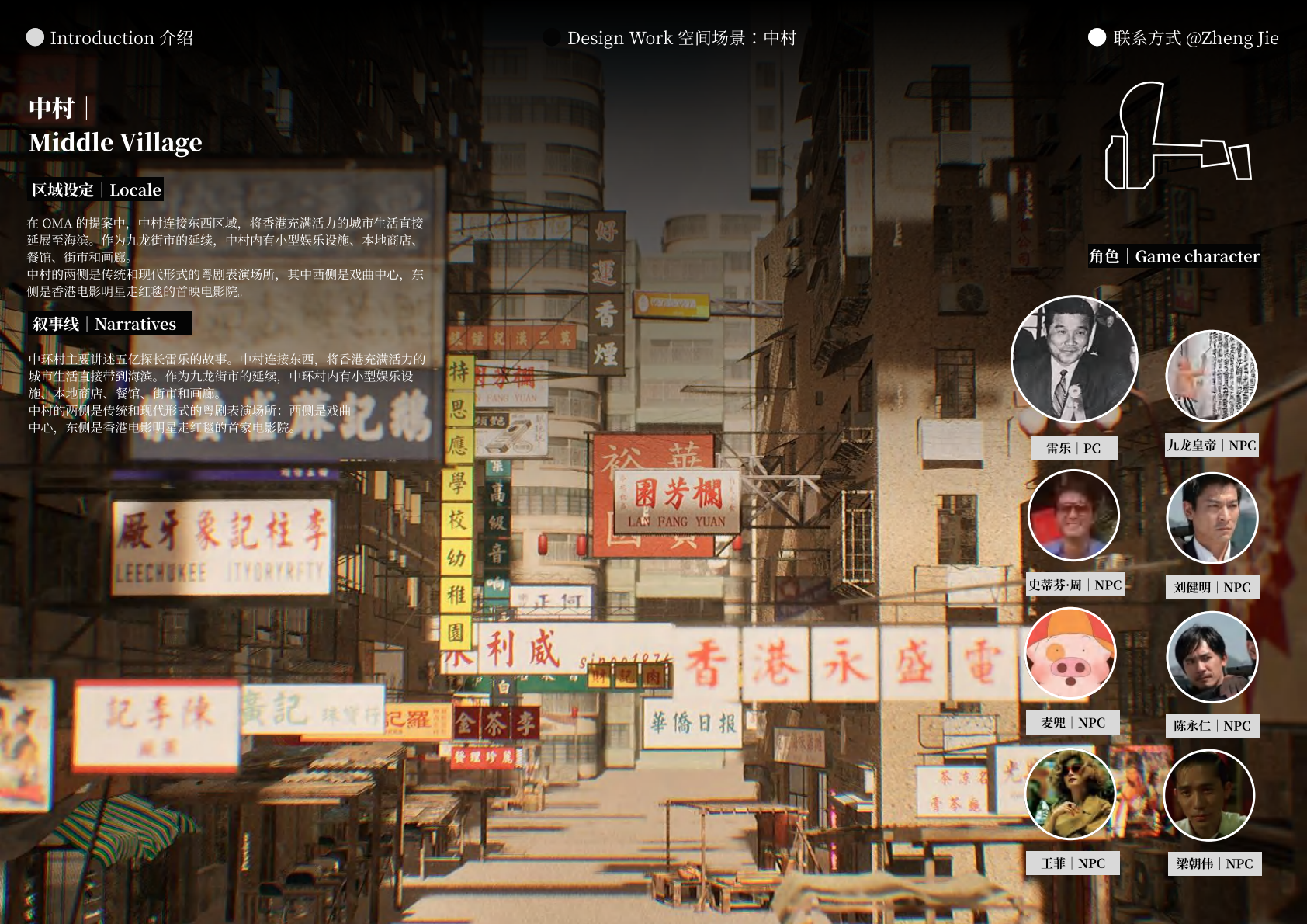 作品设计思路简述 (300字左右): Meta-WKCD 是 OMA 2009 年西九设计方案的虚拟空间叙事。该叙事旨在为方案中的四类空间,即剧院村、中村、M+和公共绿地,分别组织多重叙事。 一方面,我们将建筑史上的空间设计策略引入到 OMA-WKCD 空间设计方案的细节中,同时,我们尝试将香港电影中虚构的场景和人物以及香港历史上真实的场景和事件放入虚拟场景中,形成一个虚实交织的叙事网络。