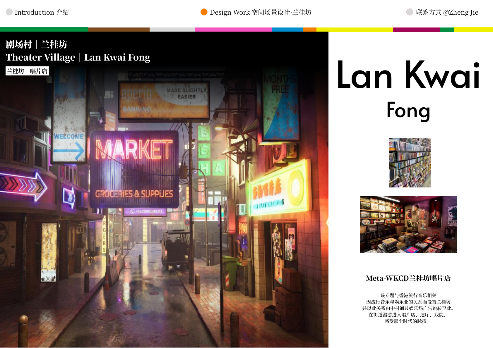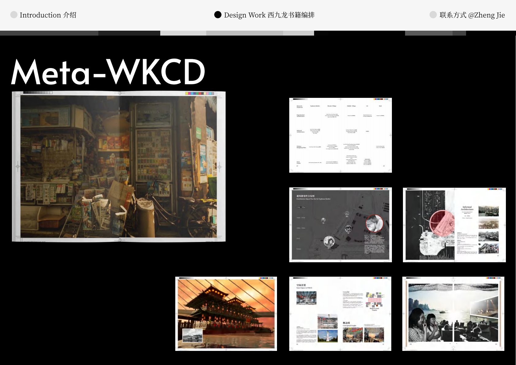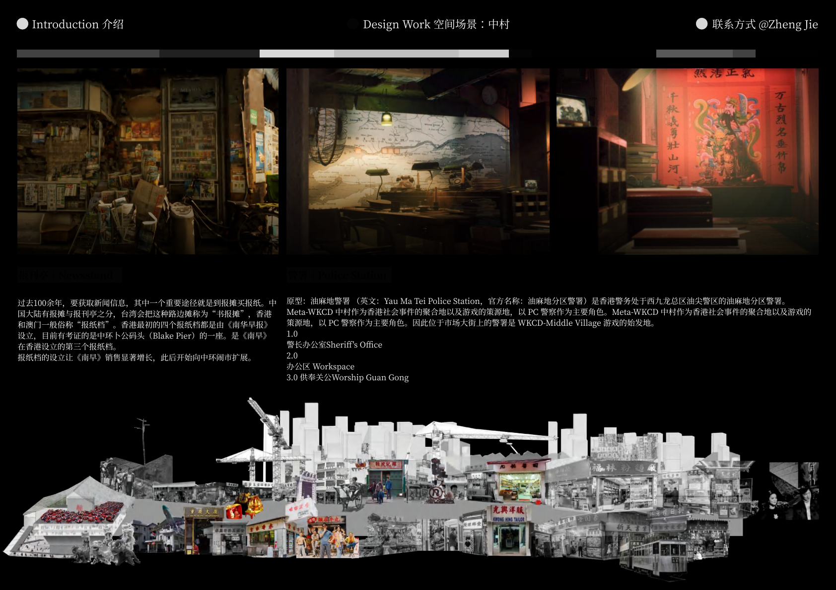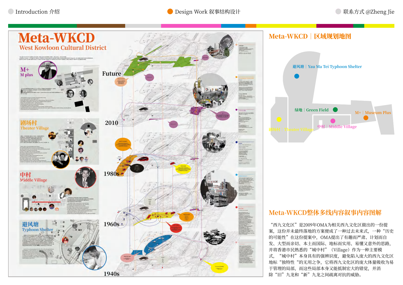 作品设计思路简述 (300字左右): Meta-WKCD 是 OMA 2009 年西九设计方案的虚拟空间叙事。该叙事旨在为方案中的四类空间,即剧院村、中村、M+和公共绿地,分别组织多重叙事。 一方面,我们将建筑史上的空间设计策略引入到 OMA-WKCD 空间设计方案的细节中,同时,我们尝试将香港电影中虚构的场景和人物以及香港历史上真实的场景和事件放入虚拟场景中,形成一个虚实交织的叙事网络。