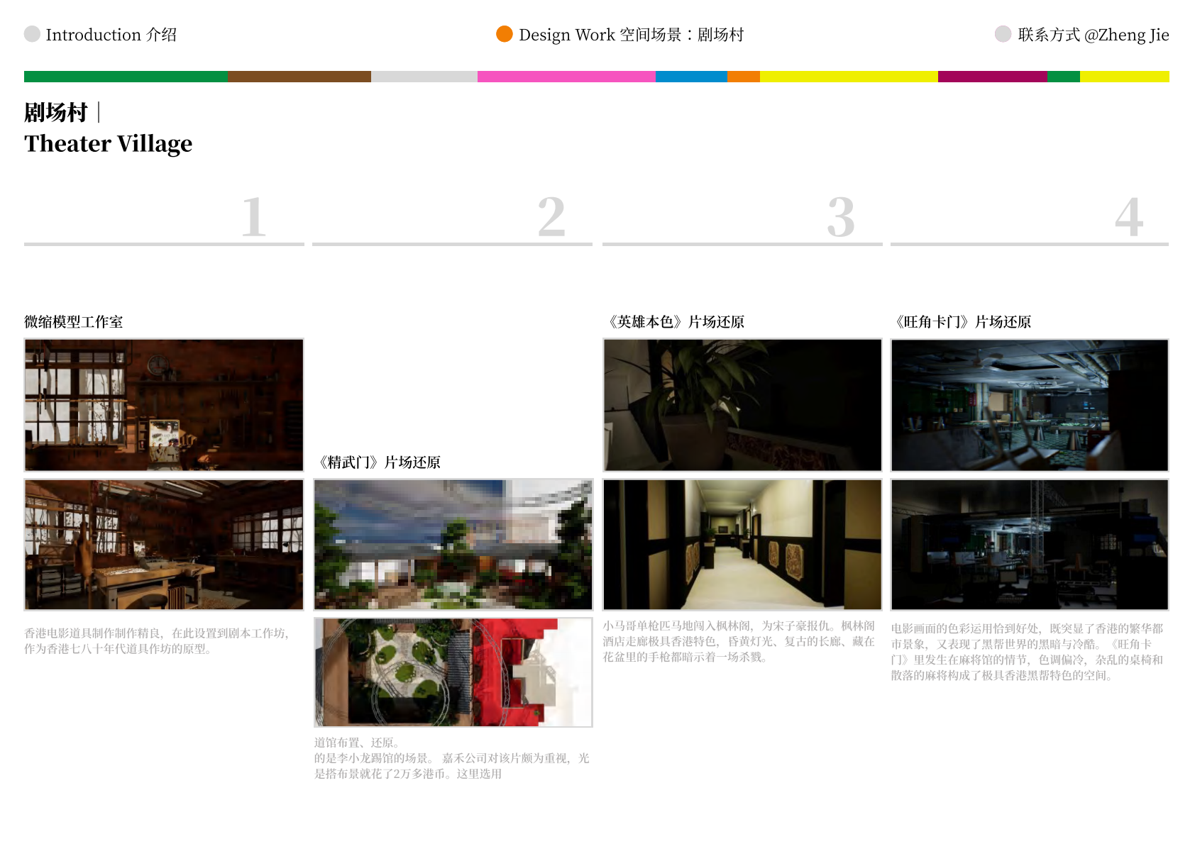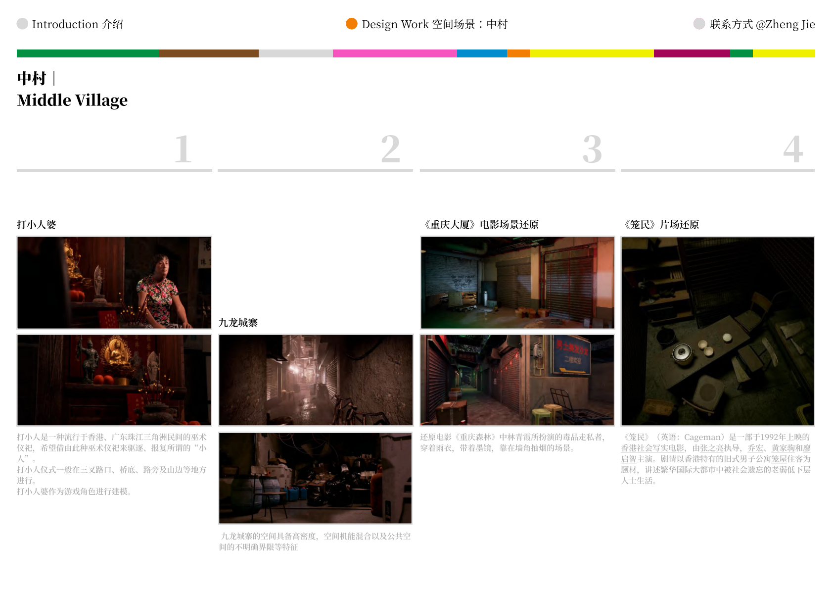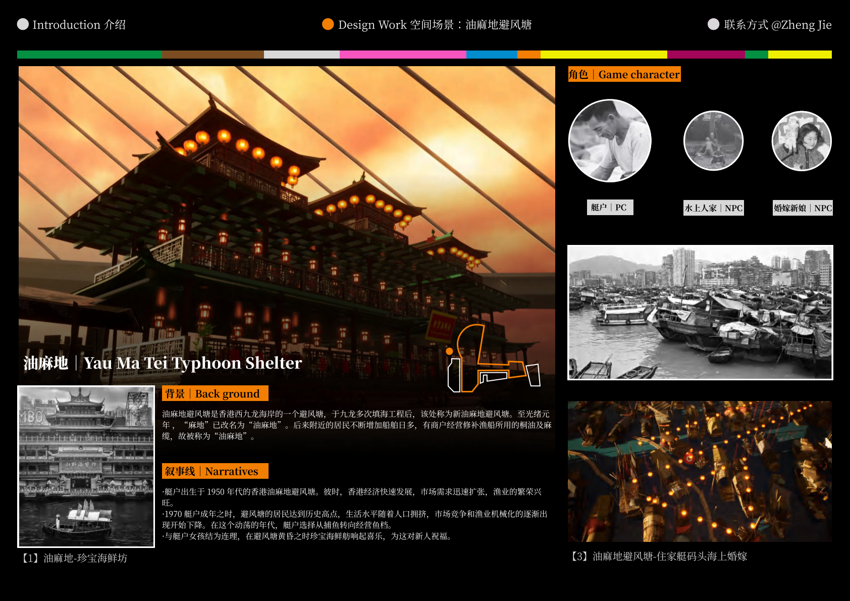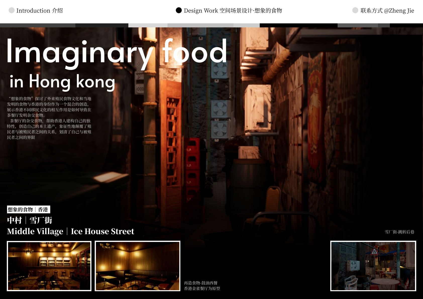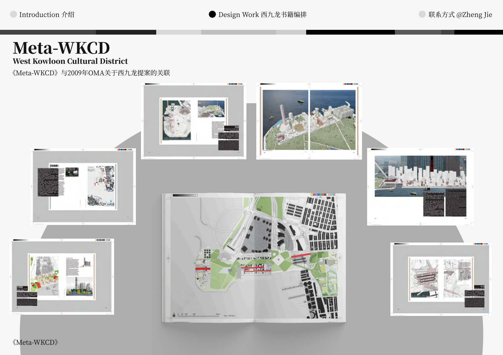 作品设计思路简述 (300字左右): Meta-WKCD 是 OMA 2009 年西九设计方案的虚拟空间叙事。该叙事旨在为方案中的四类空间,即剧院村、中村、M+和公共绿地,分别组织多重叙事。 一方面,我们将建筑史上的空间设计策略引入到 OMA-WKCD 空间设计方案的细节中,同时,我们尝试将香港电影中虚构的场景和人物以及香港历史上真实的场景和事件放入虚拟场景中,形成一个虚实交织的叙事网络。