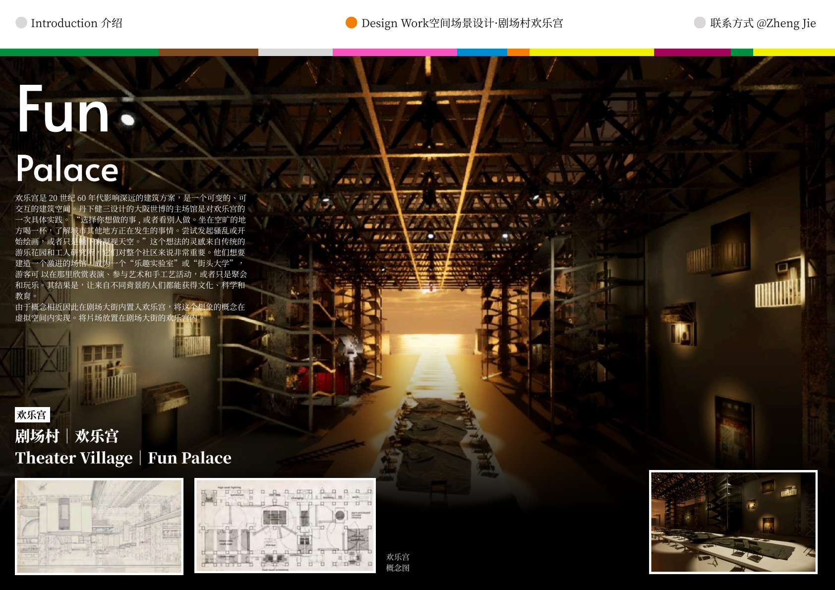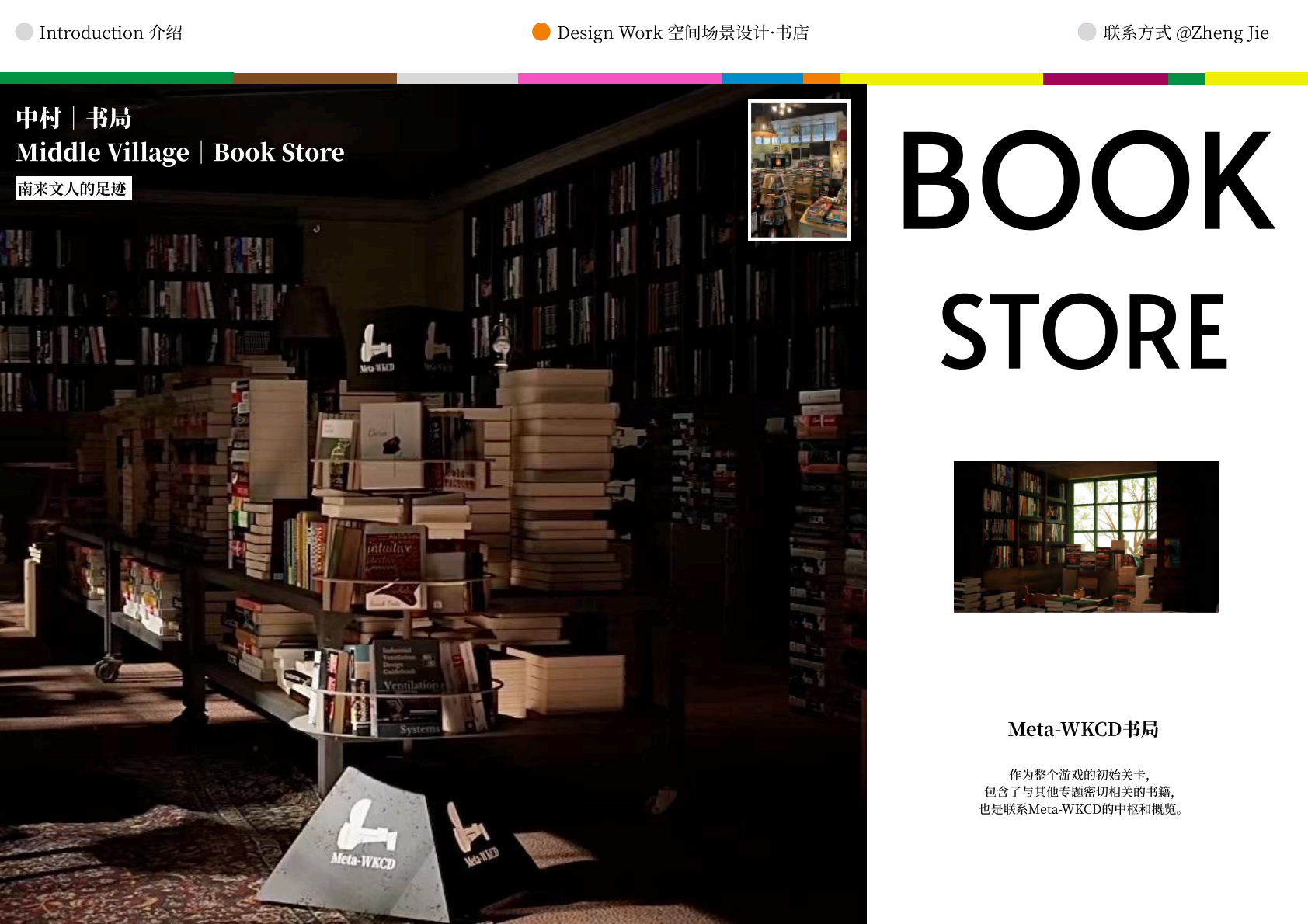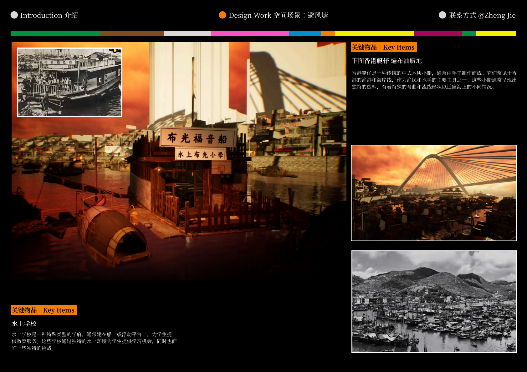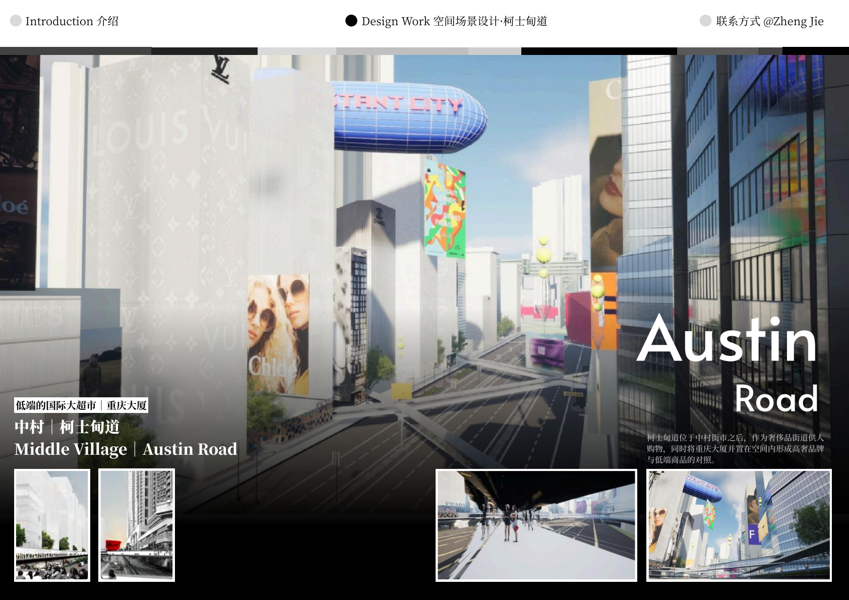 作品设计思路简述 (300字左右): Meta-WKCD 是 OMA 2009 年西九设计方案的虚拟空间叙事。该叙事旨在为方案中的四类空间,即剧院村、中村、M+和公共绿地,分别组织多重叙事。 一方面,我们将建筑史上的空间设计策略引入到 OMA-WKCD 空间设计方案的细节中,同时,我们尝试将香港电影中虚构的场景和人物以及香港历史上真实的场景和事件放入虚拟场景中,形成一个虚实交织的叙事网络。