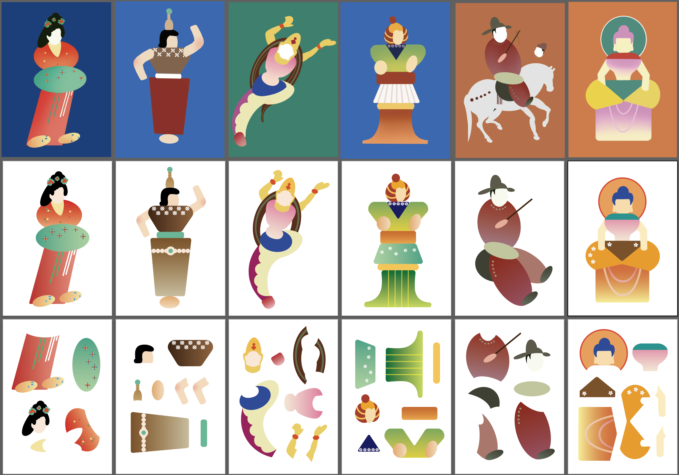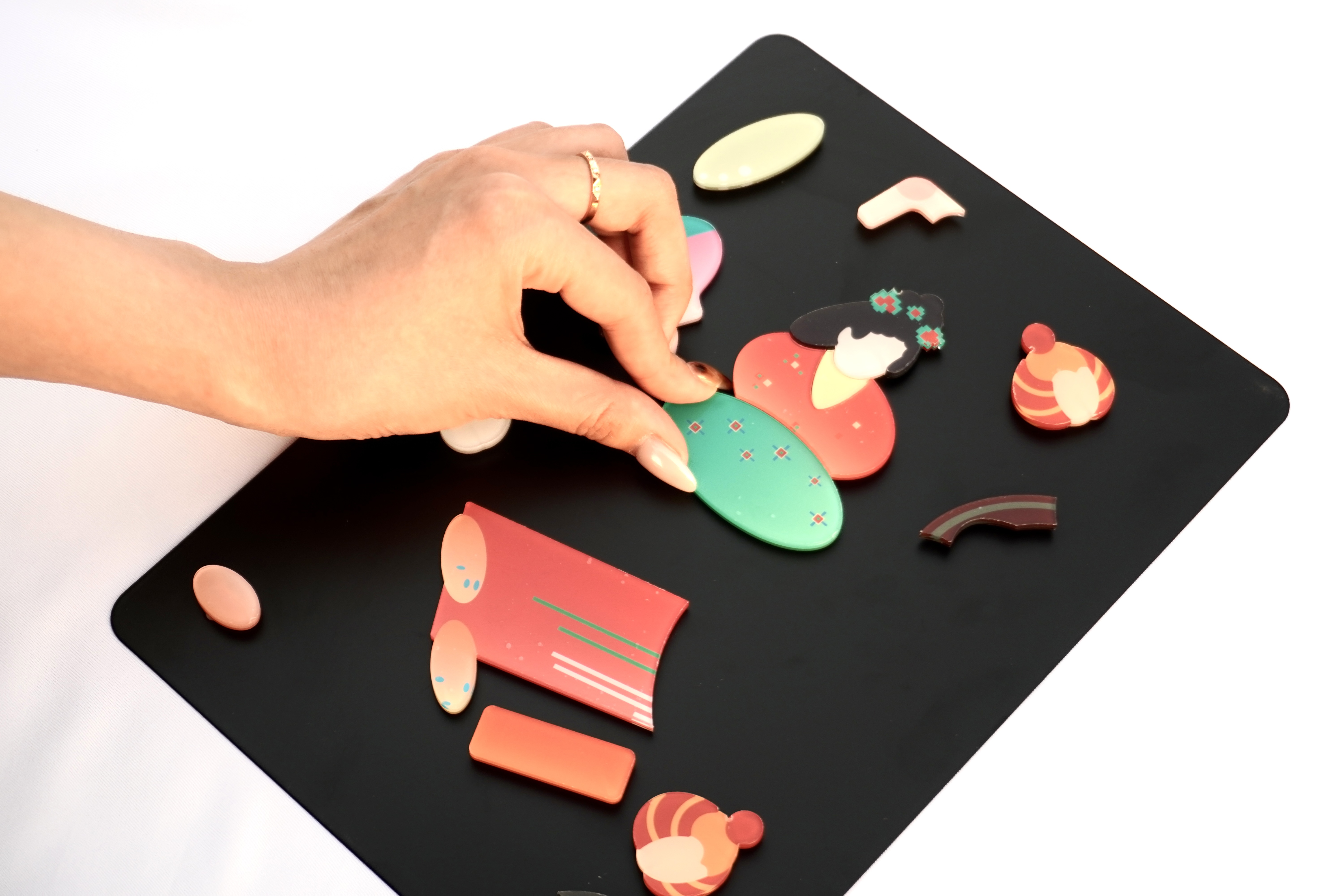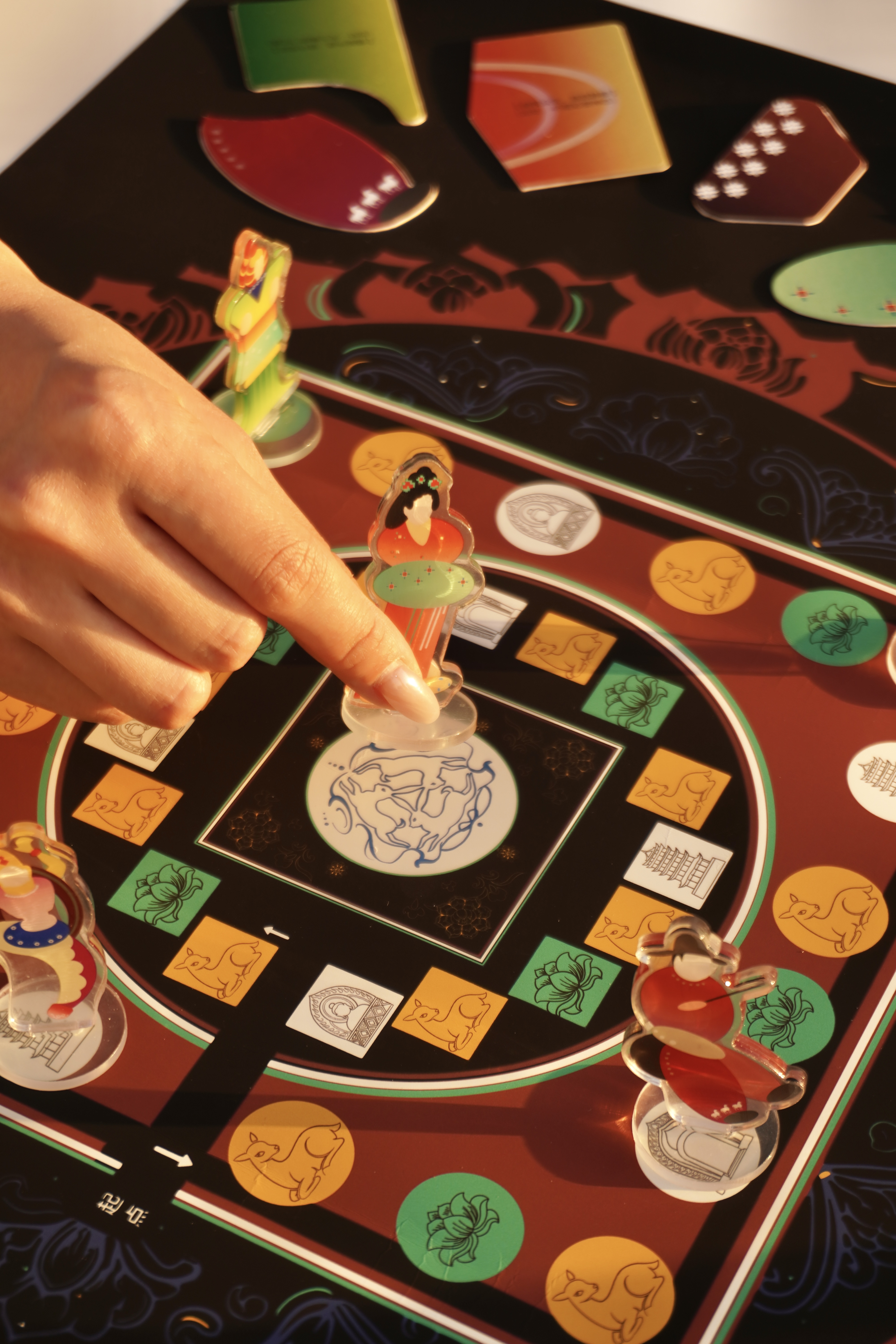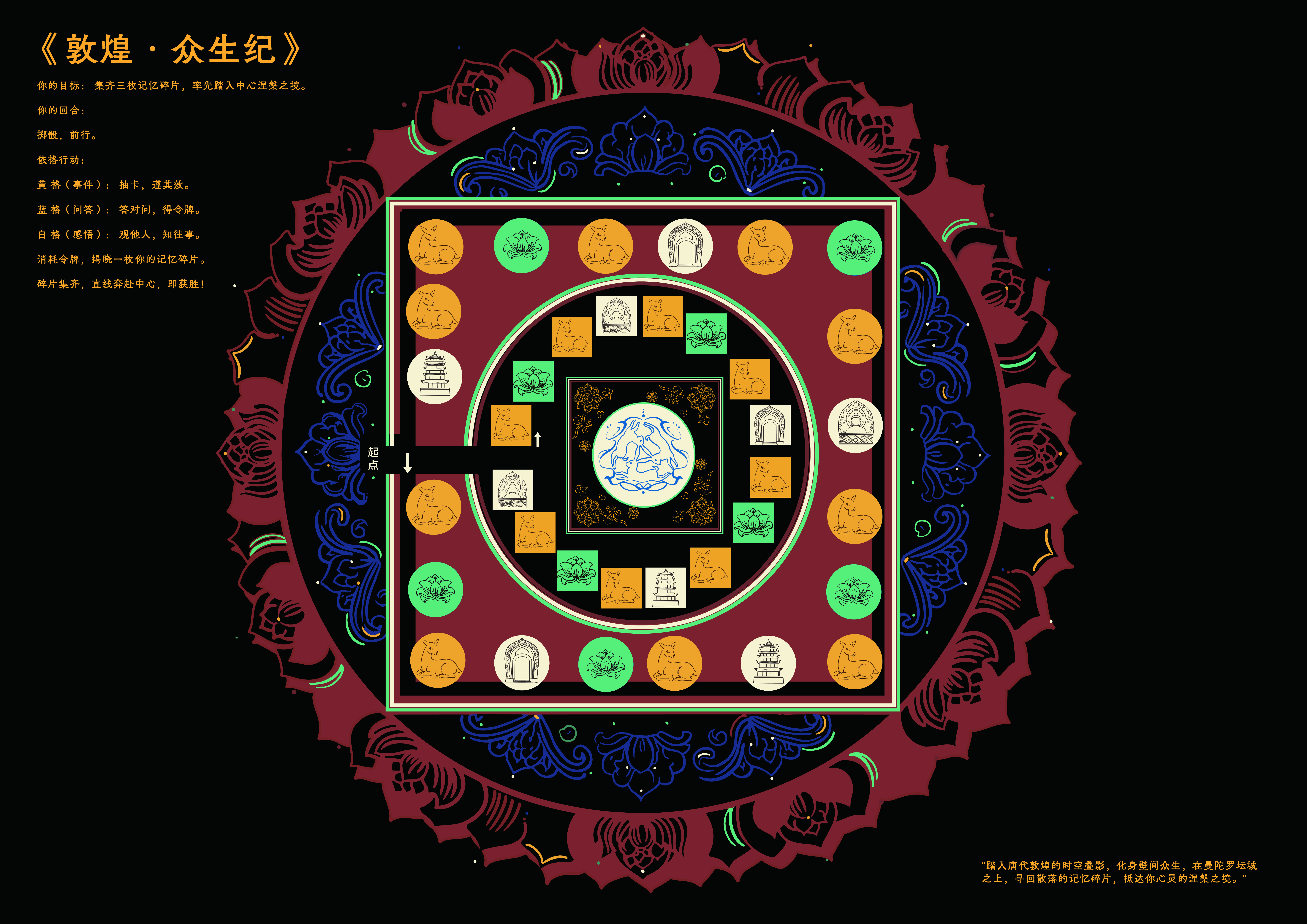 作品设计思路简述 (300字左右): “观我生,进退。” 出自《周易·观卦》意为“观察我的生命、我的生活轨迹”。本剧场是一场跨越千年的对望。我们以现代、童趣的扁平视觉,历史问答的趣味形式,重启敦煌壁画的古老卷轴。用户不再是静默的观众,而是从旁观者,到主演者,最终成为共创者,在一幕幕递进的剧情中,亲自观察、体验并续写敦煌人物的生命故事,完成一场从“观其生”到“观我生”的文化沉思。 我们将壁画中的视觉要素分解为三类基础模块:形态模块、色彩模块、纹样模块。每个模块都经过现代设计手法的规整化处理,形成可灵活组合的视觉单元。 产品序列对应着三种应用场景:冰箱贴展示模块的解构与重组逻辑,棋盘游戏构建模块的叙事性交互,DIY材料包提供模块的开放式创作。整个过程遵循“分析-理解-运用”的认知路径。 设计的价值在于构建了一套可操作的转译机制。它既保留了敦煌艺术的视觉基因,又提供了符合现代人认知习惯的表达形式。用户通过这套机制,能够完成从文化感知到自主表达的完整过程。