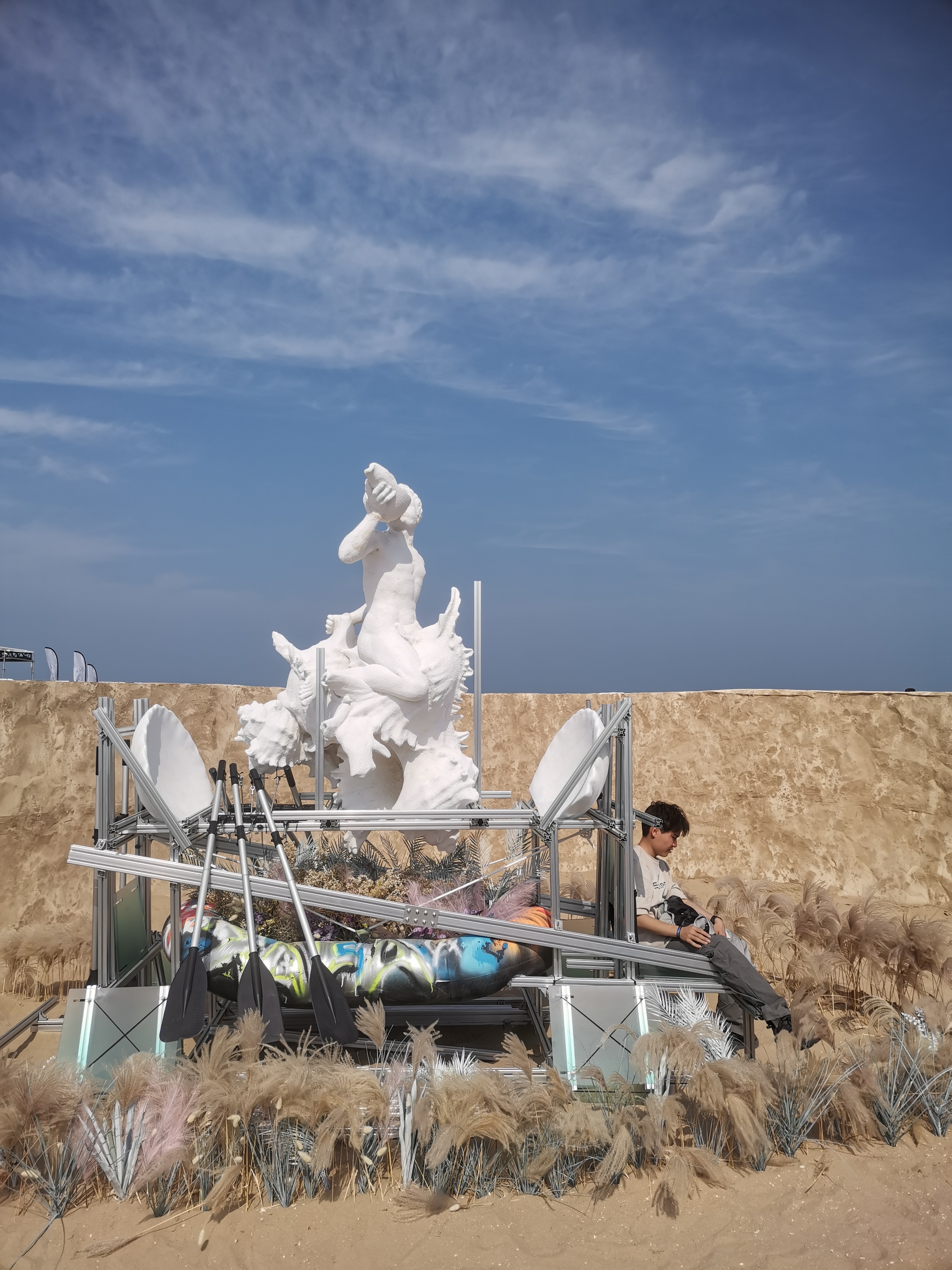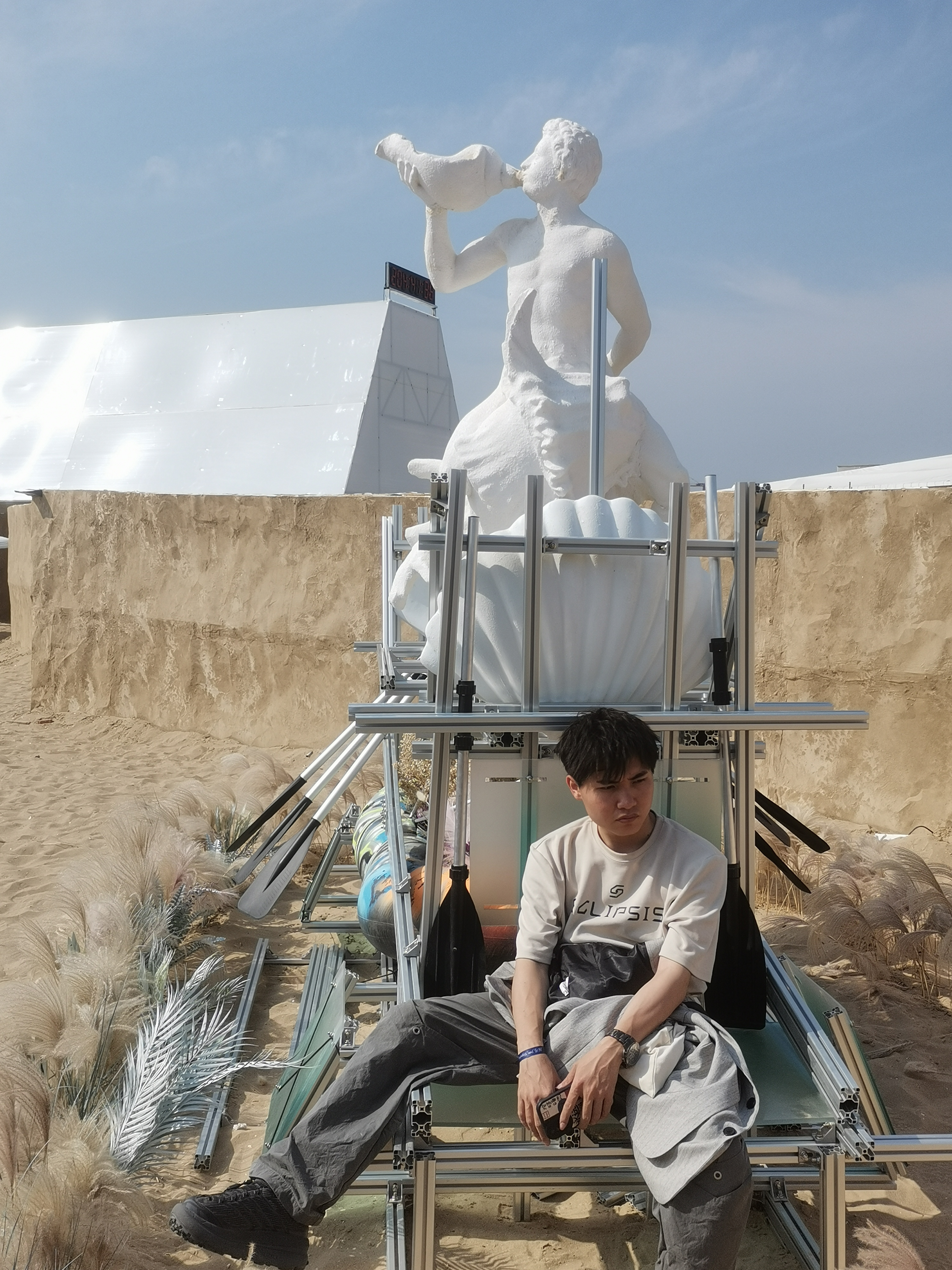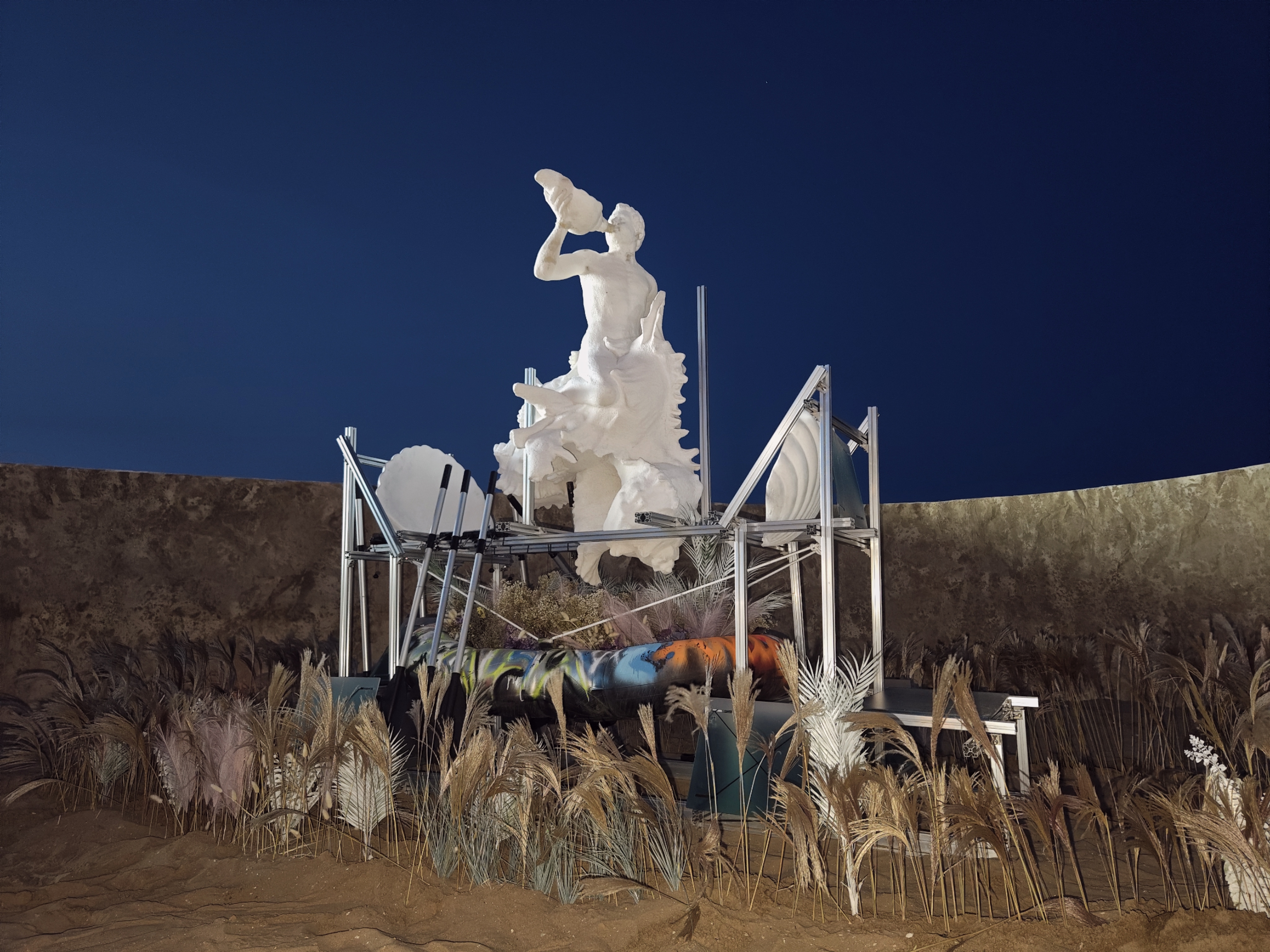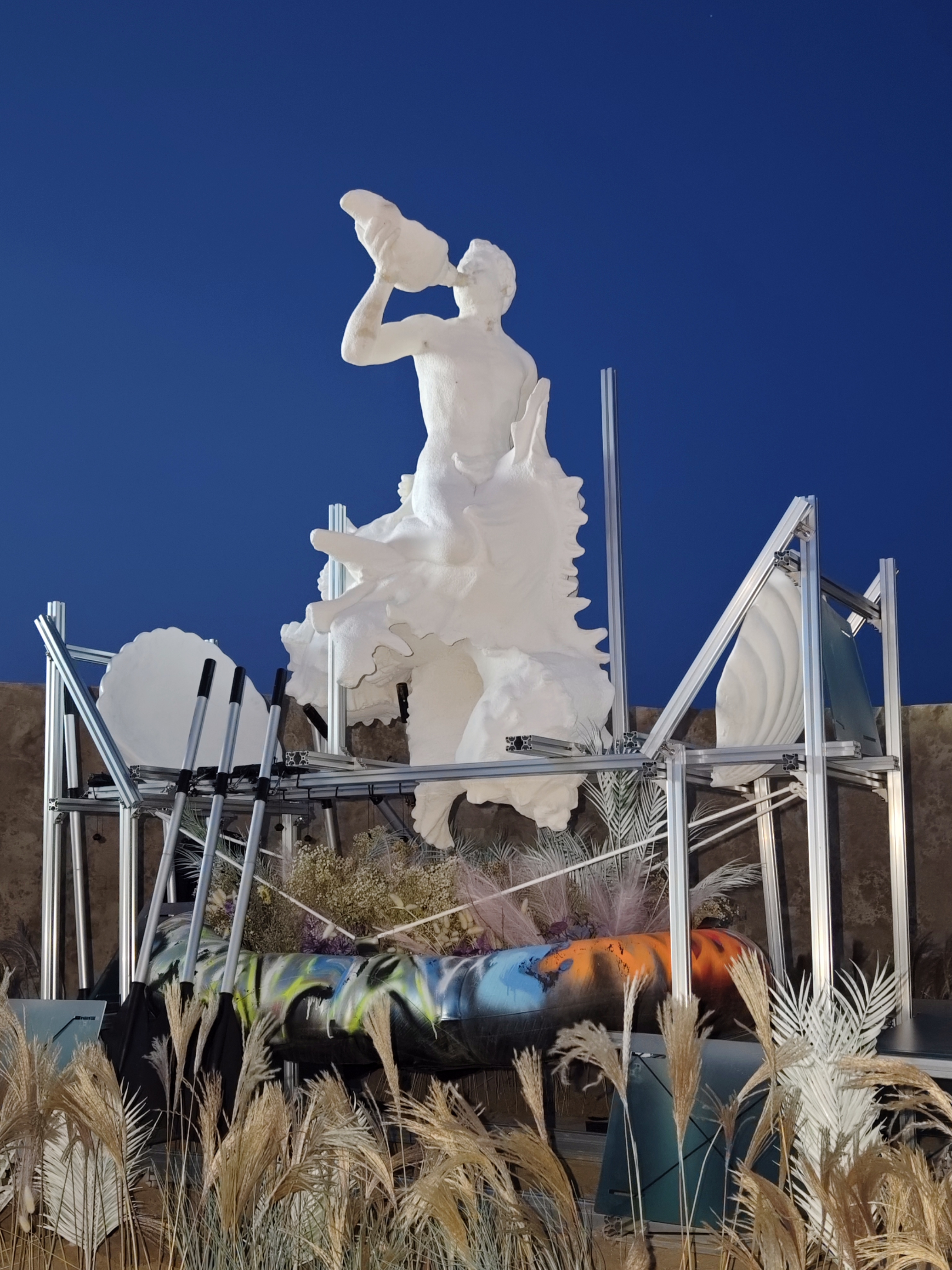 作品设计思路简述 (300字左右): 开始奏响古典的纯白肉体与工业朋克的机械颓废彼此交织,狰狞的海洋生物张牙舞爪,而幸存的植物也不甘示弱,在最后的陆地上进行生物竞争。潮水退去,人类挣扎着求生,品尝温室效应危机爆发的苦果。戏剧落幕了,而人类的故事还在继续,寻求族群未来的希望。海卫一吹响警示的号角,在船桨的滑动中寻找未来前行的方向。