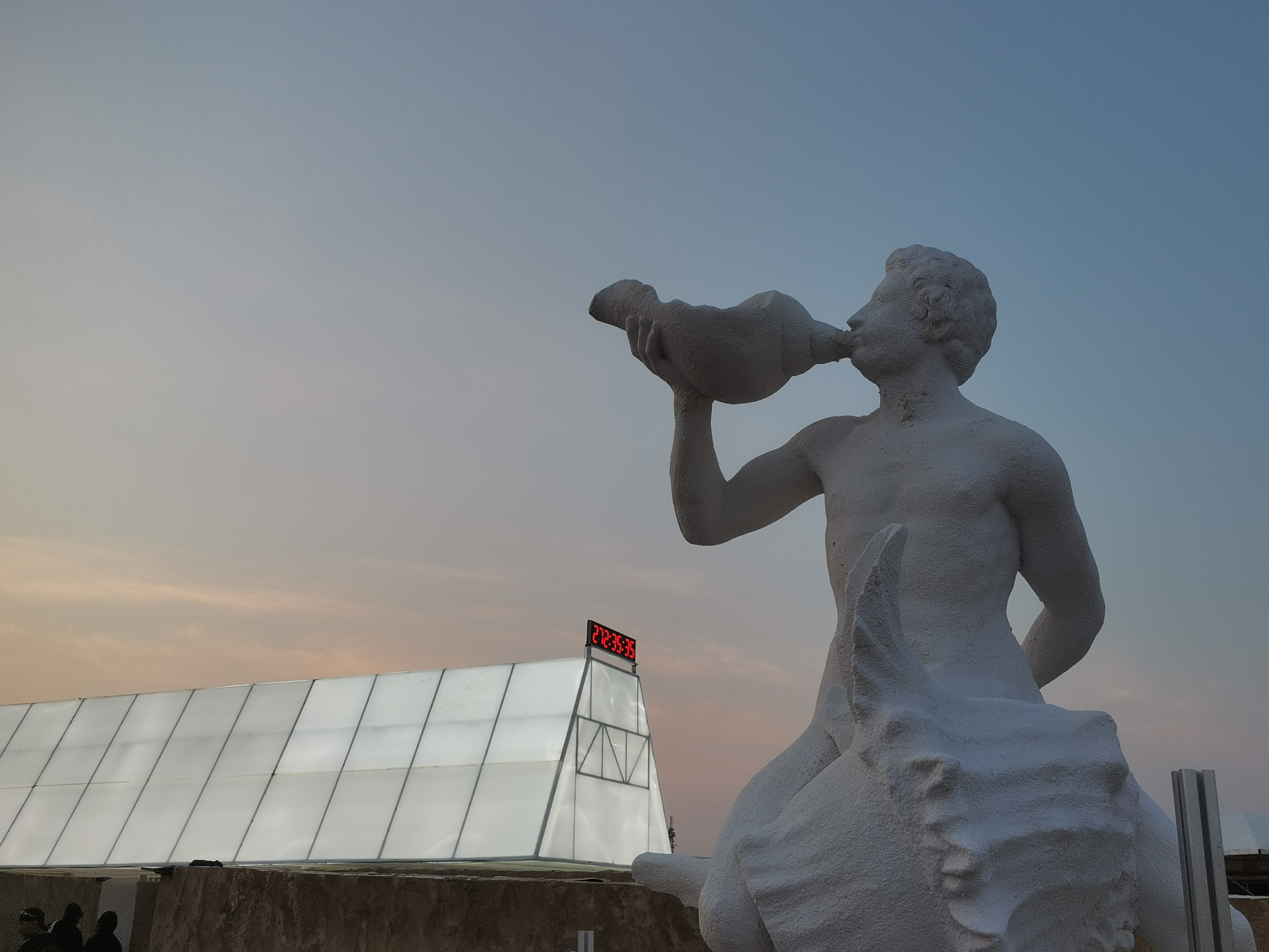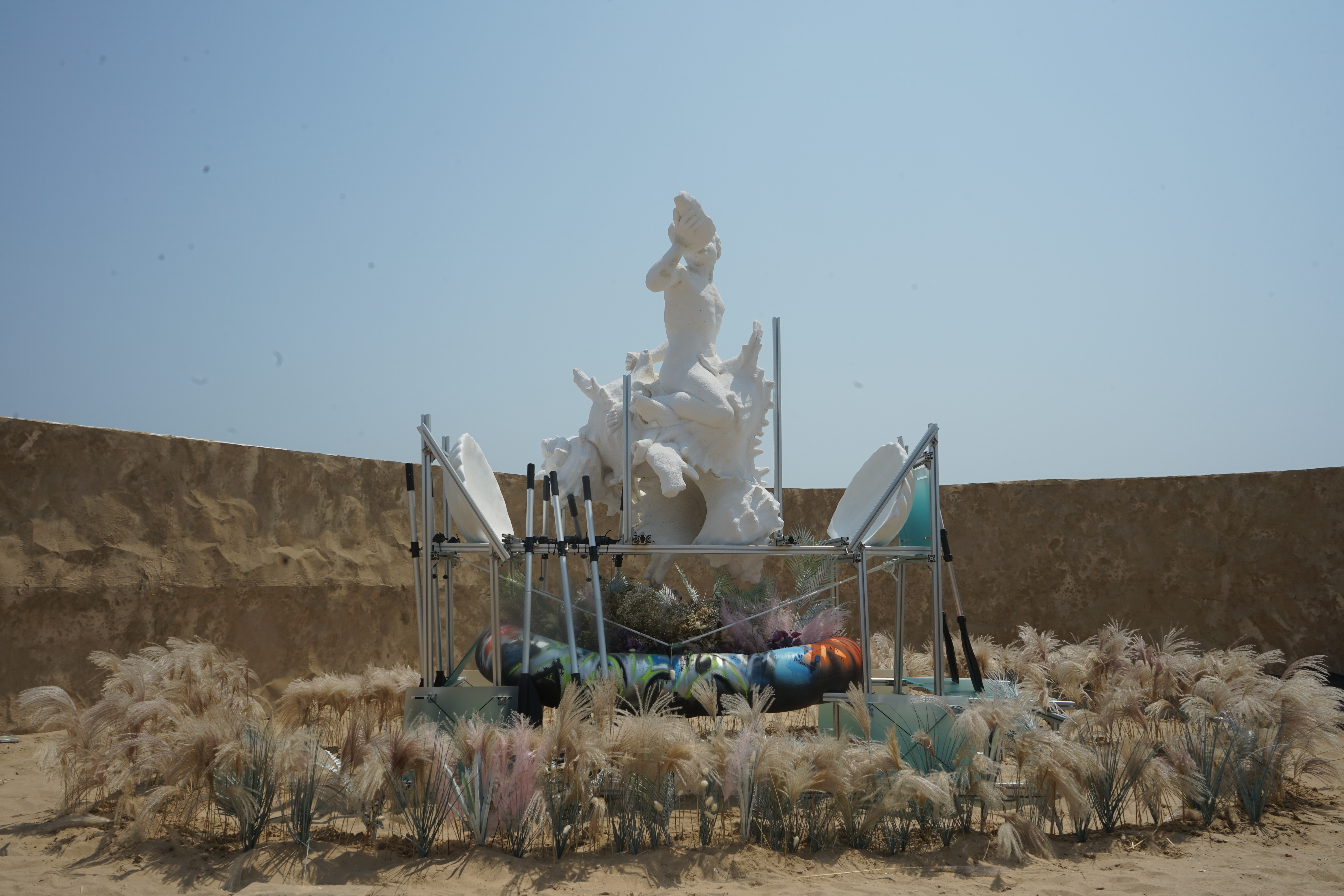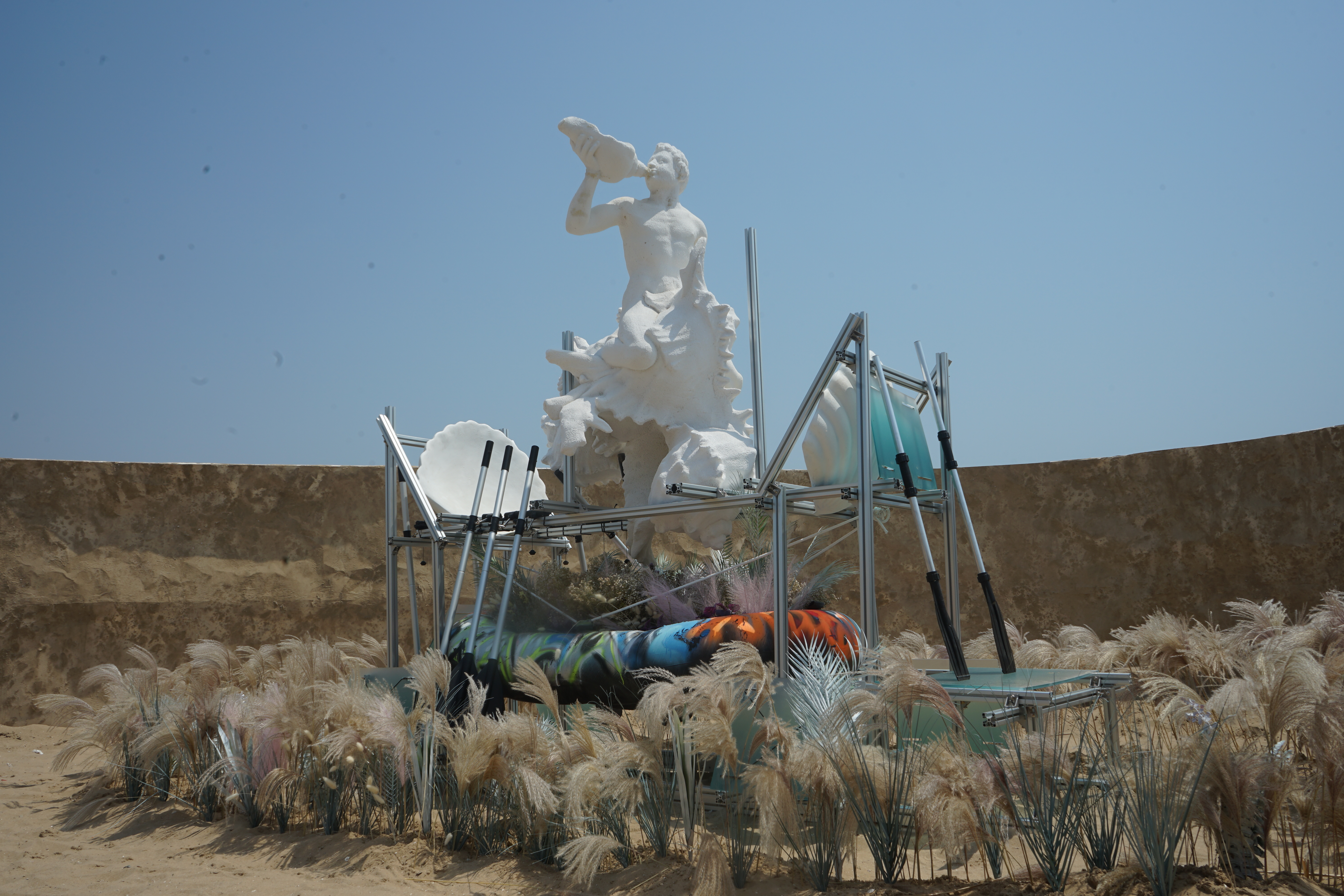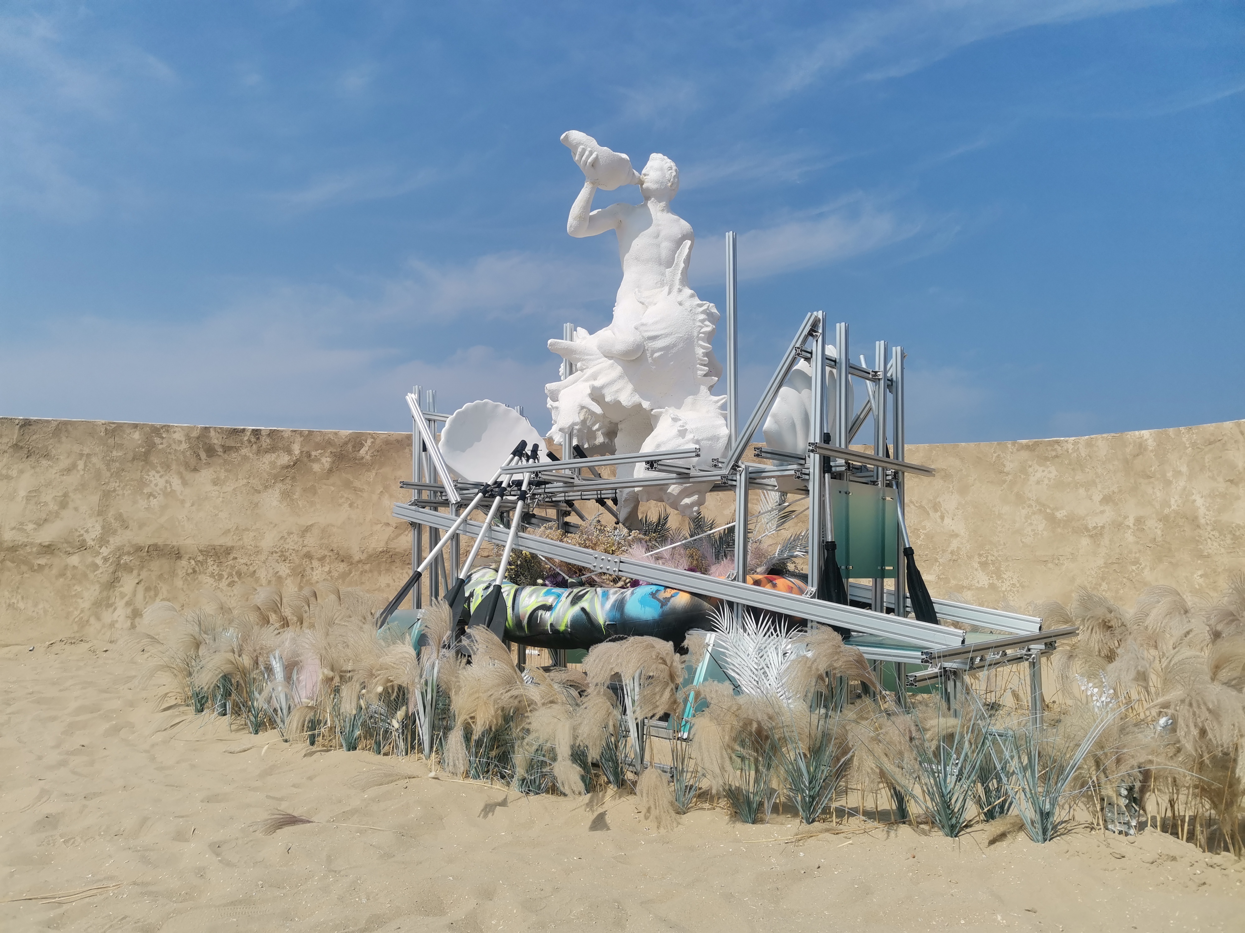 作品设计思路简述 (300字左右): 开始奏响古典的纯白肉体与工业朋克的机械颓废彼此交织,狰狞的海洋生物张牙舞爪,而幸存的植物也不甘示弱,在最后的陆地上进行生物竞争。潮水退去,人类挣扎着求生,品尝温室效应危机爆发的苦果。戏剧落幕了,而人类的故事还在继续,寻求族群未来的希望。海卫一吹响警示的号角,在船桨的滑动中寻找未来前行的方向。