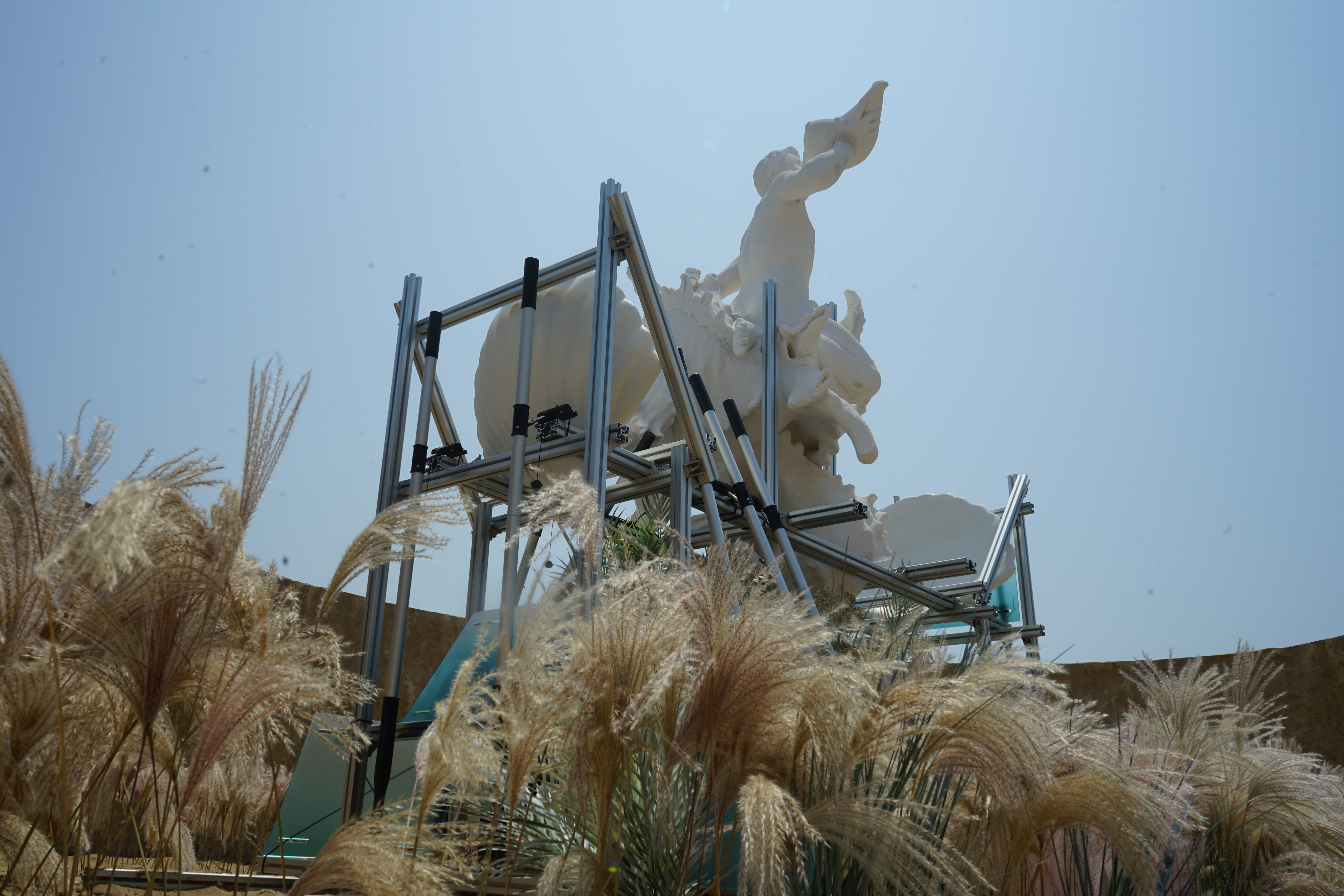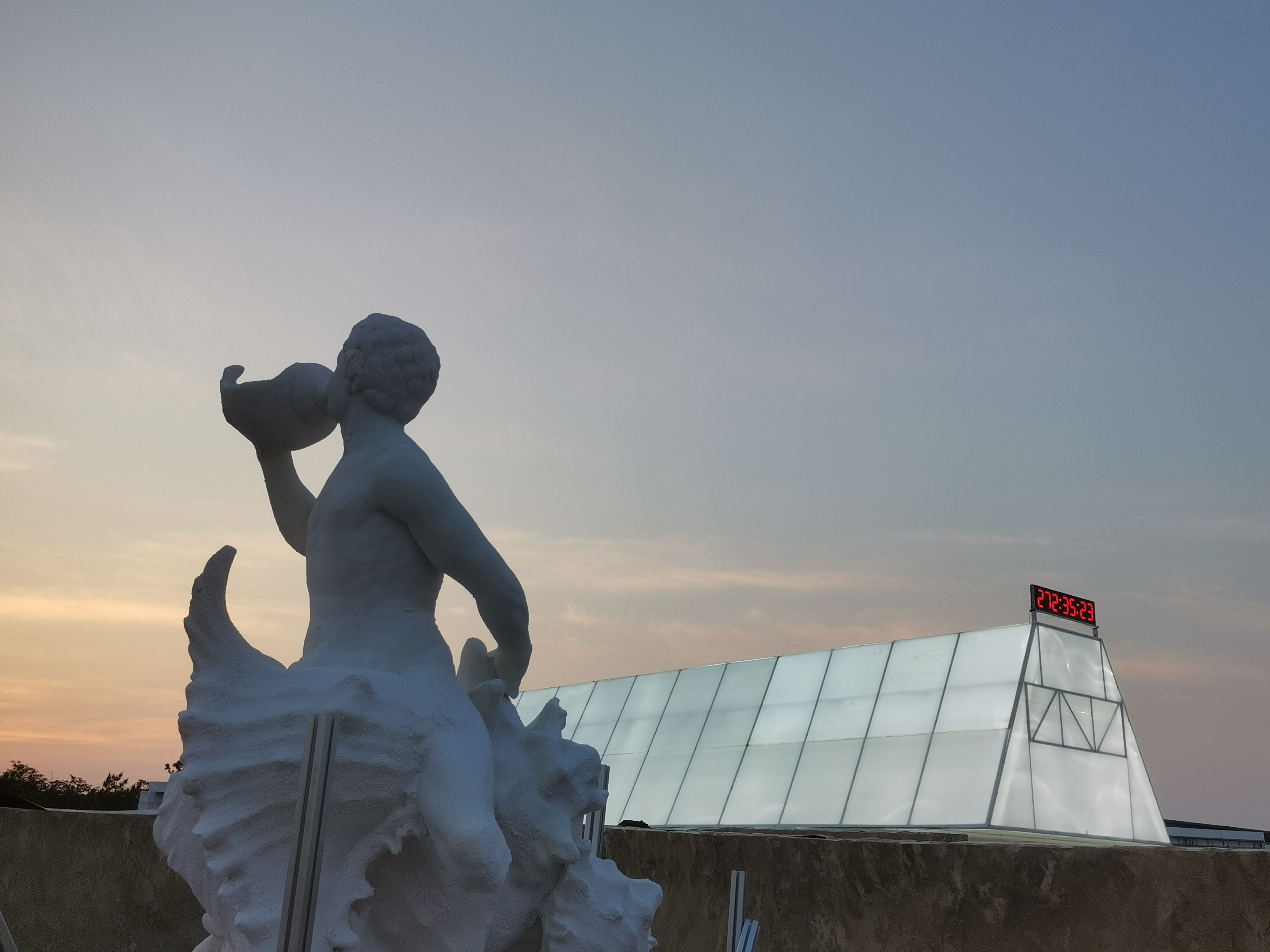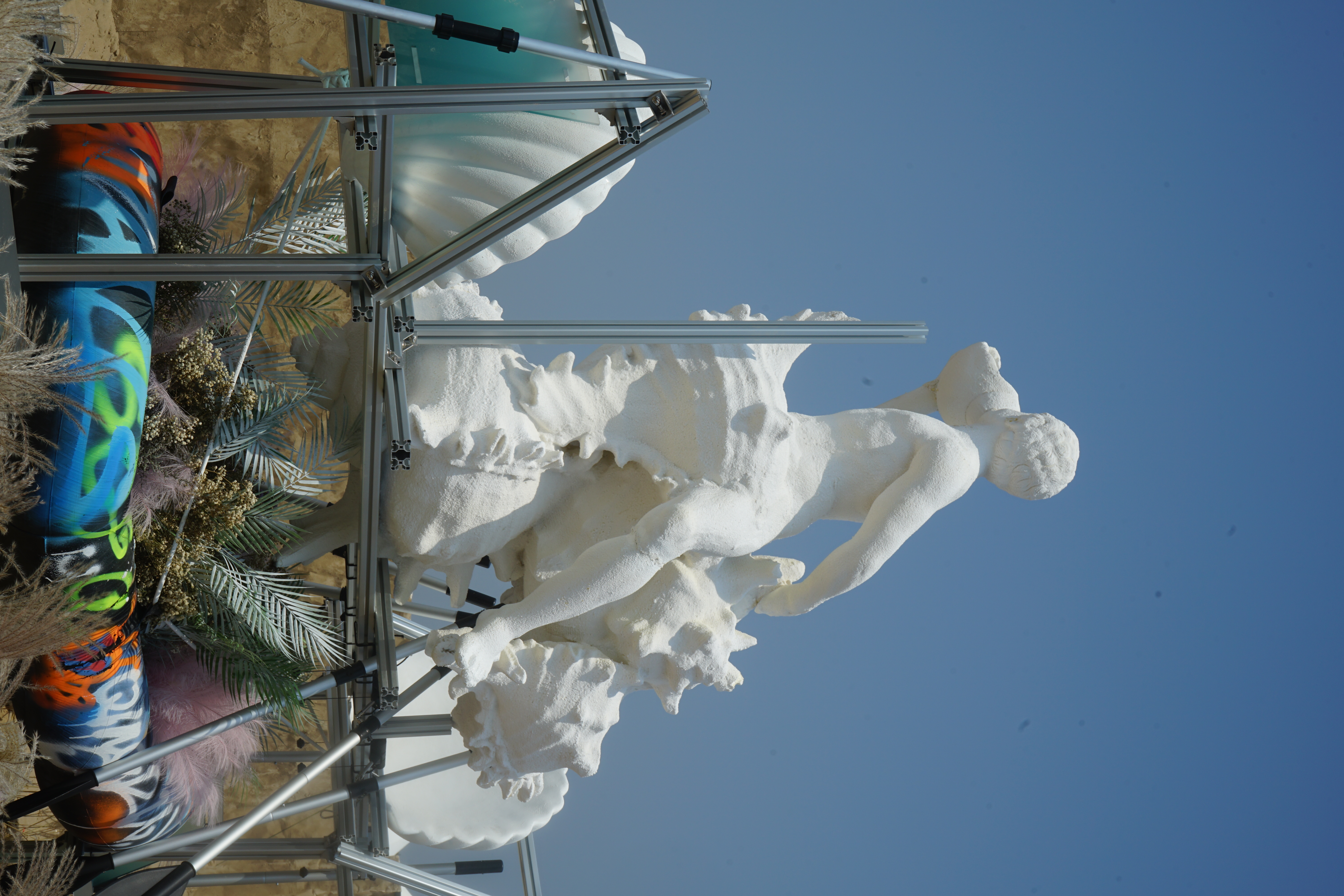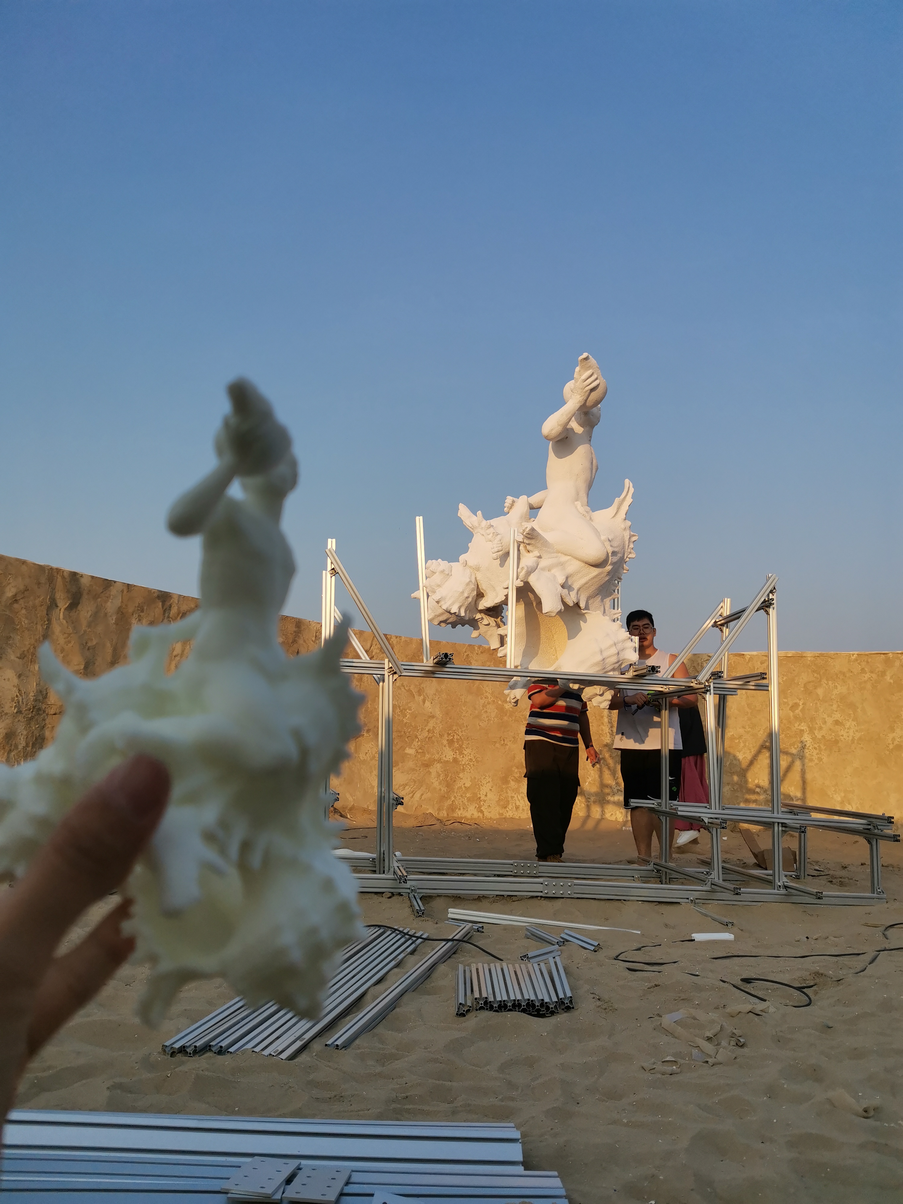 作品设计思路简述 (300字左右): 开始奏响古典的纯白肉体与工业朋克的机械颓废彼此交织,狰狞的海洋生物张牙舞爪,而幸存的植物也不甘示弱,在最后的陆地上进行生物竞争。潮水退去,人类挣扎着求生,品尝温室效应危机爆发的苦果。戏剧落幕了,而人类的故事还在继续,寻求族群未来的希望。海卫一吹响警示的号角,在船桨的滑动中寻找未来前行的方向。