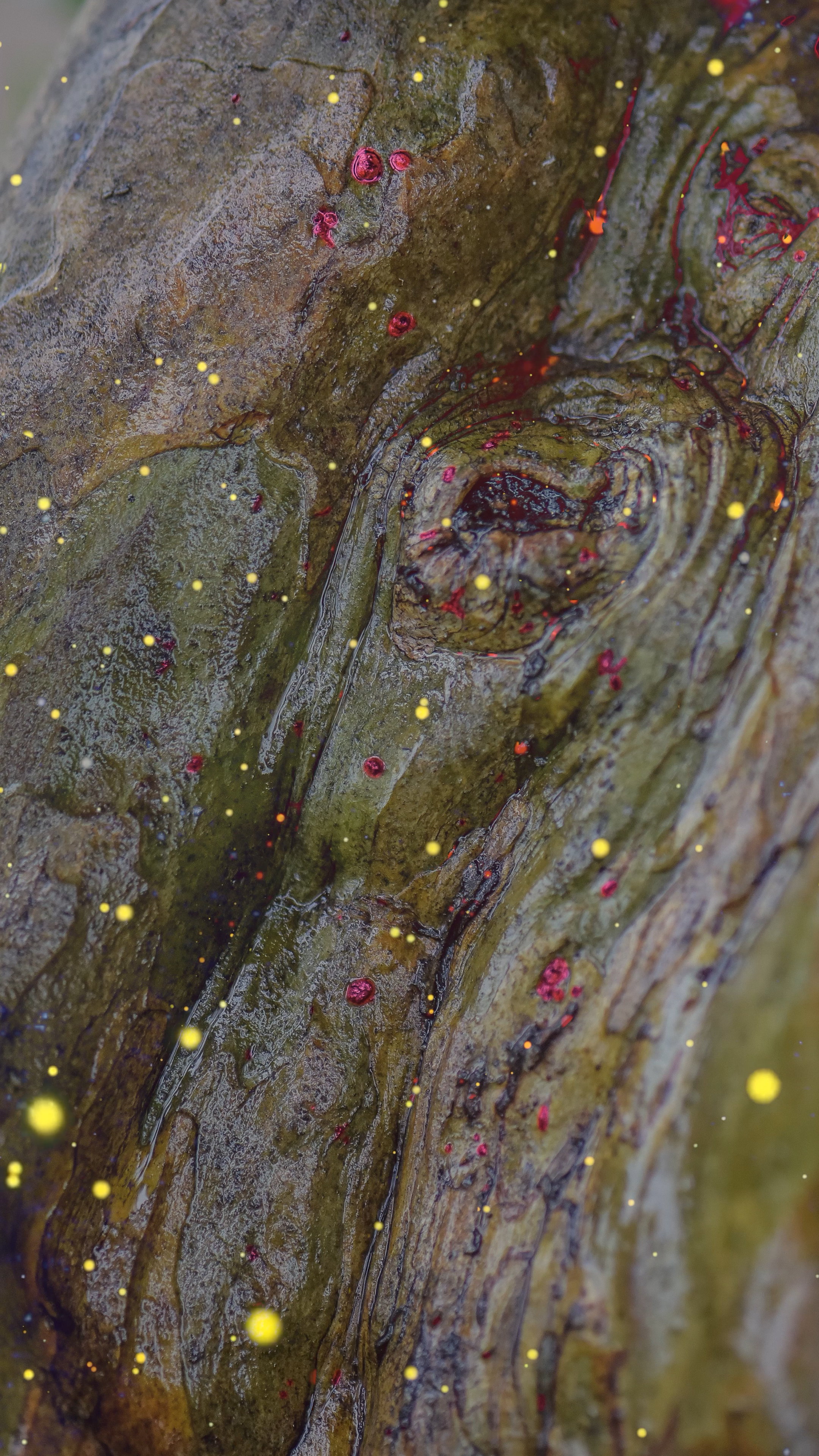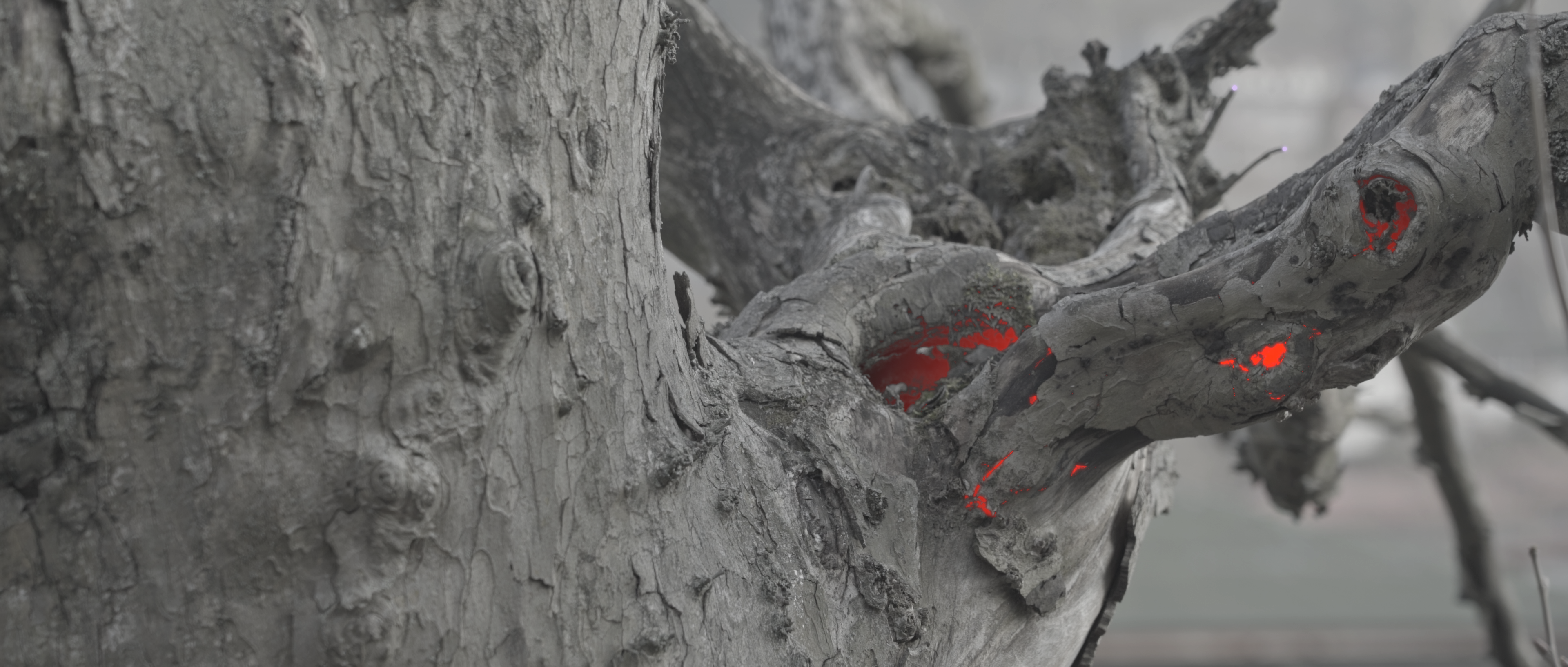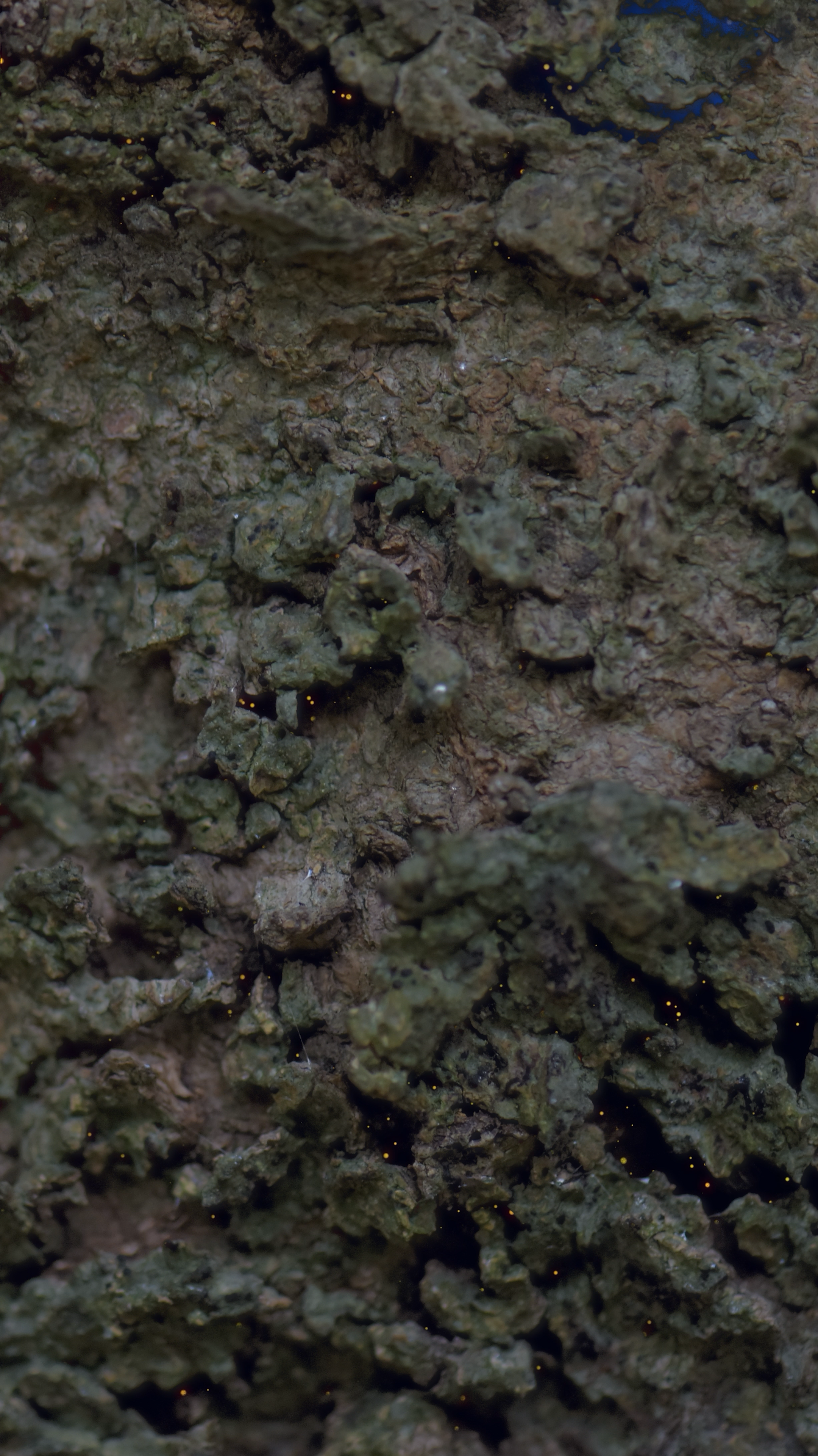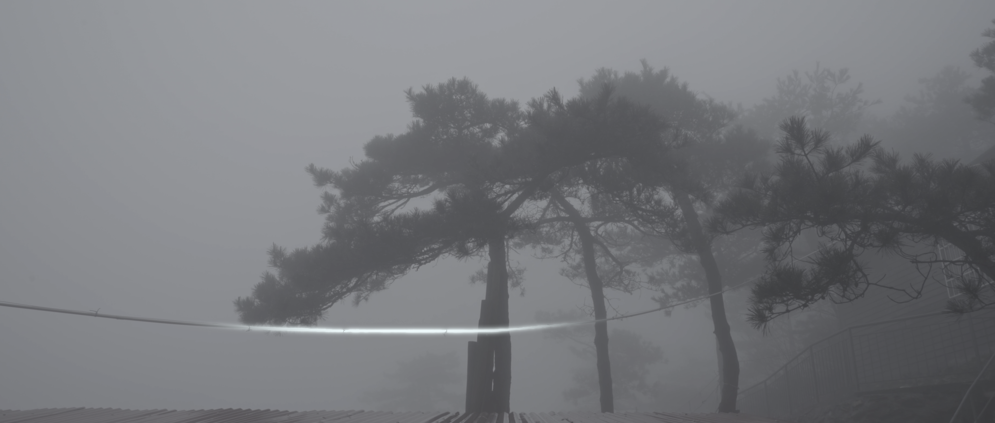 作品《100Hz》分为两个部分,一部分是我将模拟、制作的动态灯光信号介入被迷雾覆盖的在建日常景观中,营造出一个在人类退场之后不同景观在发出信号以及信号正在被寻找的场景。另一部分是我将树木表皮之下的生命空间进行了可视化的光效处理并且搭配了不同的信号音,不同的音符相互碰撞、融合与所有影像中的视觉元素构成一个整体,最终形成一个结合视听语言的信号场。我试图通过这个流动的信号场,结合声音的提示,让观众以他者的视角在这个场域中去观看和感知所处的不确定的当下。
