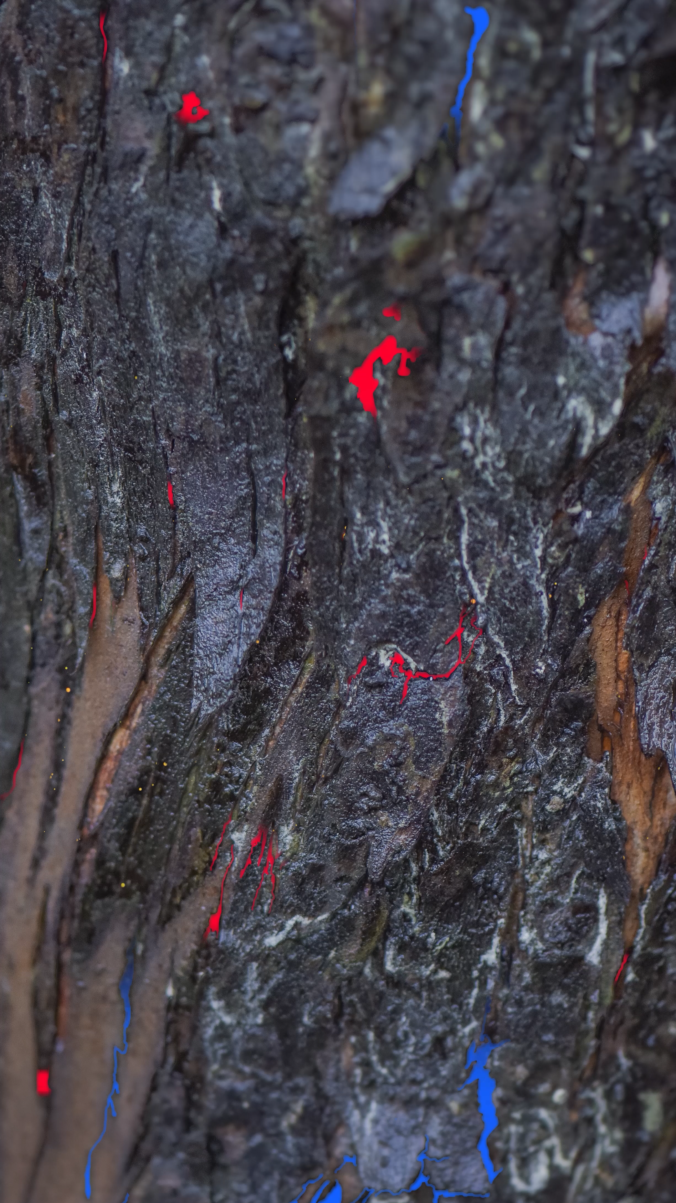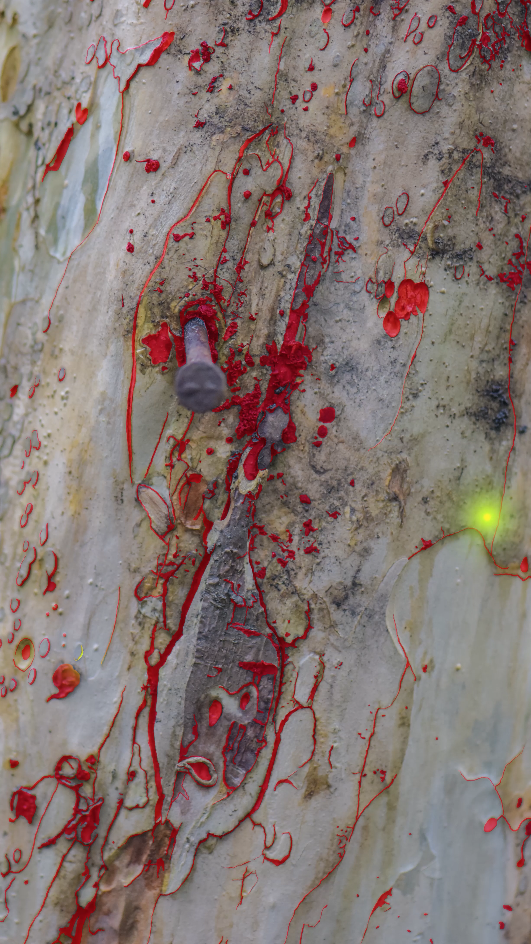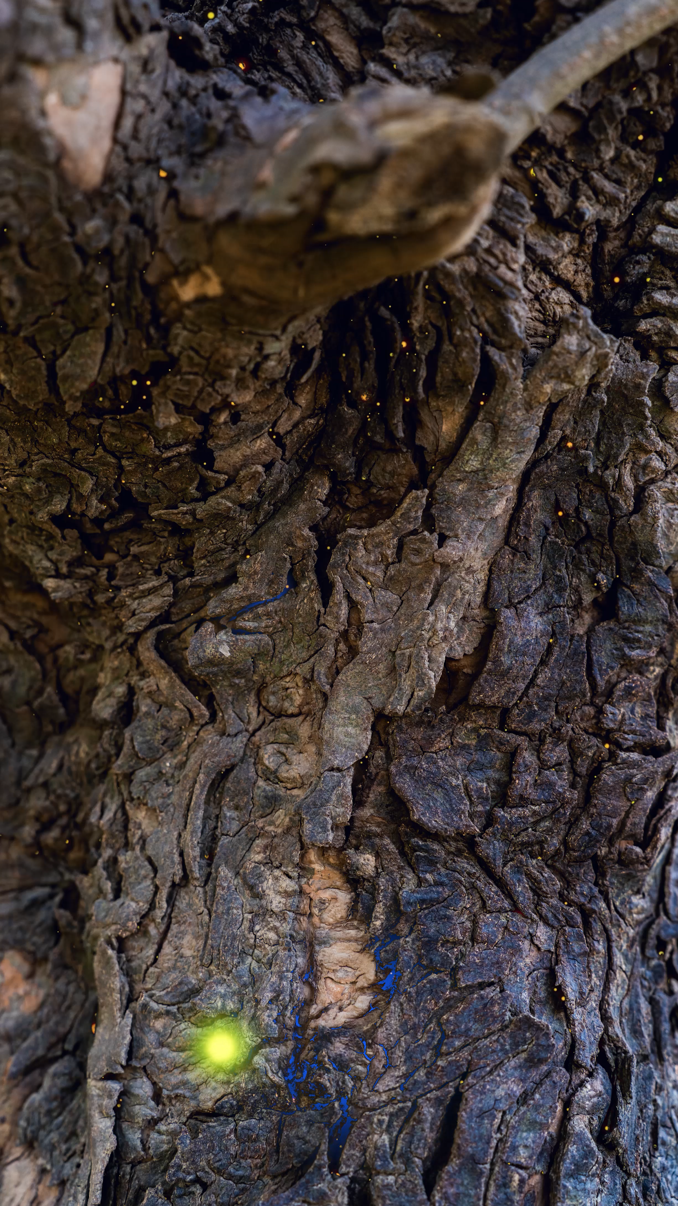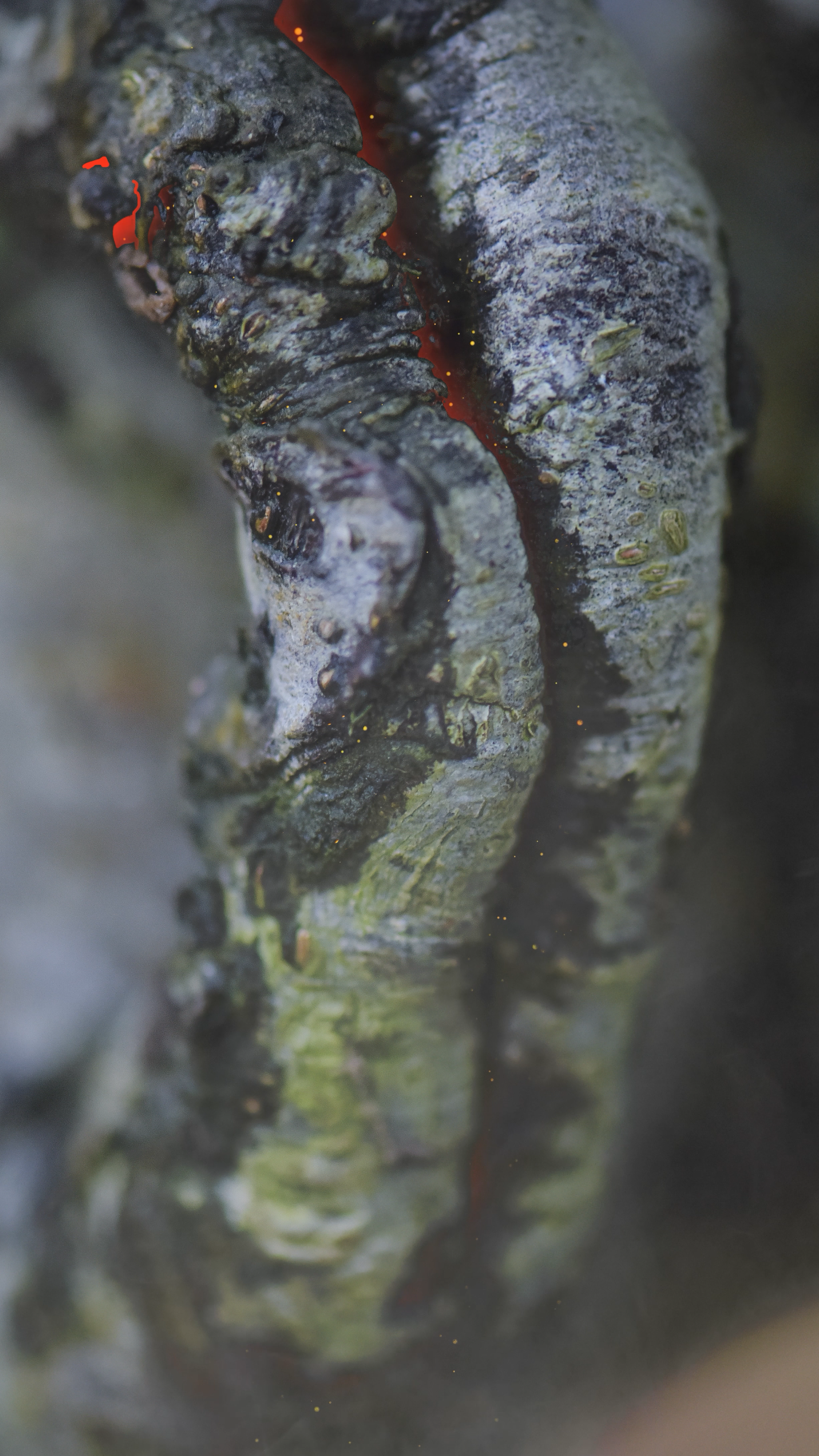 作品《100Hz》分为两个部分,一部分是我将模拟、制作的动态灯光信号介入被迷雾覆盖的在建日常景观中,营造出一个在人类退场之后不同景观在发出信号以及信号正在被寻找的场景。另一部分是我将树木表皮之下的生命空间进行了可视化的光效处理并且搭配了不同的信号音,不同的音符相互碰撞、融合与所有影像中的视觉元素构成一个整体,最终形成一个结合视听语言的信号场。我试图通过这个流动的信号场,结合声音的提示,让观众以他者的视角在这个场域中去观看和感知所处的不确定的当下。