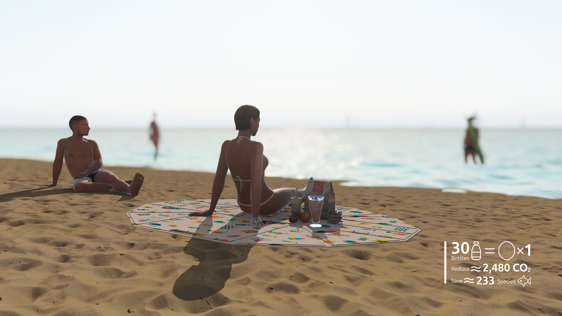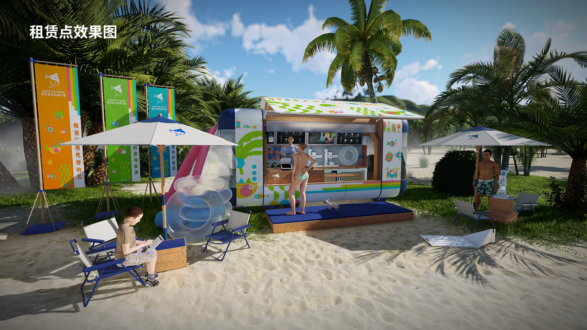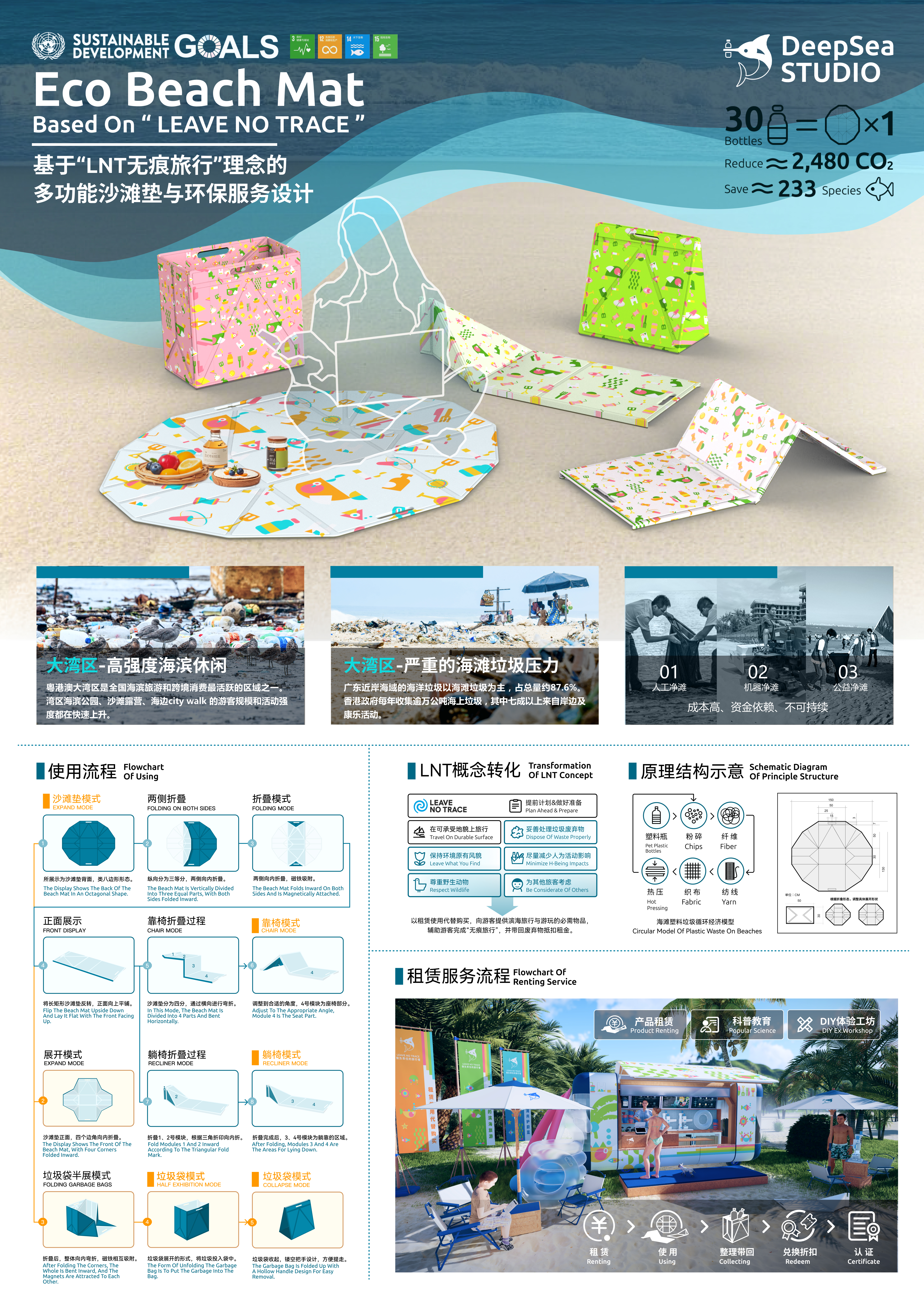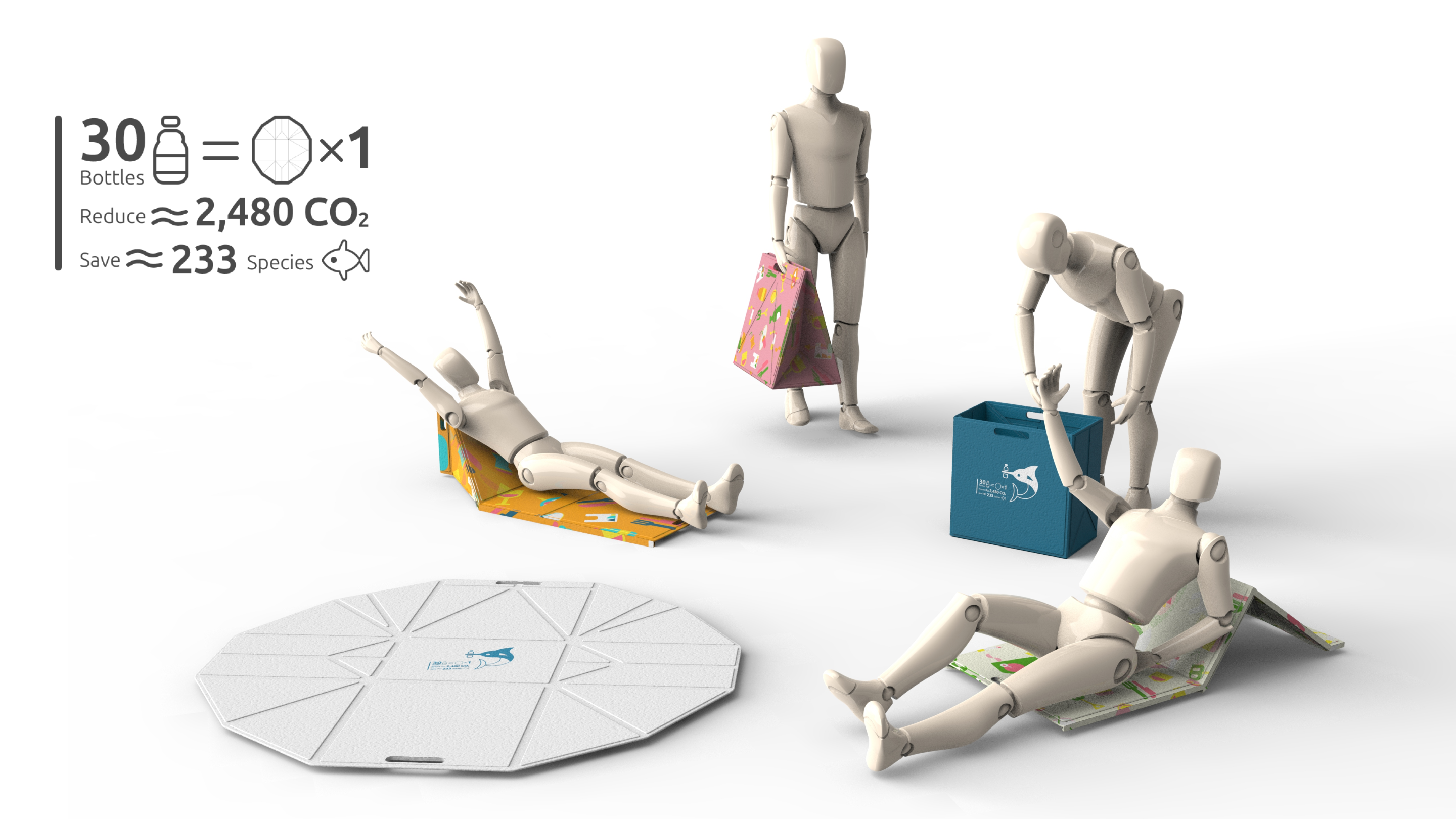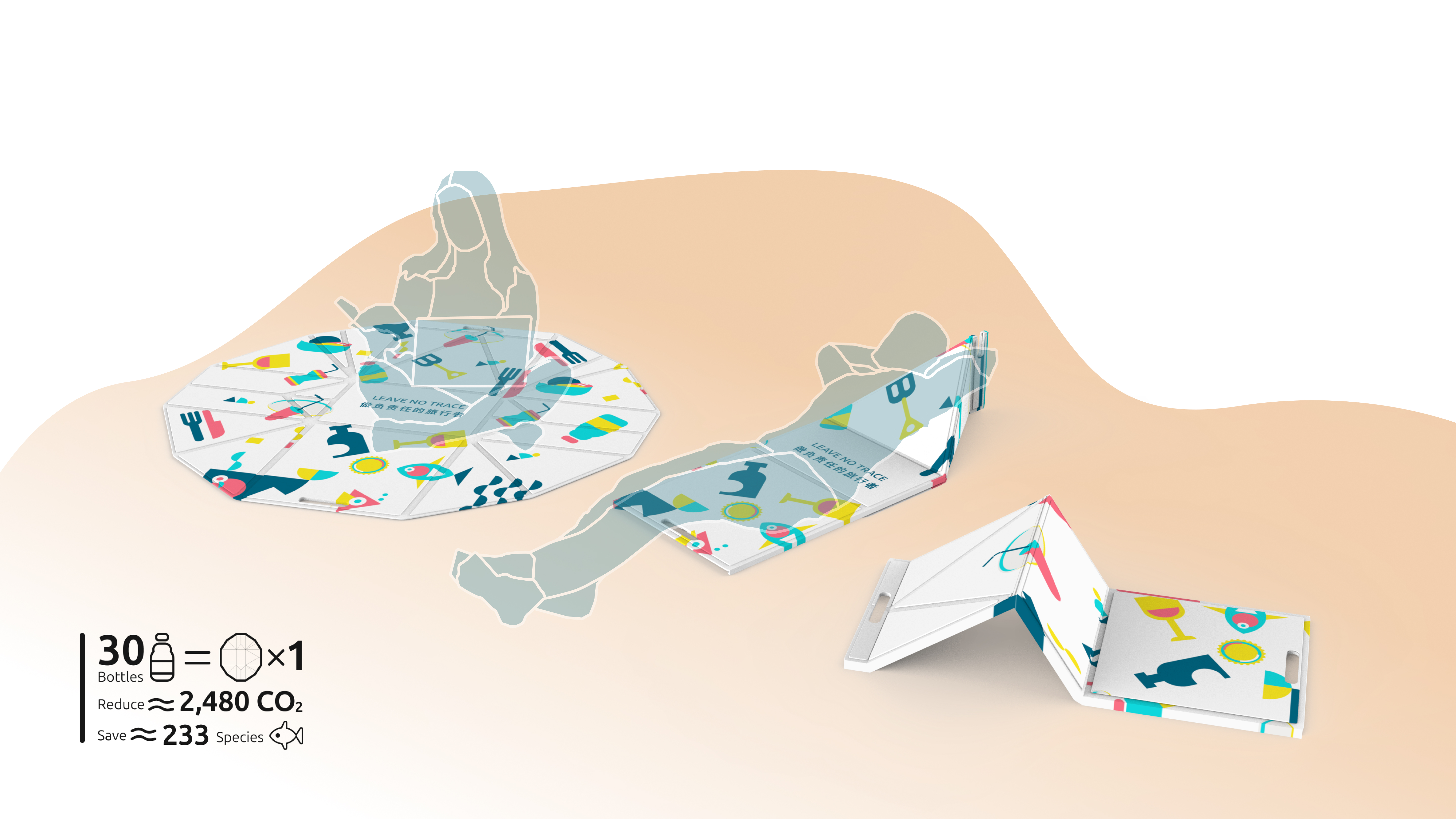 面对大湾区海滩的高强度海滨休闲与严峻的海滩垃圾压力之间的矛盾情况,我们以海洋垃圾再生塑料为核心材料,基于LNT(Leave No Trace)最小环境影响法则,打造可折叠的多功能结构沙滩垫,通过折叠可包含沙滩垫、沙滩椅、和手提收纳袋三种形态。旅客来到沙滩入口处小程序扫码租赁,归还时通过垃圾重量抵消部分押金,并兑换碳积分、酒店餐厅消费券、产品文创制作体验等权益。用「无需费力,租赁即环保」的新消费逻辑,让每片海滩都成为可持续生活实验室。