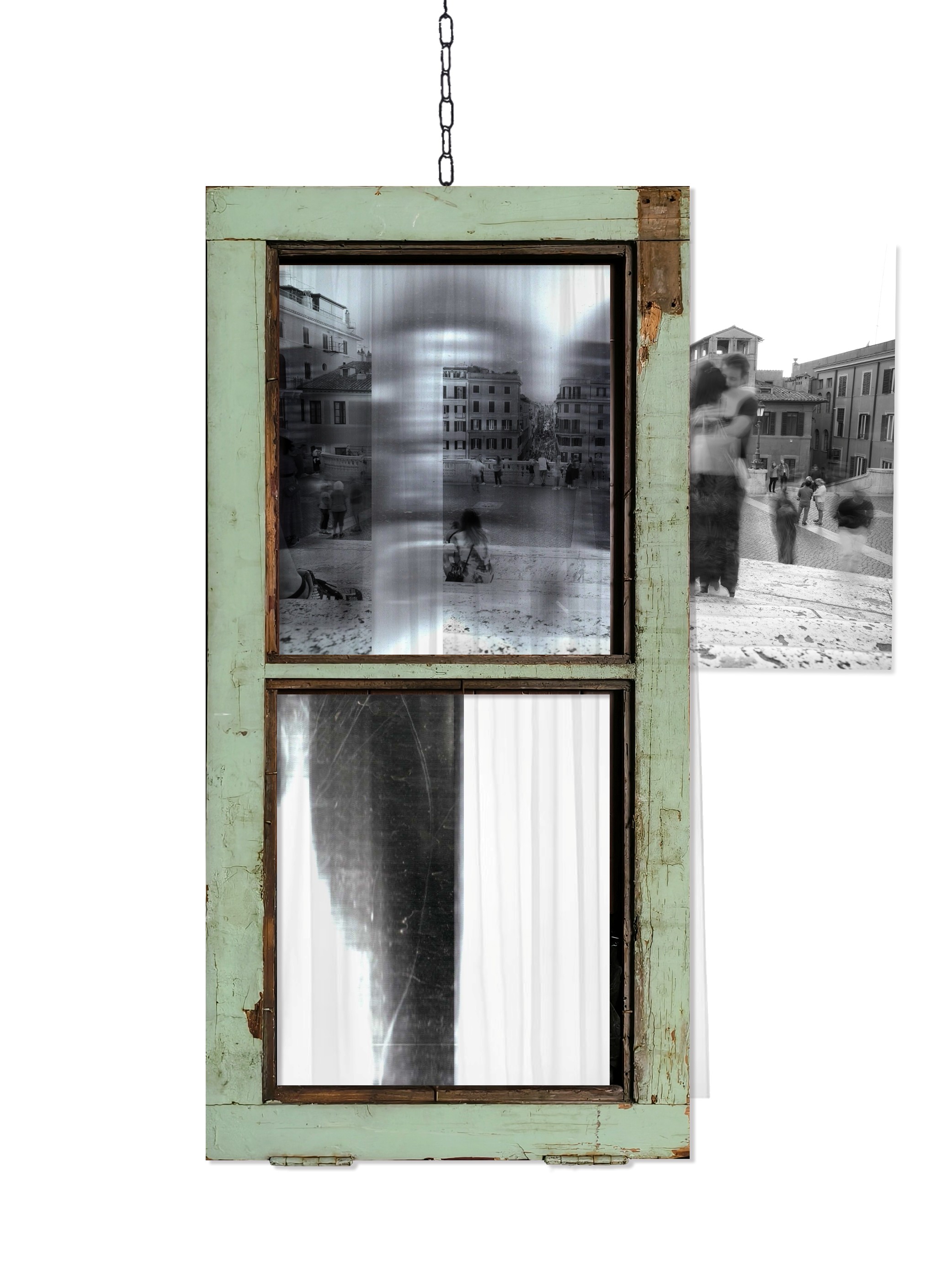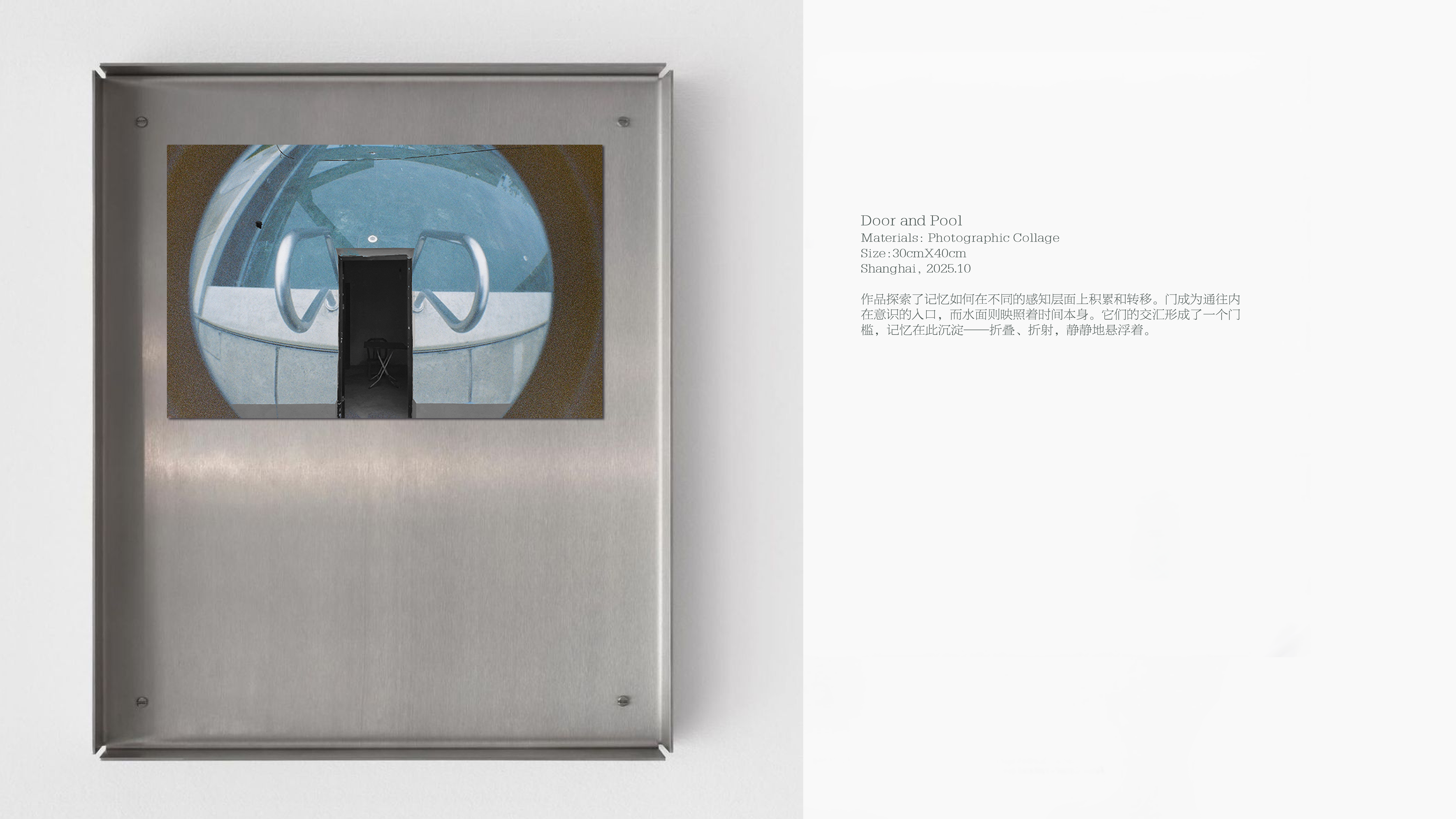 本系列以“窗”“泳池”“幕布”等被日常忽略的空间界面为切入口,通过将摄影图像置入旧窗框、布帘与金属等非传统材质中,将影像转化为一种可被穿越、停留、回望的空间装置。作品聚焦于记忆与观看之间的缝隙:窗的开合、水面的折射、帘幕的遮蔽,使影像不断在透明与不透明之间变形,呈现出一种未被固定的时间感。