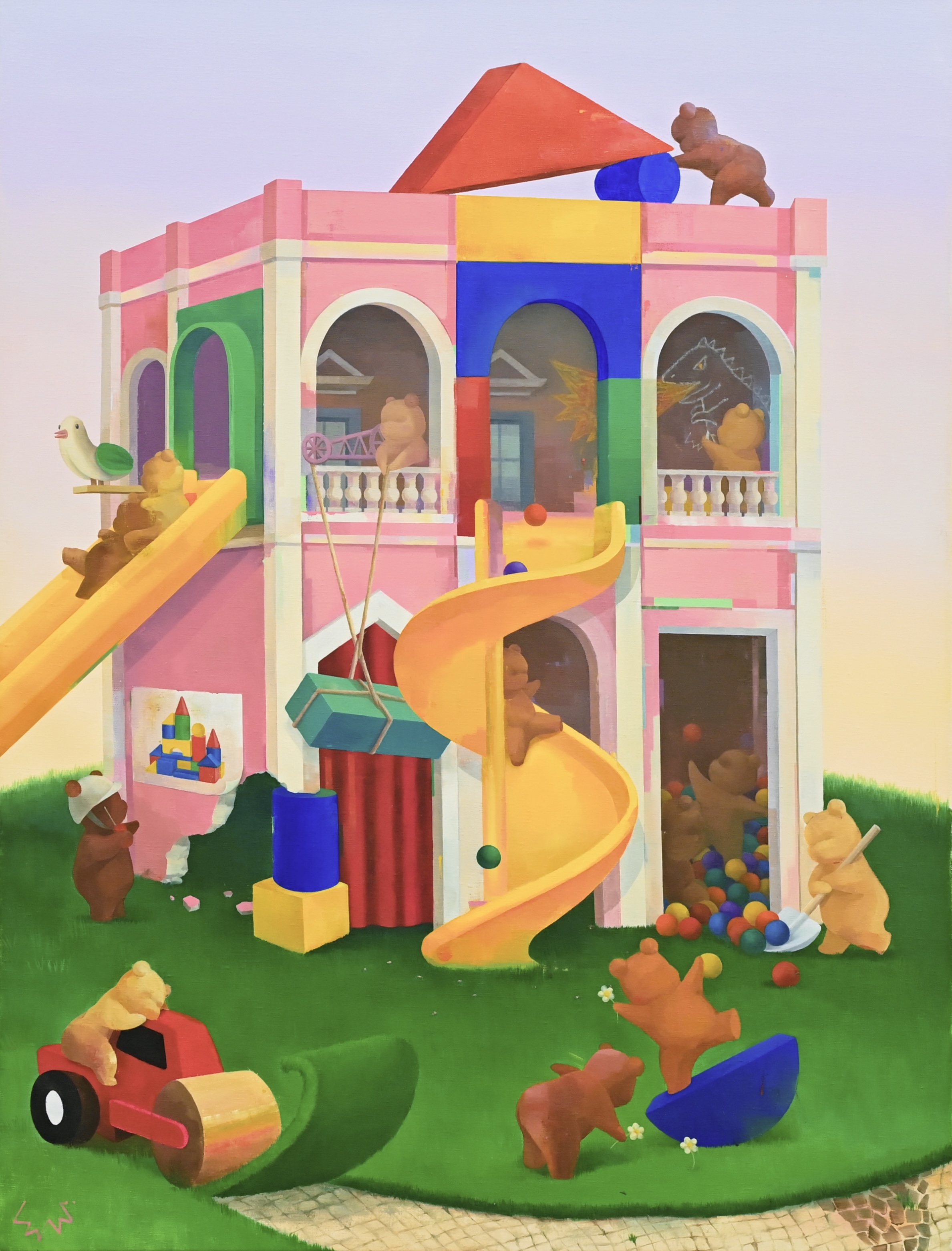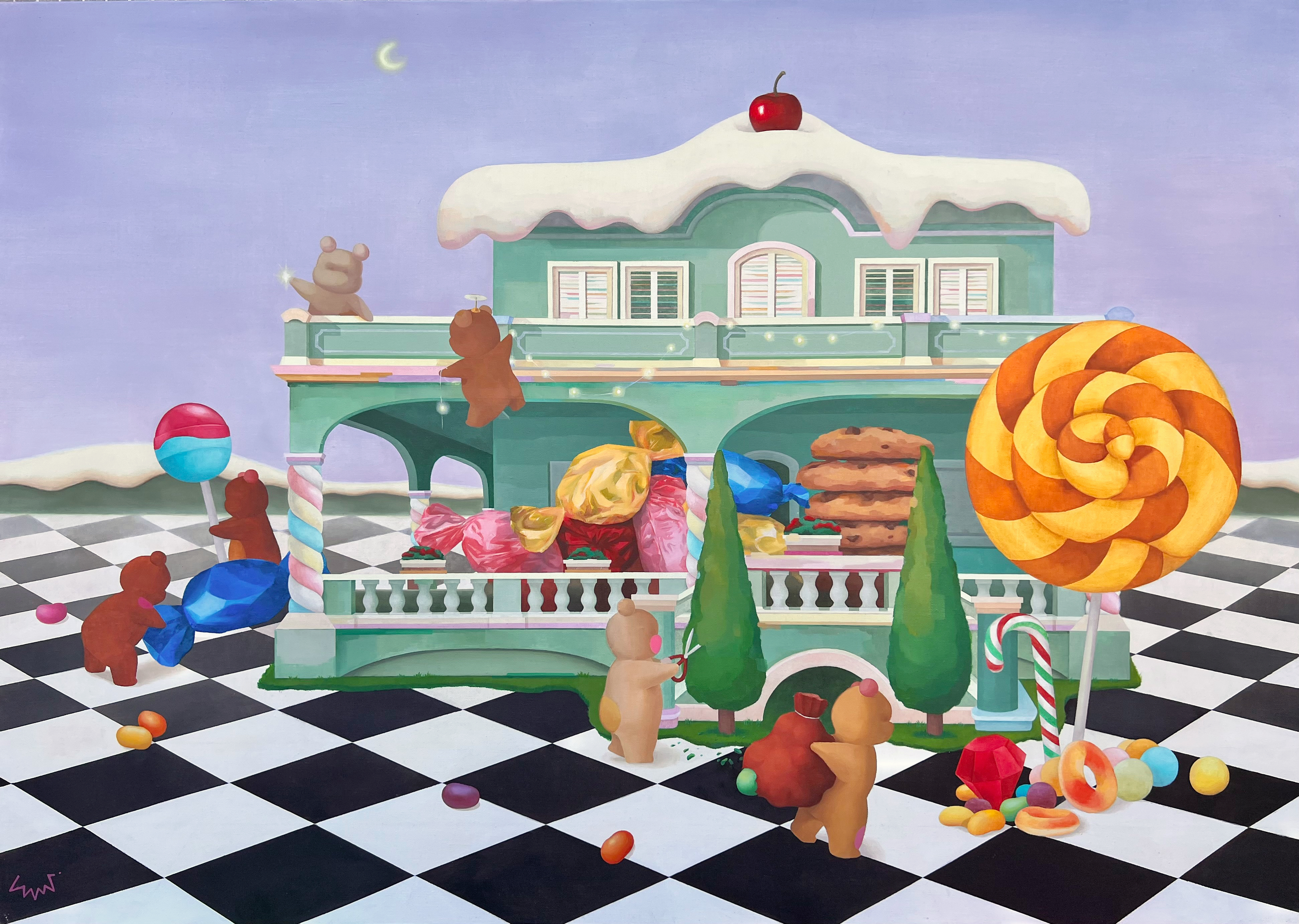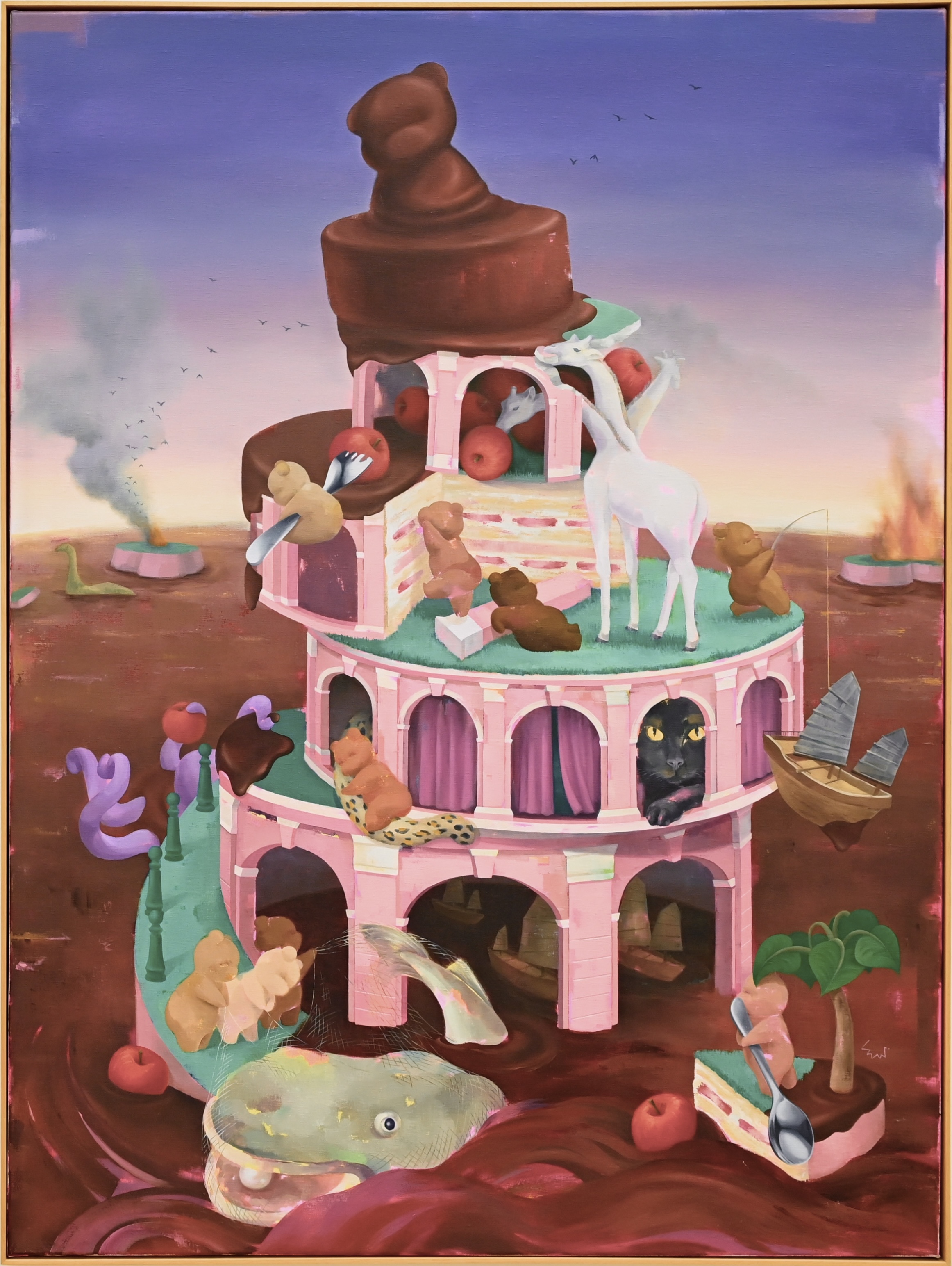 画面描绘甜腻背后的真实,以澳门建筑的文化特征作为「风景」的部份,重新搭建出新的景观,妄求创造出象牙塔般的理想世界,又透过建筑物结构的改变和崩塌,暗示著文化保育的迫切性,以苹果代表着人类的初始欲望,船只和捕鱼隐喻着澳门的历史;另外,画面中快要溶化的建筑物顶端,变异的动物和远处的灾难,带出被喻为世外桃园的澳门却难逃全球化问题的威协(气候危机的影响,病毒变异的失控,人类互相残杀带来的战争祸害等)与理想的世界渐行越远,在象牙塔之外,复杂的世界形势使我们难以独善其身,反观是如何守卫自身的文化价值,才能在时代变迁中屹立不倒,象牙塔是对理想世界的精神向往,同时亦是居安思危的避风港。