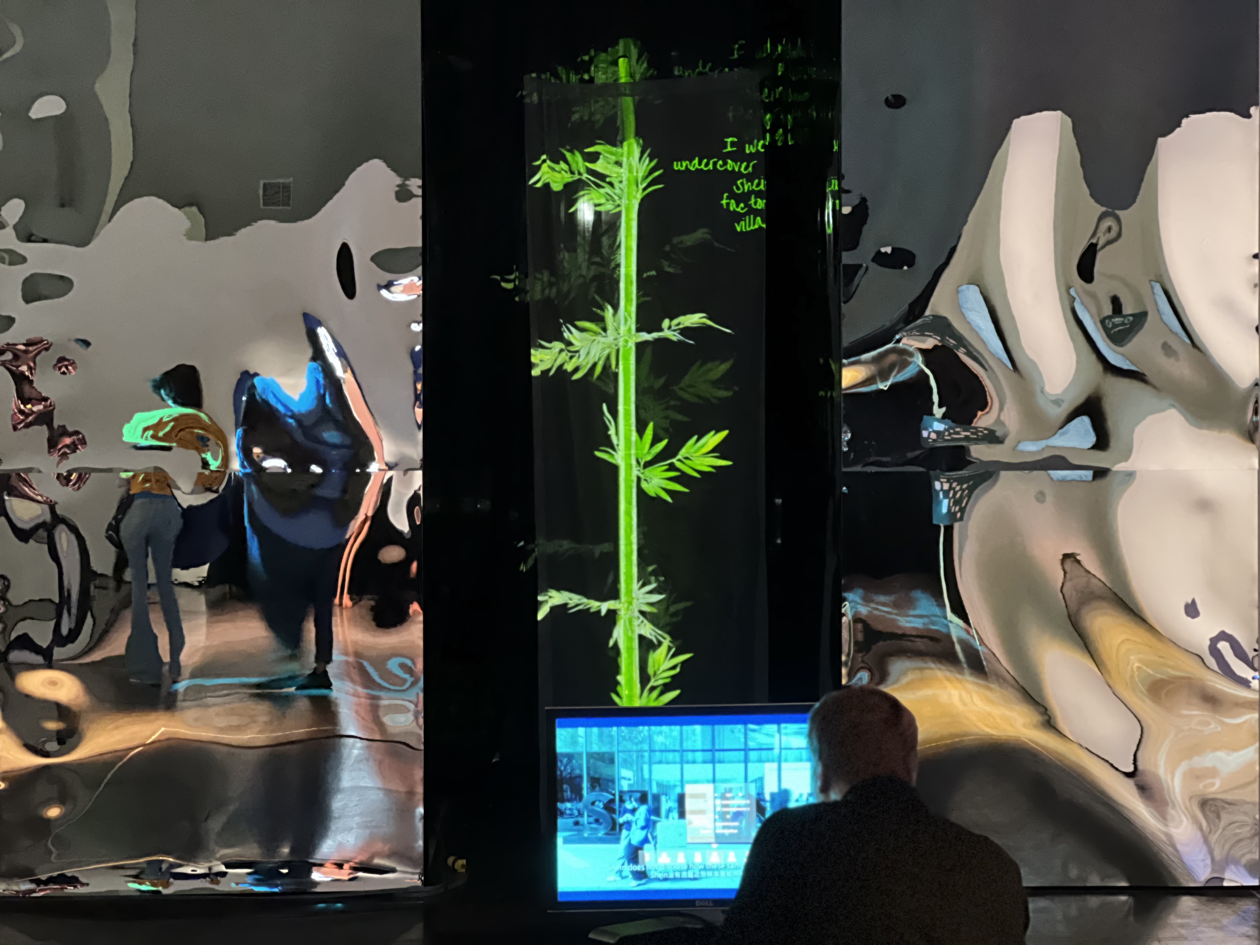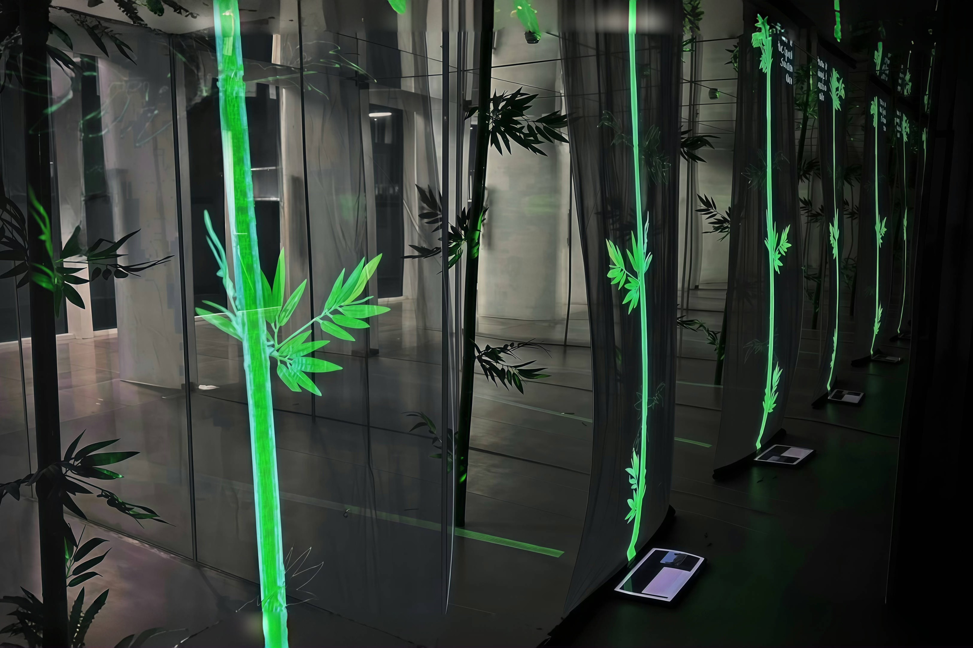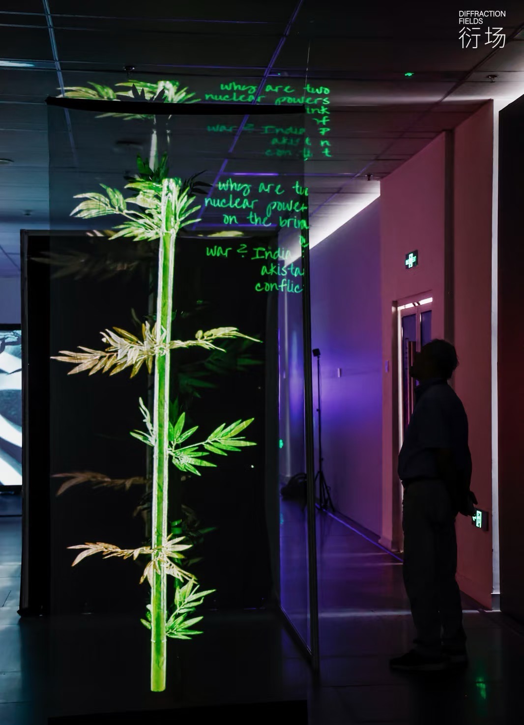 “摇曳”是一件融合影像爬取、情感计算与生成式视觉书写的互动影像装置,曾在中国广州(香港科技大学广州展示中心,2025),加拿大温哥华(温哥华国际会展中心,2025)和美国纽约(布兰克画廊,2025)展出。作品以“竹”作为贯穿历史的记录媒介隐喻,将其转化为可被算法不断刻写的“数字竹子”。系统持续从网络中爬取与“战争”相关的新闻文本与影像数据,通过情感分析算法识别其中的情绪倾向(如恐惧、愤怒、悲伤与紧张),并将这些情绪参数实时转译为刻写在虚拟竹表面的生成性笔触与动态纹理。每一次情感波动,都会转化为数字刻痕,叠加于竹的生长节律之中,使其成为不断被现实冲击重塑的“情感档案”。观众的介入会进一步扰动这一运算过程,使竹在环境中摆动、生长、变形,呈现出战争信息在数字时代的持续回响。作品以生成式书写替代静态记录,在技术、历史与集体情绪之间,构建一种不断被重写的记忆机制。