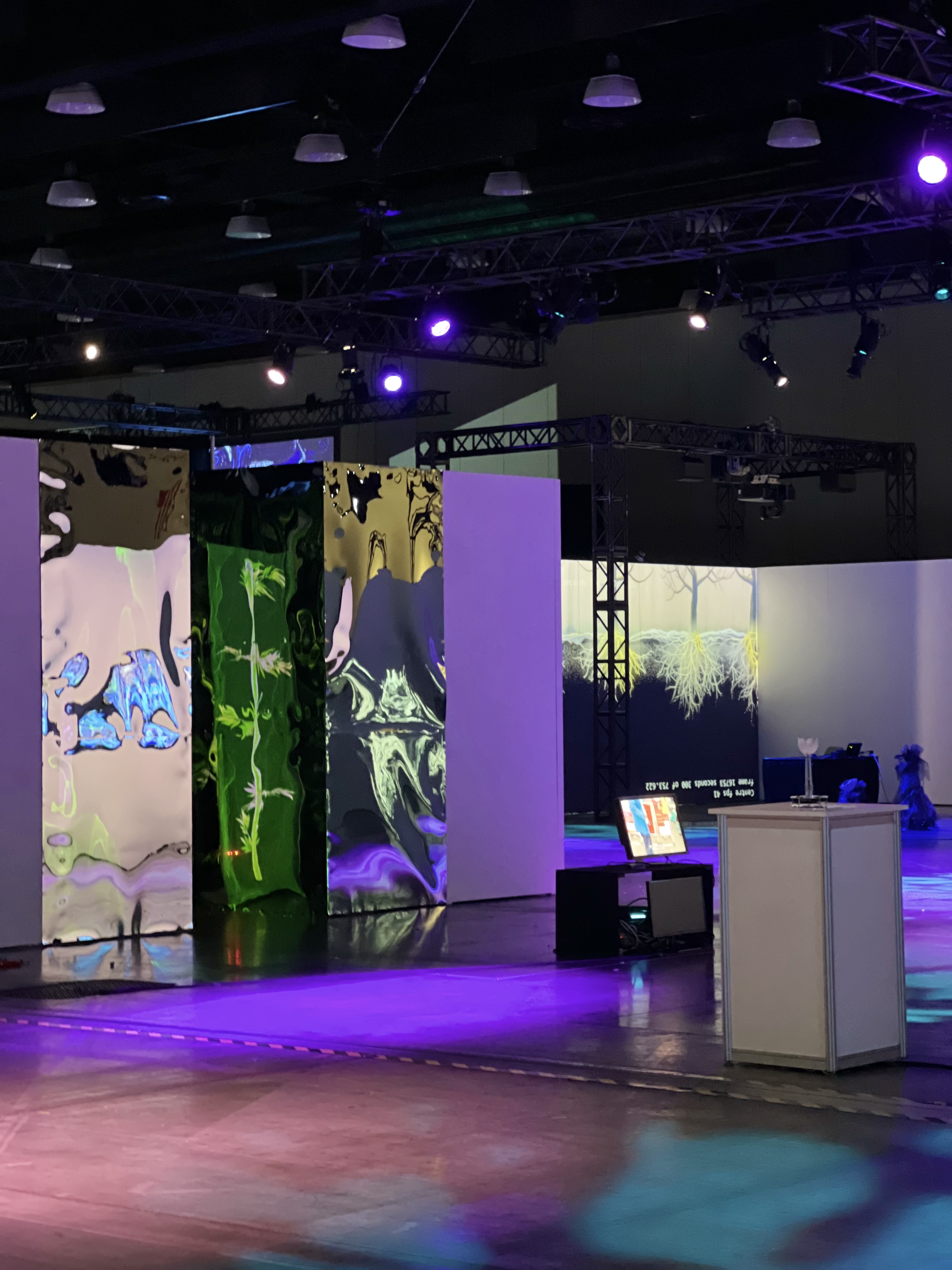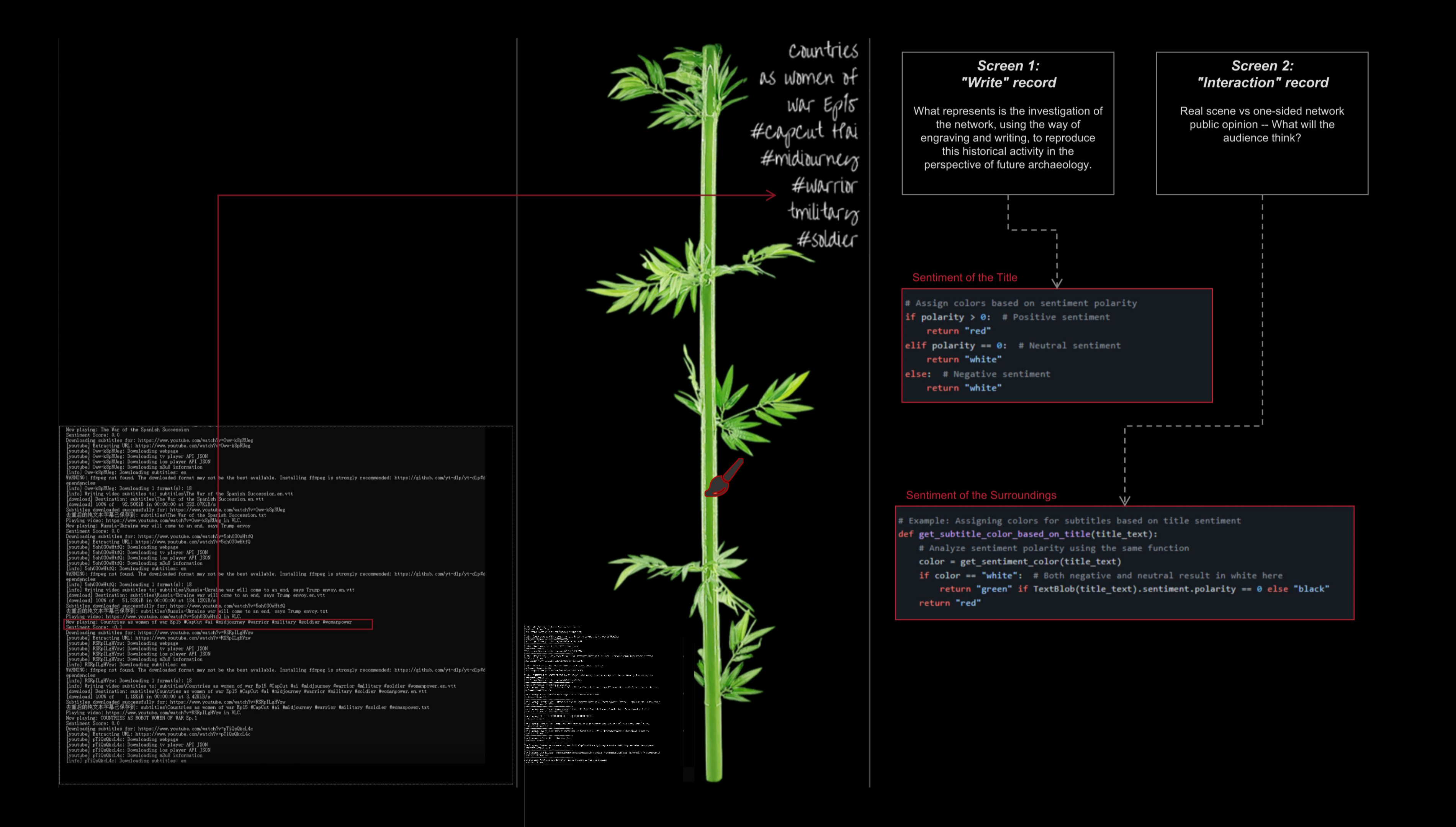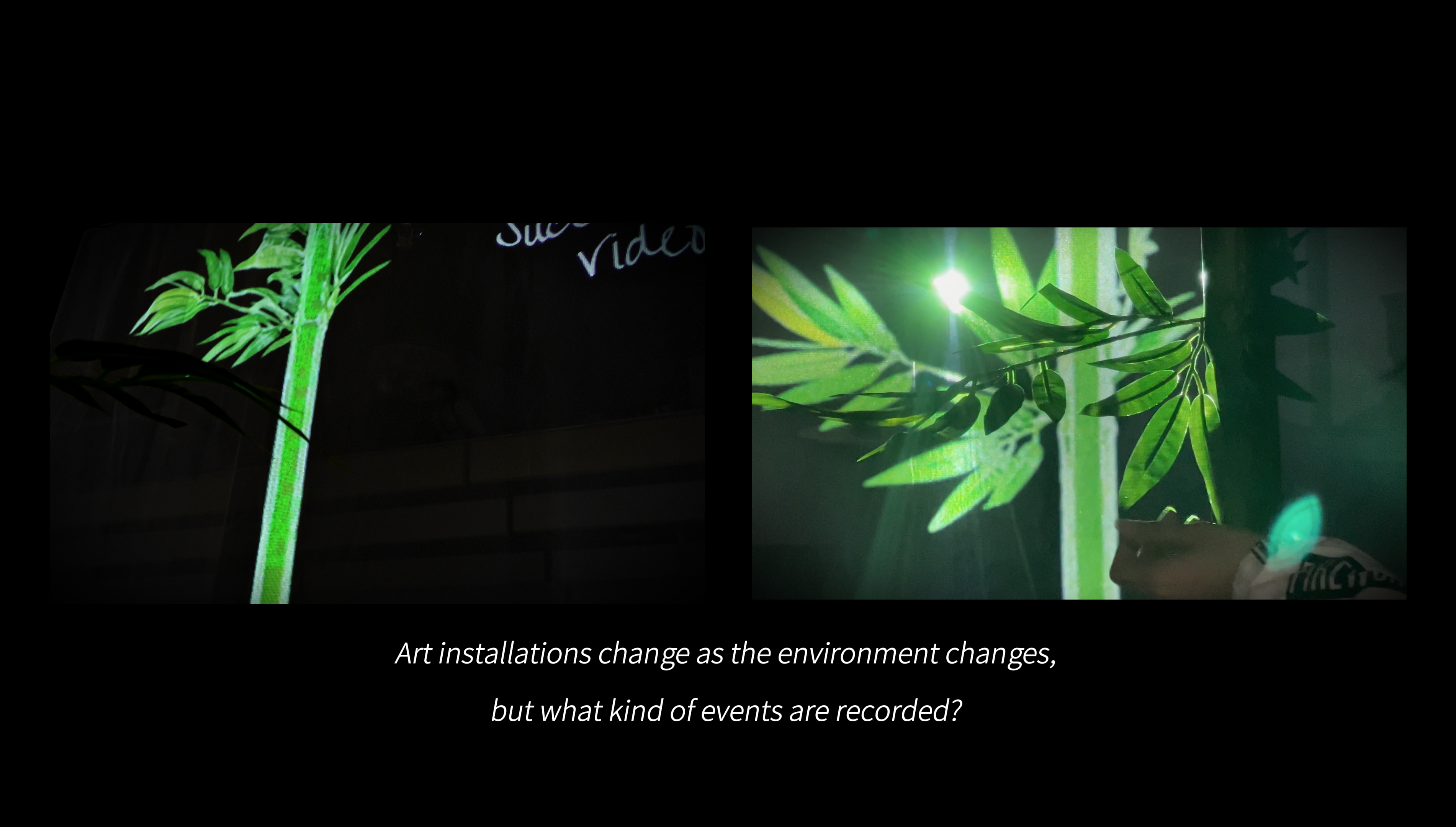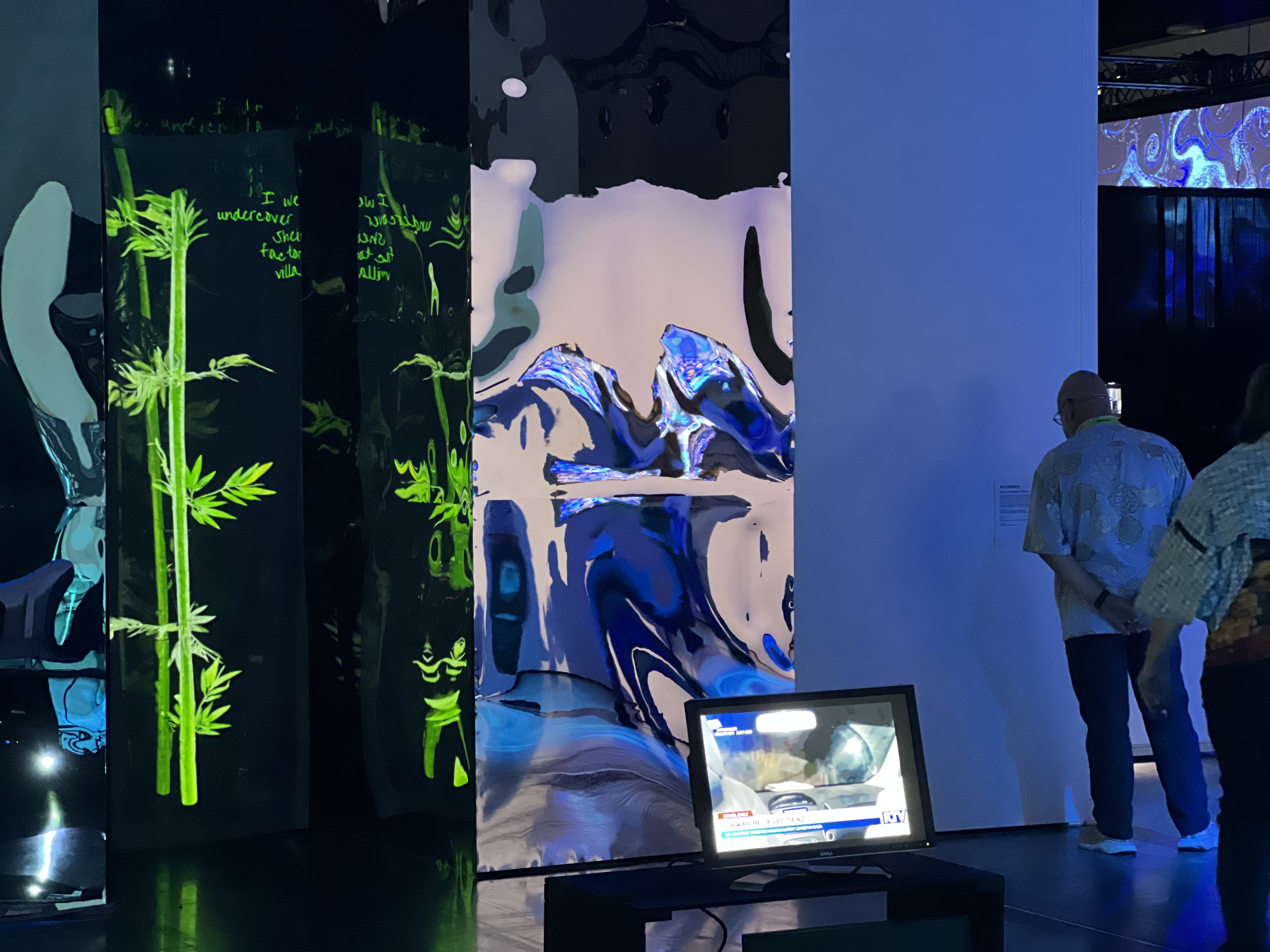 “摇曳”是一件融合影像爬取、情感计算与生成式视觉书写的互动影像装置,曾在中国广州(香港科技大学广州展示中心,2025),加拿大温哥华(温哥华国际会展中心,2025)和美国纽约(布兰克画廊,2025)展出。作品以“竹”作为贯穿历史的记录媒介隐喻,将其转化为可被算法不断刻写的“数字竹子”。系统持续从网络中爬取与“战争”相关的新闻文本与影像数据,通过情感分析算法识别其中的情绪倾向(如恐惧、愤怒、悲伤与紧张),并将这些情绪参数实时转译为刻写在虚拟竹表面的生成性笔触与动态纹理。每一次情感波动,都会转化为数字刻痕,叠加于竹的生长节律之中,使其成为不断被现实冲击重塑的“情感档案”。观众的介入会进一步扰动这一运算过程,使竹在环境中摆动、生长、变形,呈现出战争信息在数字时代的持续回响。作品以生成式书写替代静态记录,在技术、历史与集体情绪之间,构建一种不断被重写的记忆机制。