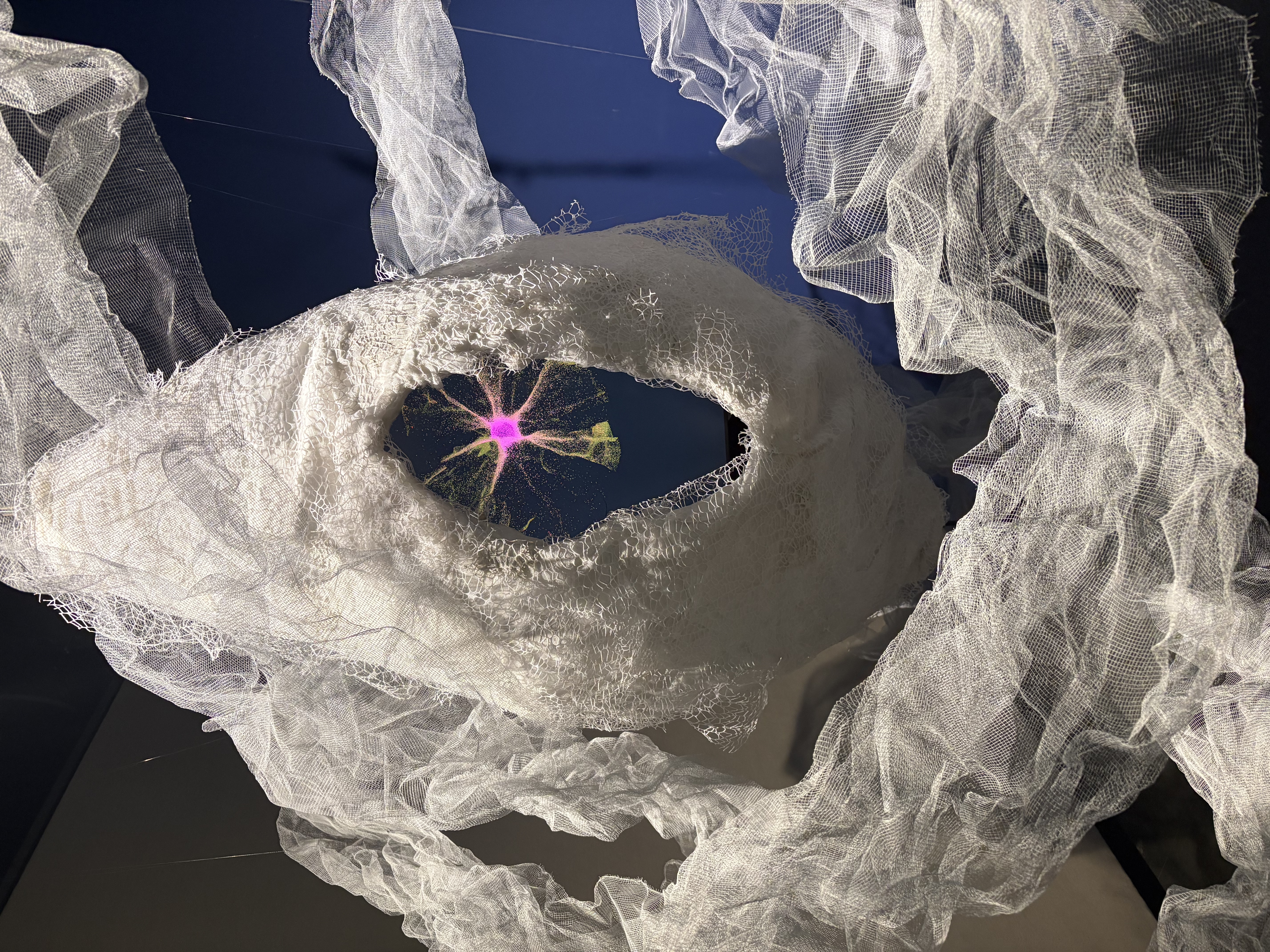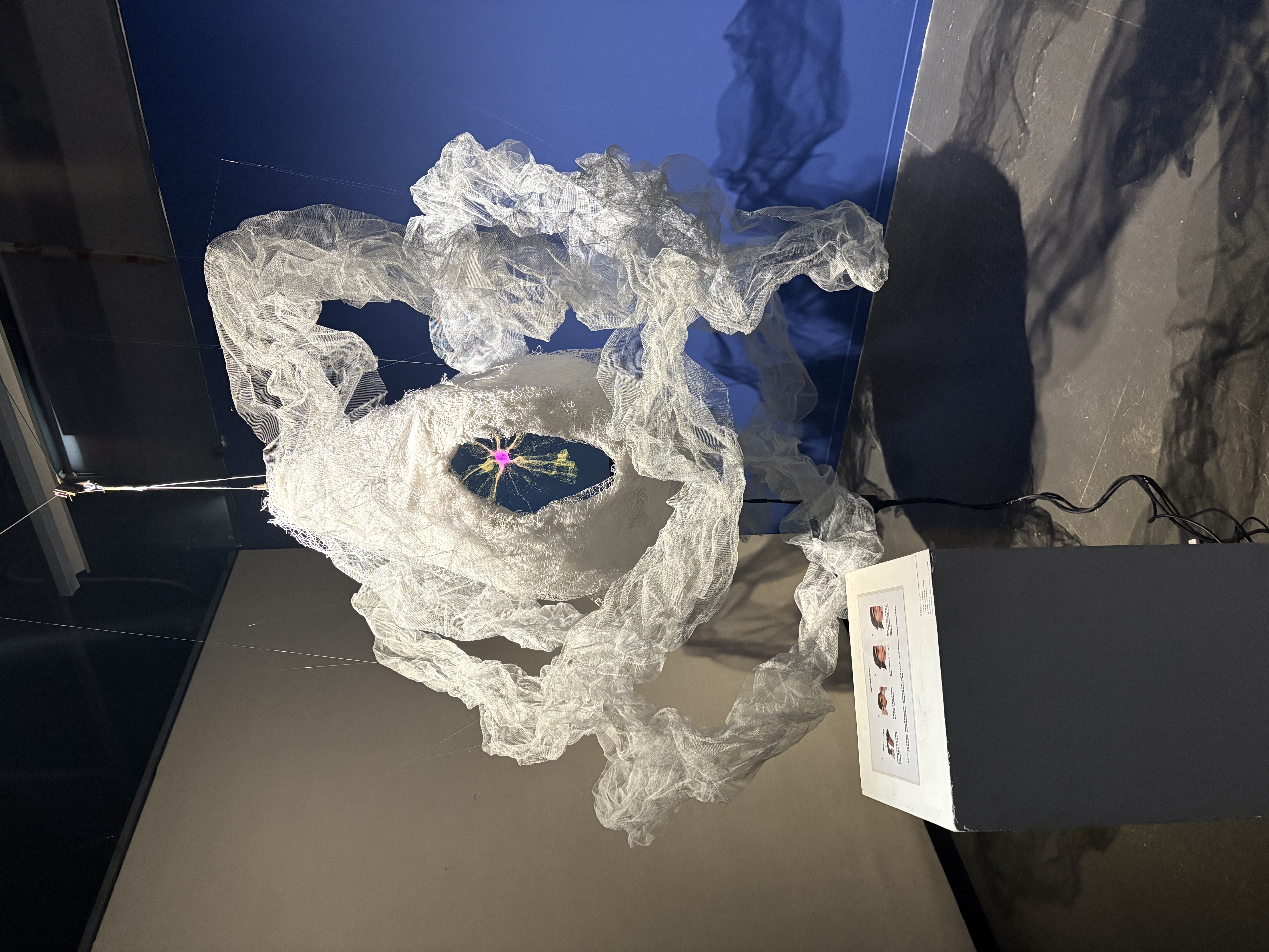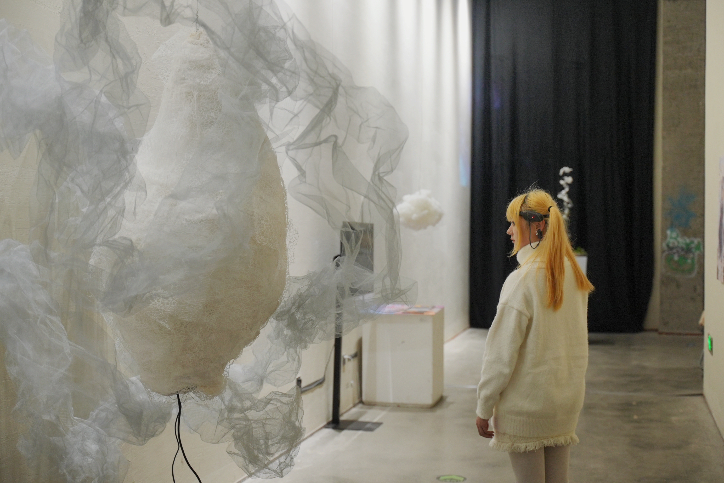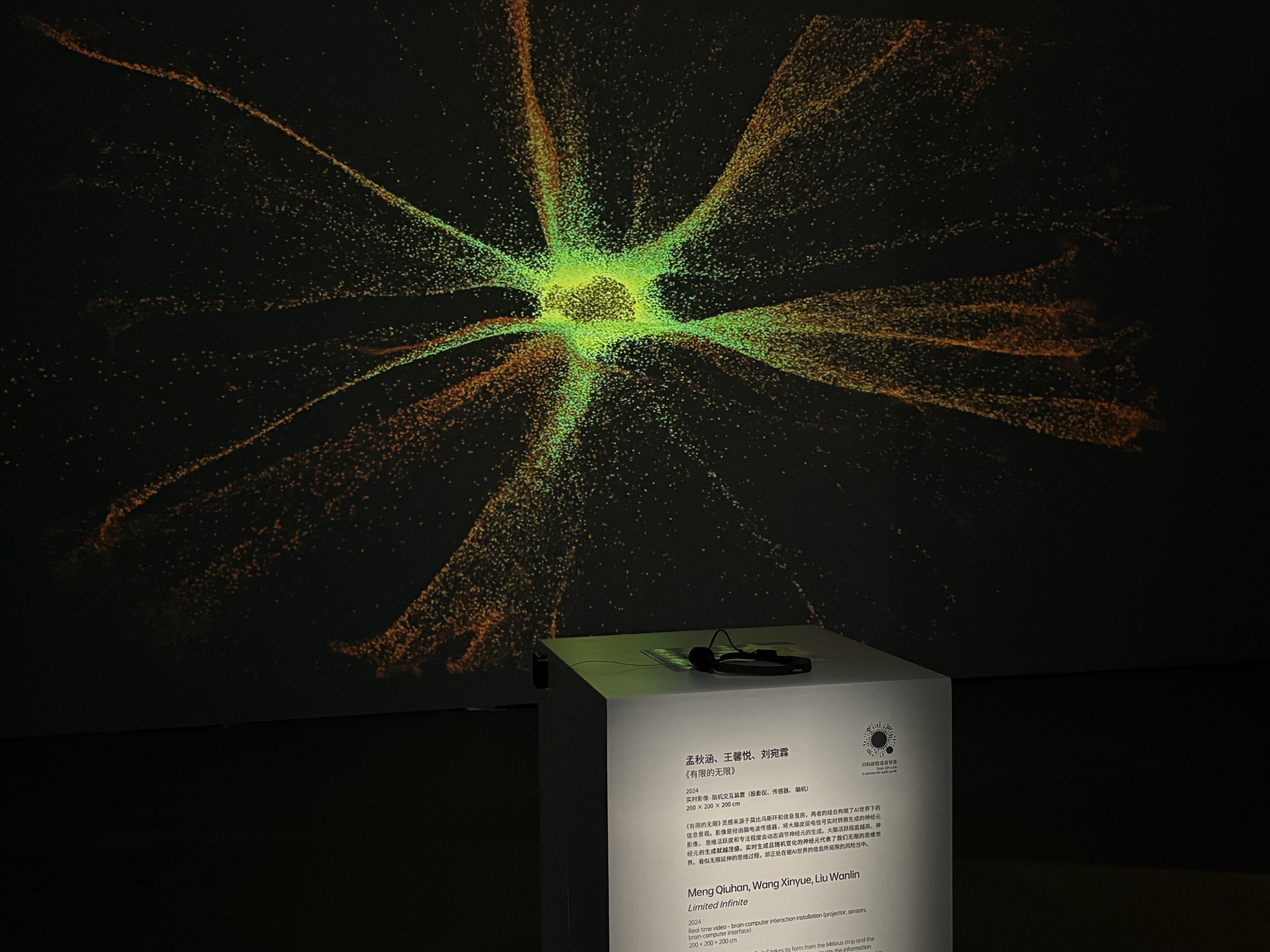 装置外形灵感来源于莫比乌斯环与信息茧房,,二者的结合构筑了AI时代下独特的信息景观。装置通过脑电波传感器实时捕捉观众的脑电信号,实时生成对应的神经元影像,并根据观众思维活跃度与专注程度动态调节神经元的生成,脑波振幅越大,神经元生成愈发蓬勃。——然而,在这看似无限延展的思维过程中,我们或许正面临着被AI信息世界所局限的风险当中。