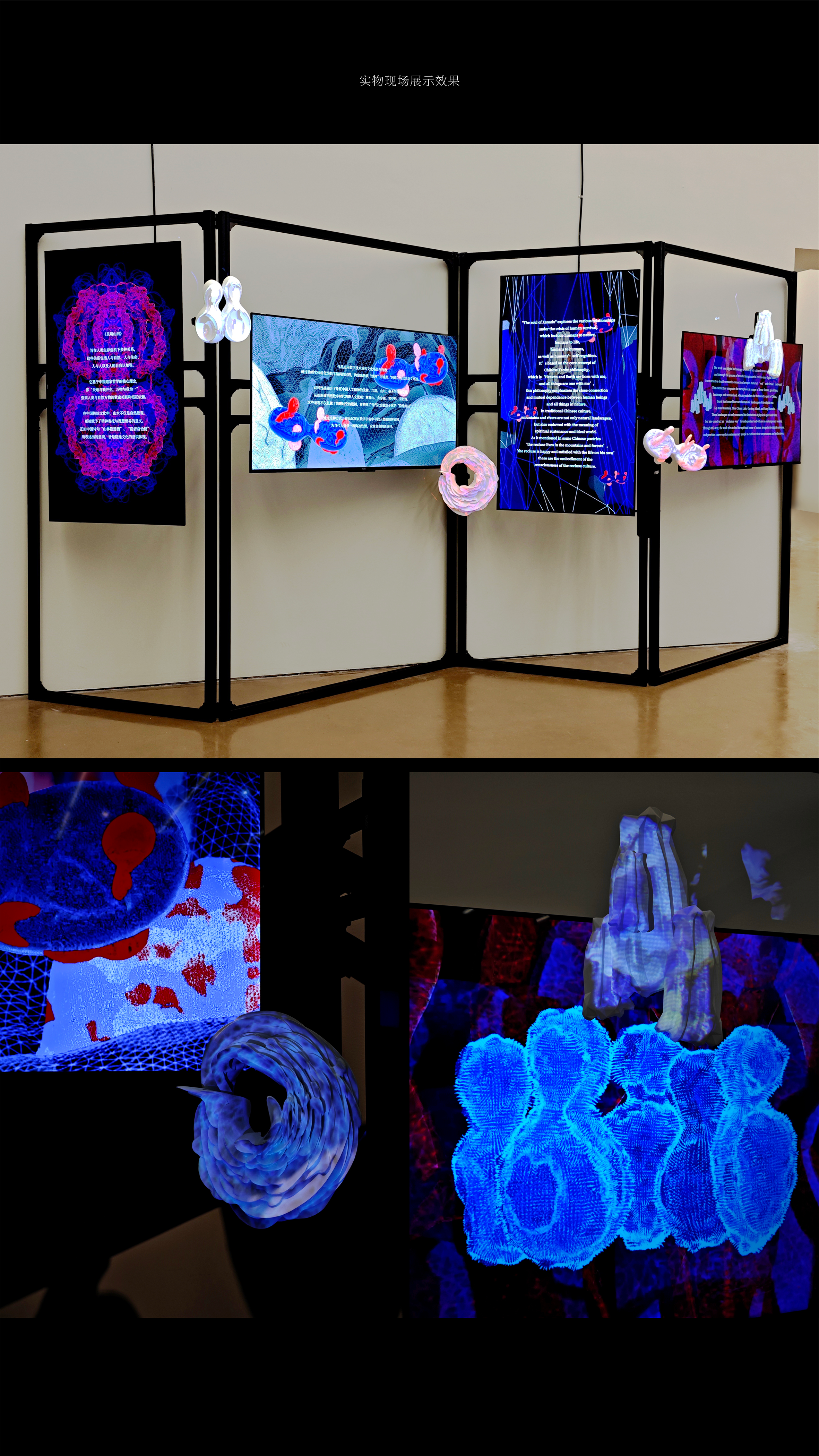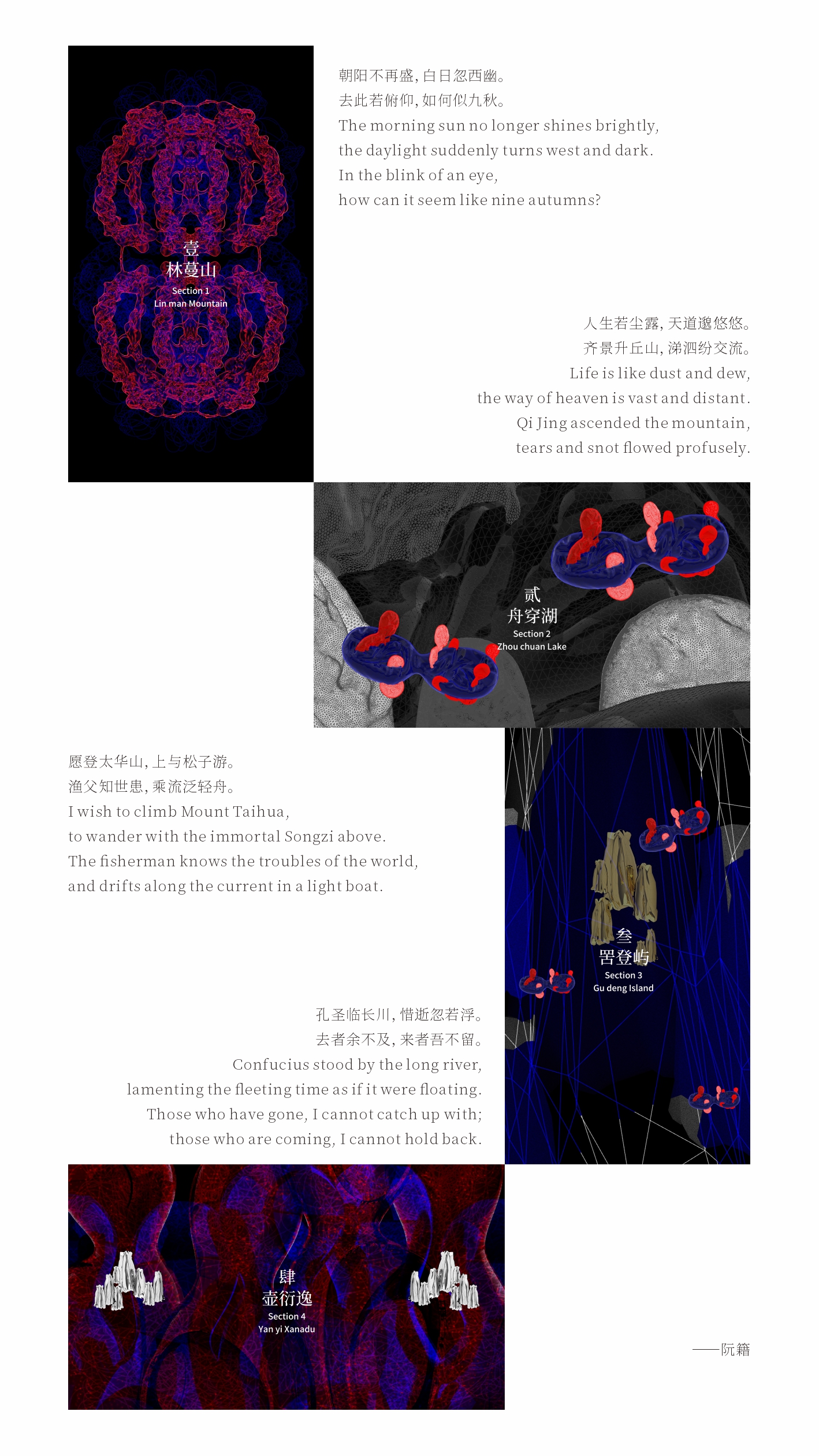 基于此,作品运用数字技术重构文化场景与内容,通过物质实体转化为数字编码的过程,构建出物质“线网”与虚拟“网络”的双关语义连接。这种连接融合了象征中国人文精神的茂林、江湖、山川、壶天等隐喻意象,从而形成四组数字时代的新人文景观:林蔓山、舟穿湖、罟登屿、壶衍逸。这些景观不仅超越了物理时空的限制,更构建了当代社会独立个体的“隐逸路径”。通过这种方式,作品试图在数字宇宙中寻找人类的精神家园,为当代人提供一种陶冶性情、安身立命的新途径。
