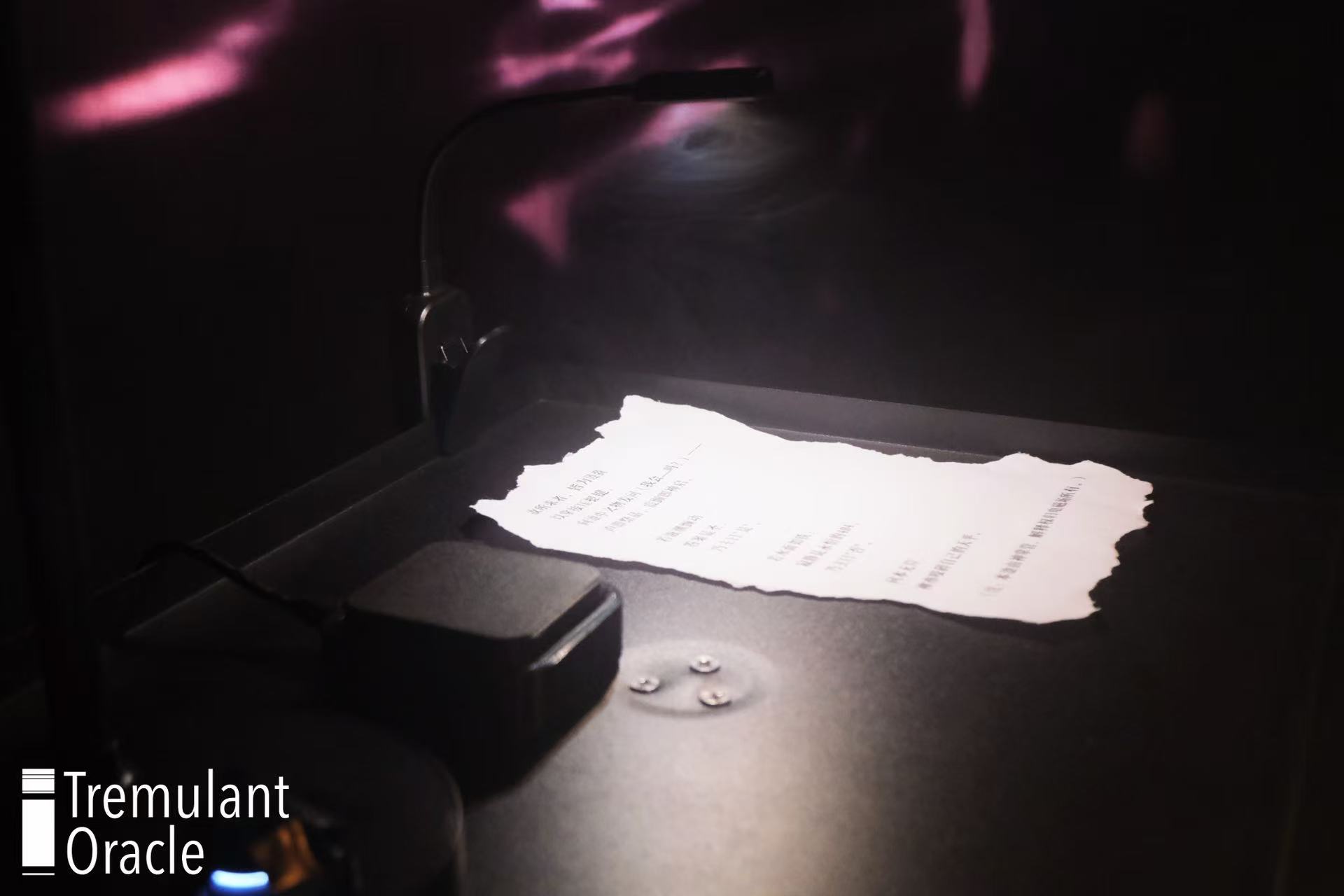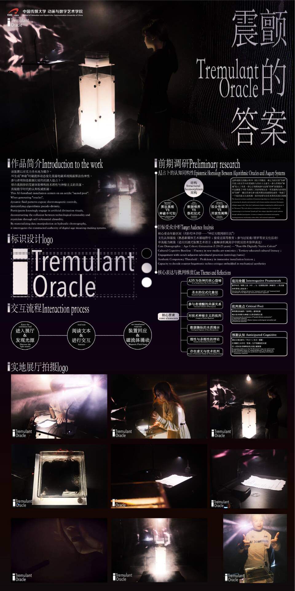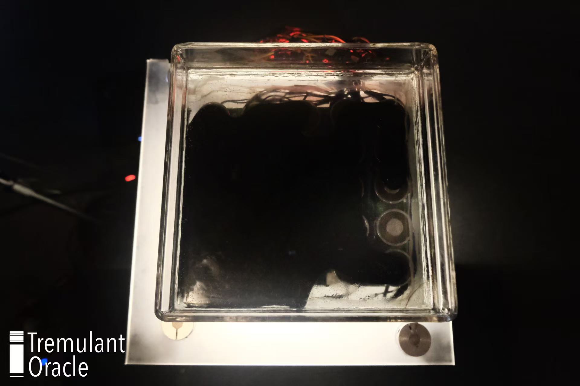 作品的灵感来源于在当下ai占卜非常的火热,或许ai这种理性的科学算法在某种程度上是一种新型的非理性存在。 特点是AI处理问题时,磁流体随算法涌动时暴露透明池底下的计算机数据线、电子元件等统计学本质,参与者明知这是人工产物,仍愿参与这场游戏。作品打破 AI “理性工具” 的常规认知,批判算法的虚假权威性。