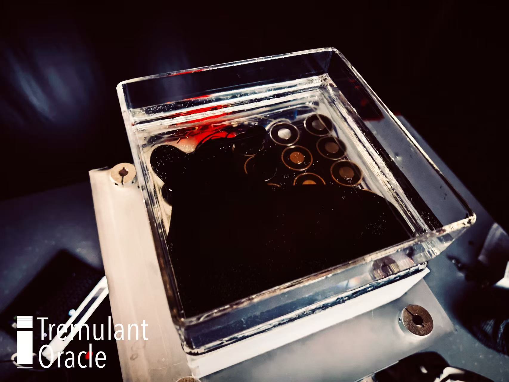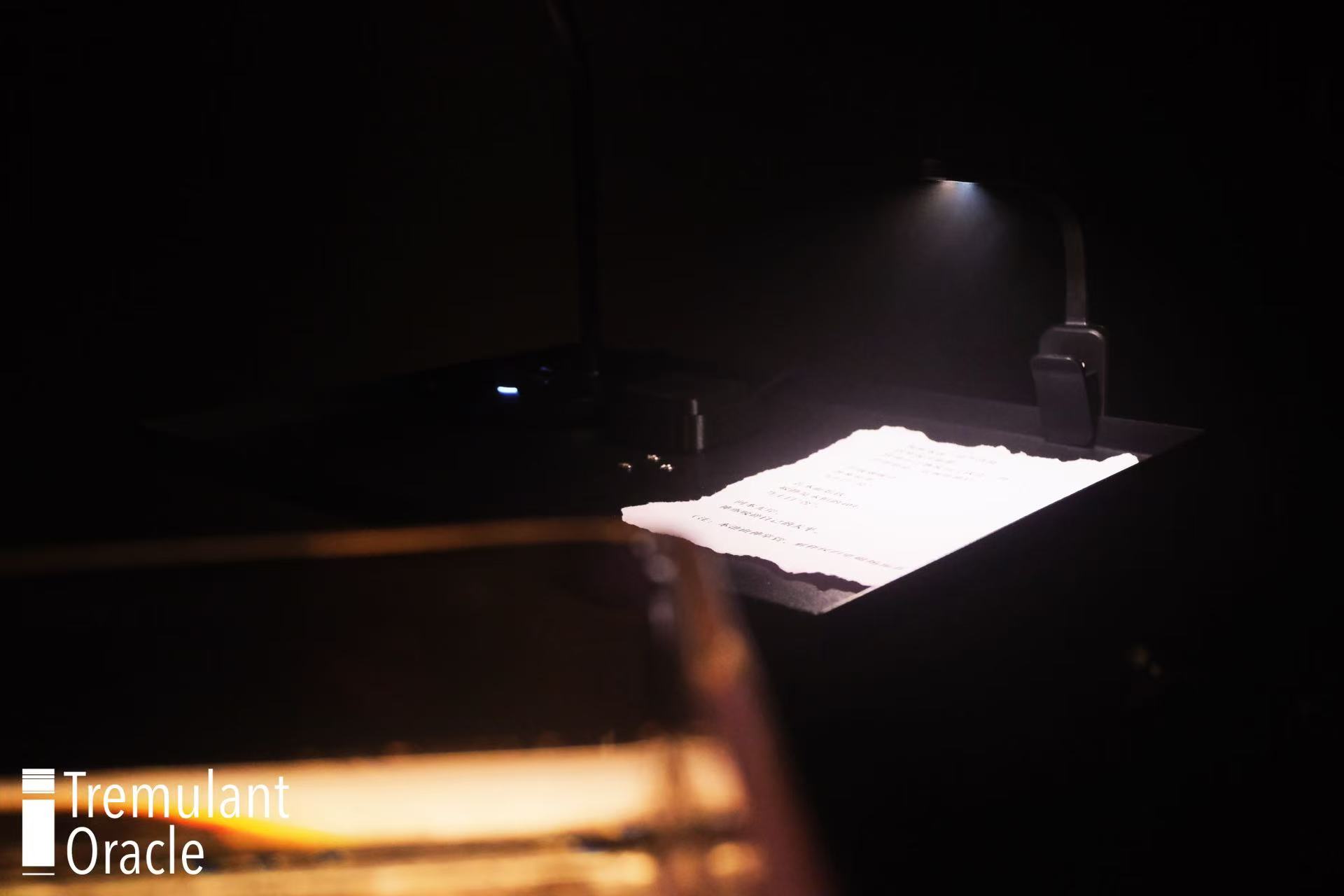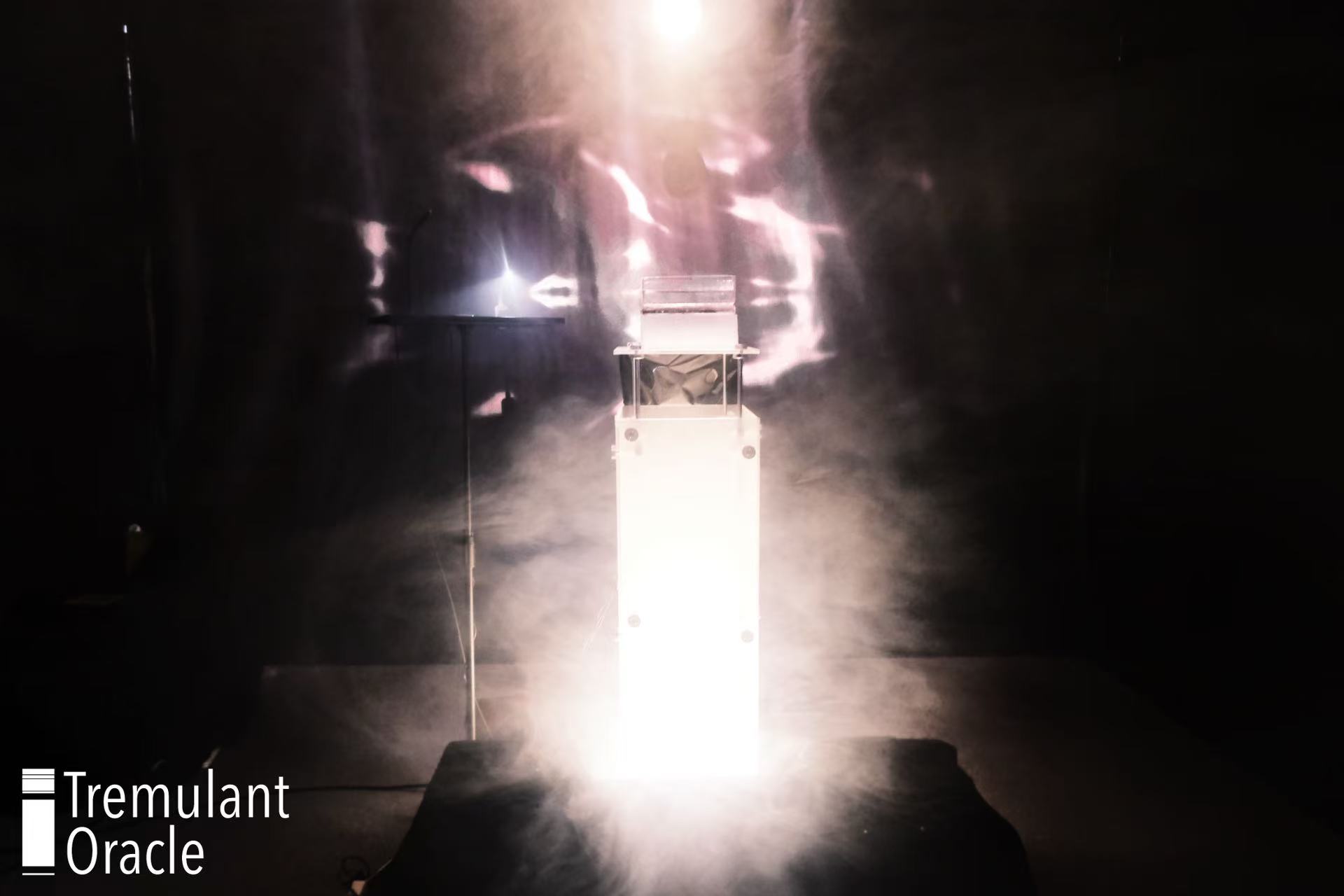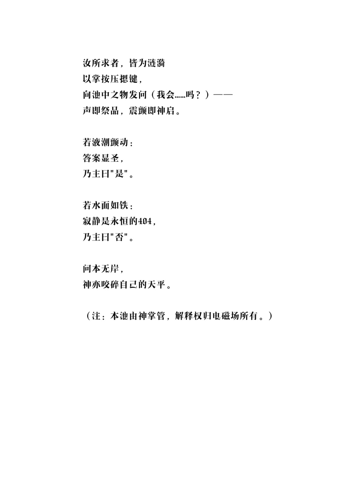 作品的灵感来源于在当下ai占卜非常的火热,或许ai这种理性的科学算法在某种程度上是一种新型的非理性存在。 特点是AI处理问题时,磁流体随算法涌动时暴露透明池底下的计算机数据线、电子元件等统计学本质,参与者明知这是人工产物,仍愿参与这场游戏。作品打破 AI “理性工具” 的常规认知,批判算法的虚假权威性。