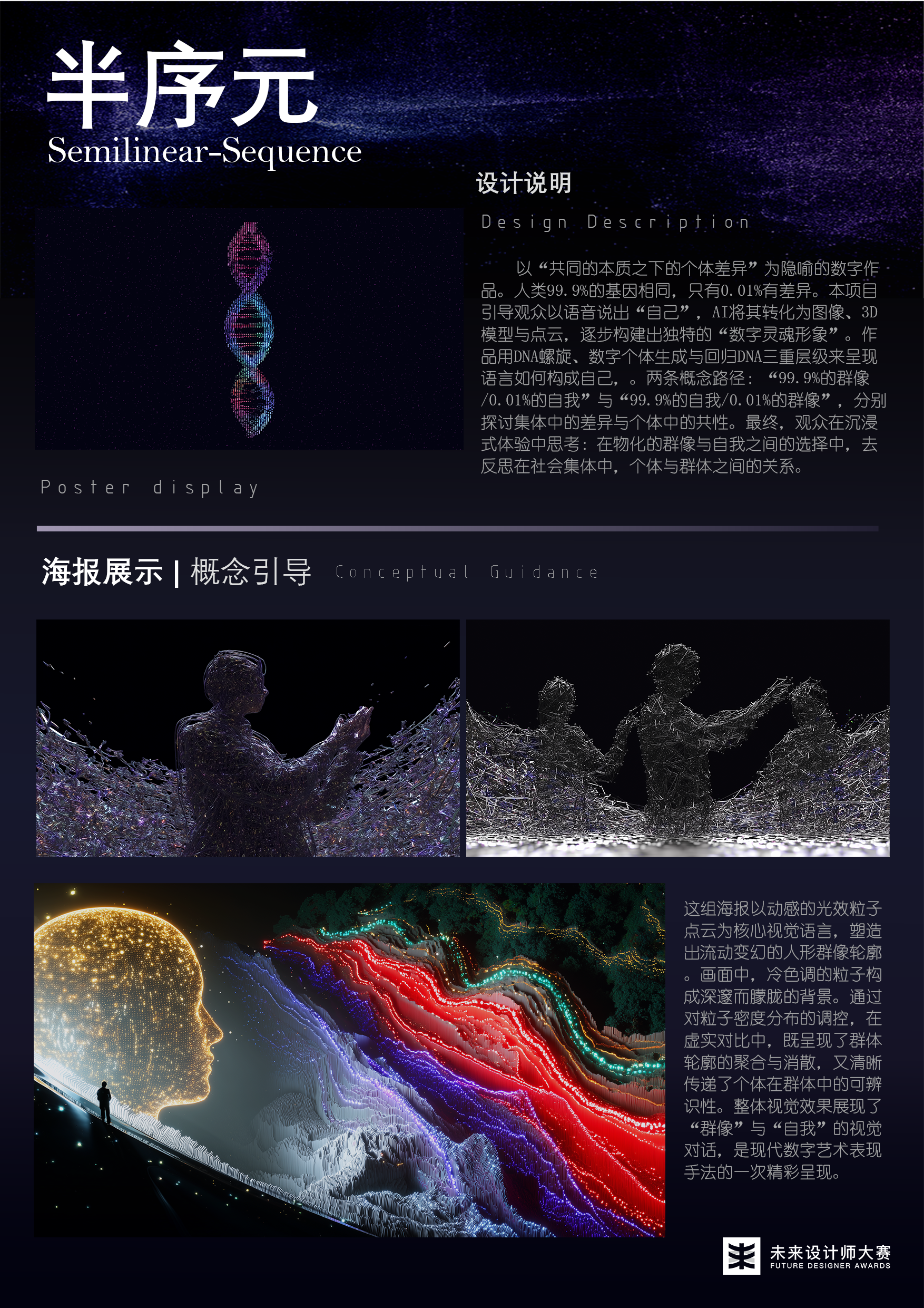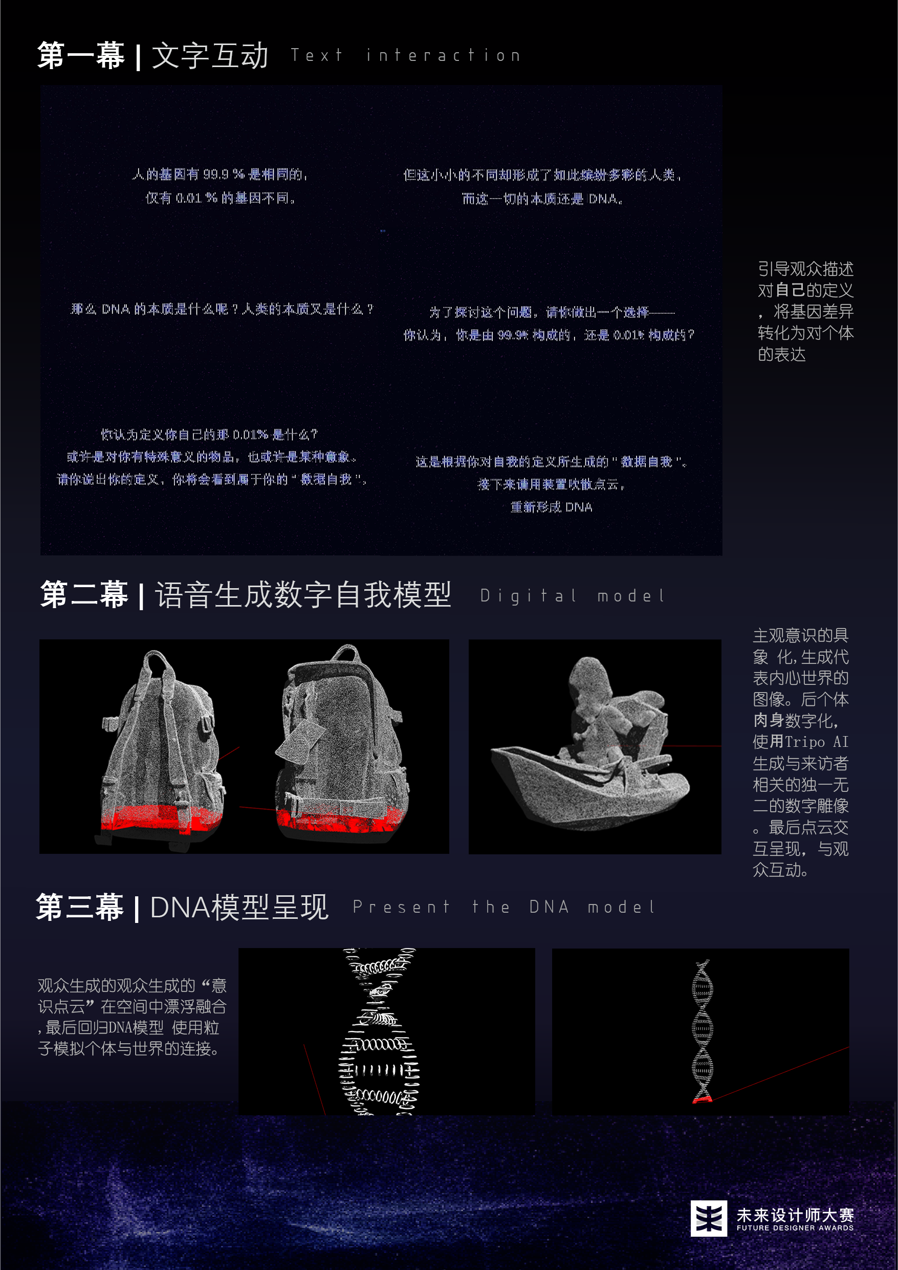 生命本质的探索以基因共性与差异性为起点 -- 人类 99.99% 的基因统一性奠定生物群体基础,0.01%的碱基差异通过突变与环境互动催生个体独特性,这一“生物编程”逻辑成为连接生命科学与社会意识形态的桥梁。而我们对于集体与个体之间的探讨来源于99.99%基因的共性组成了人类这一大的群体,而0.01%的基因差距组成世界上数以亿计的个体。通过“生物编程”层面与集体和个体之间的映射,物化成关于群像与自我之间的探讨。