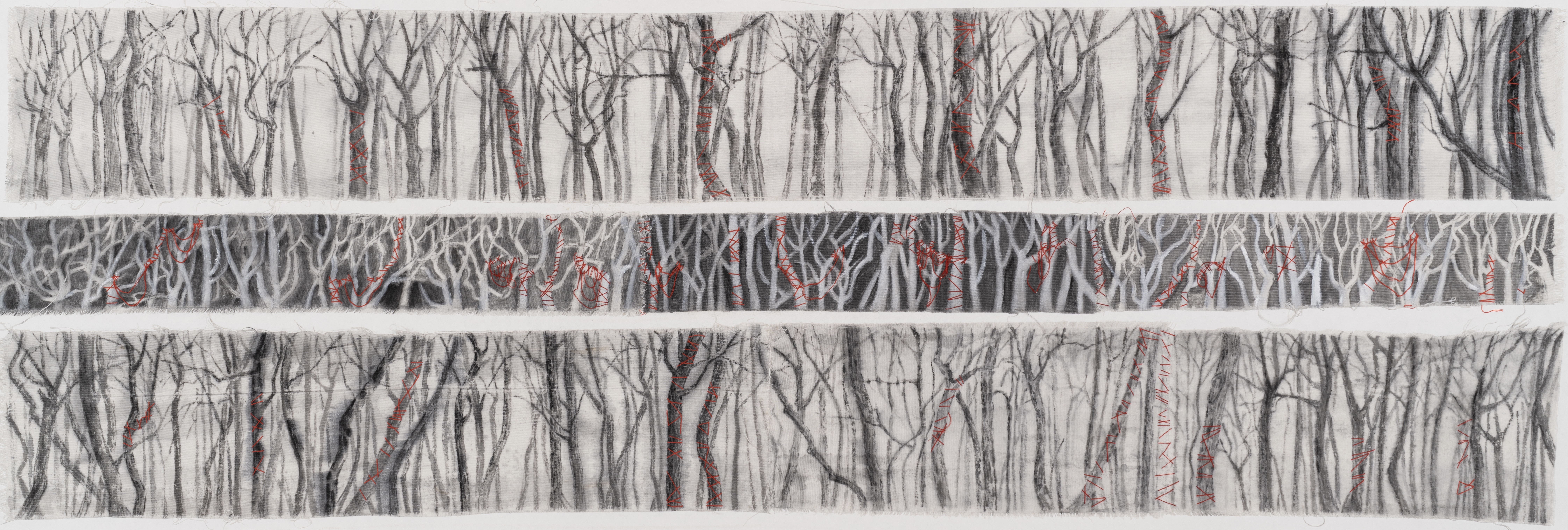 画面中的树以浓墨、淡墨、留白交织而成。呈现出一种真实又抽象,似真似幻的生长状态,缠绕在枝干之间的红线,像血管、像伤痕、像牵连、是某种不可拒绝的联系。