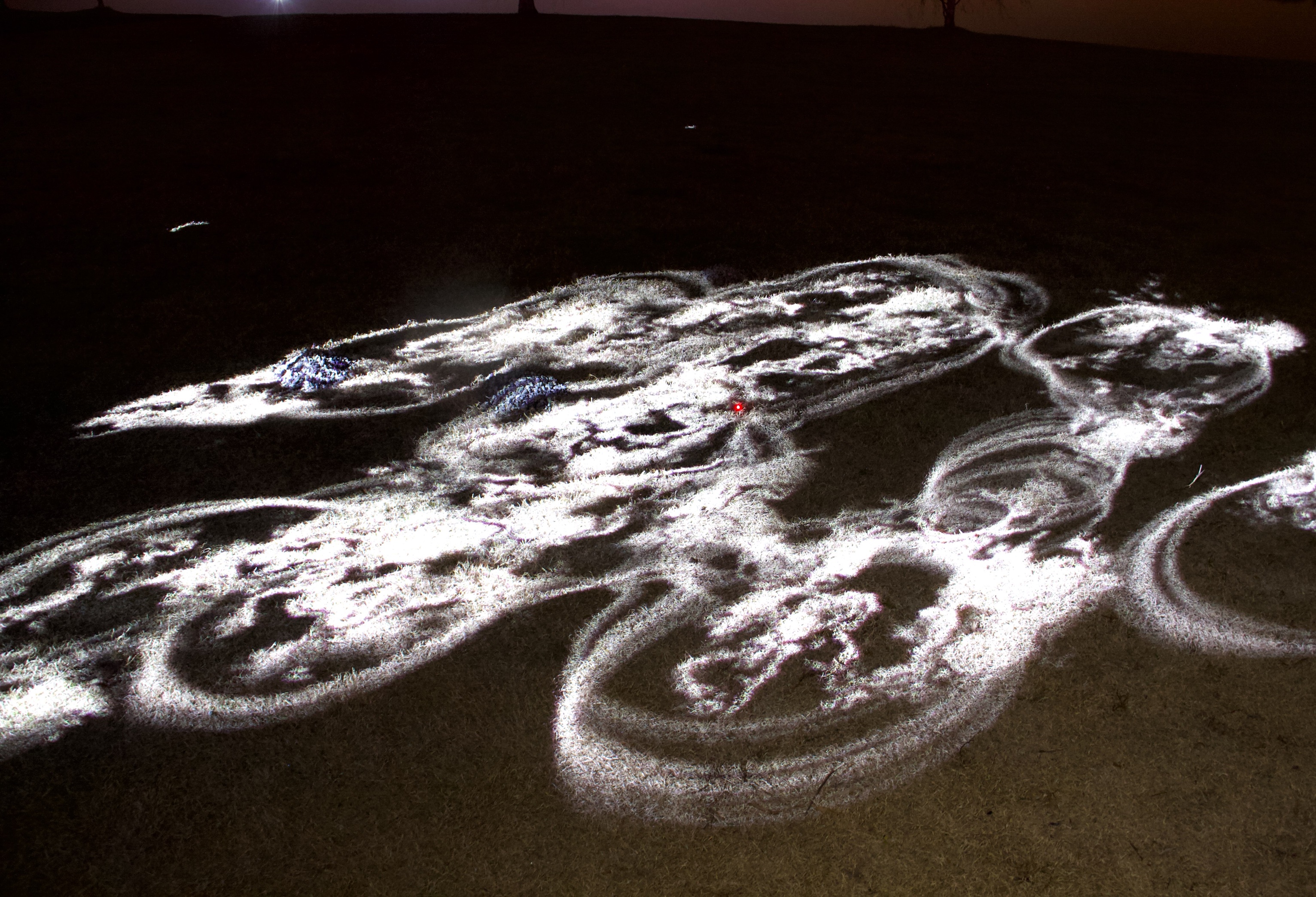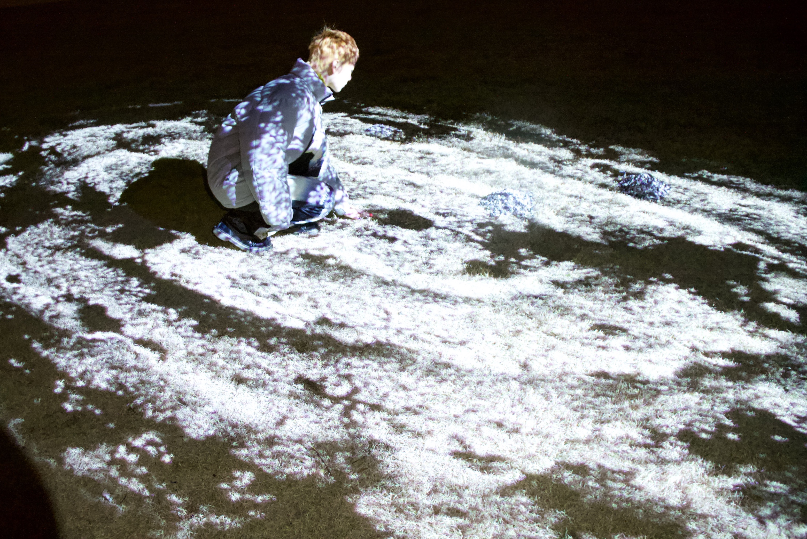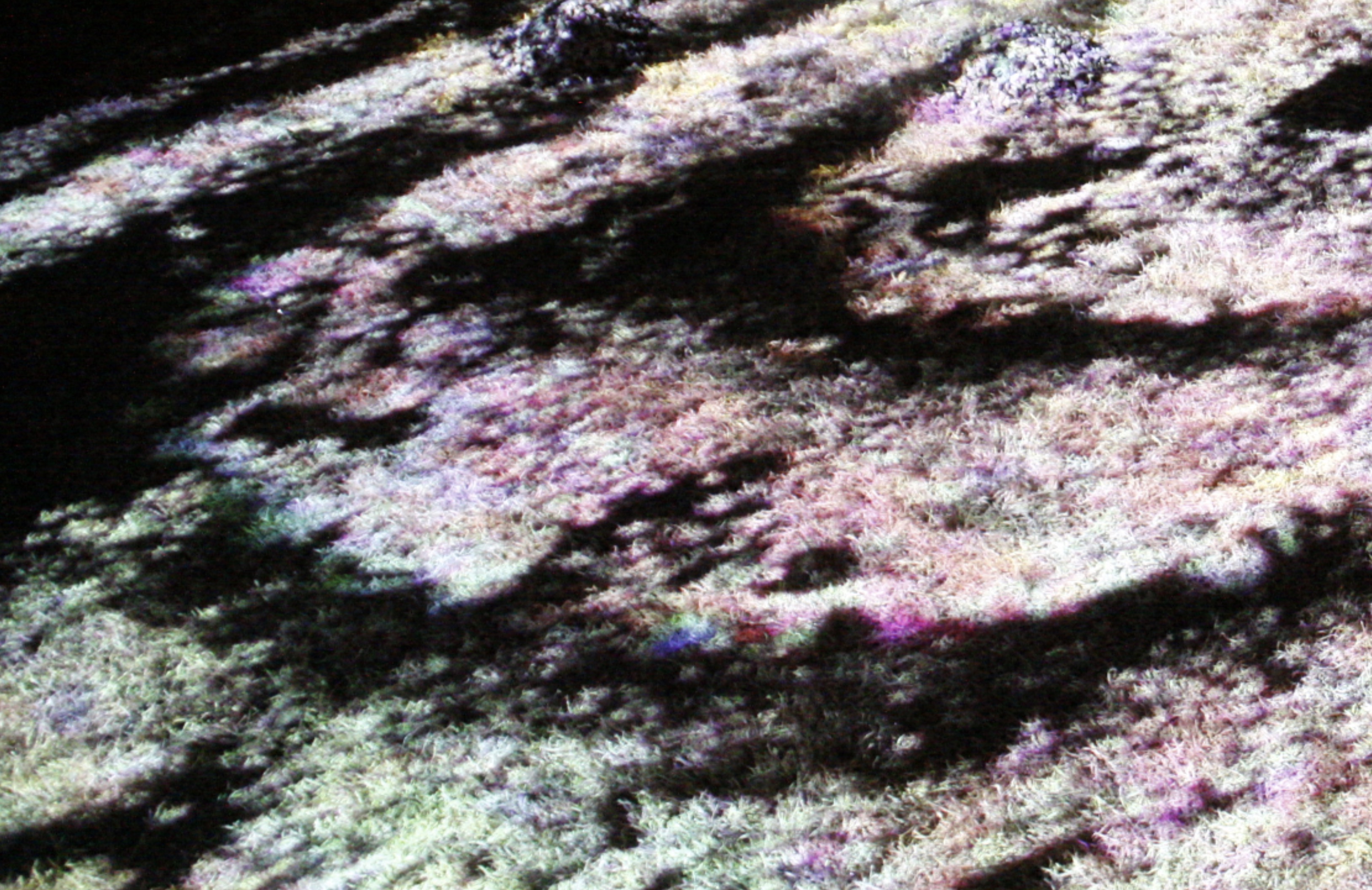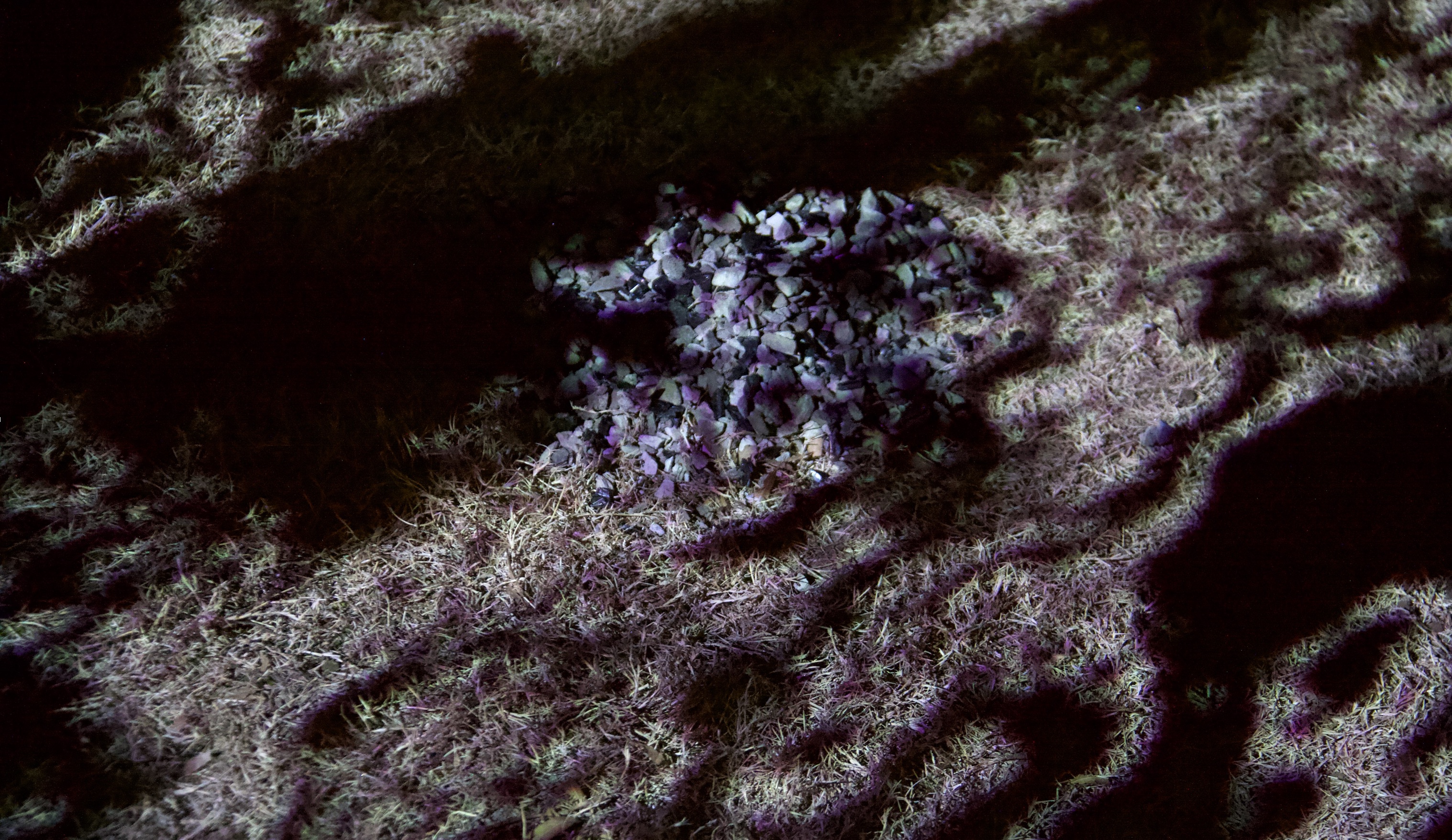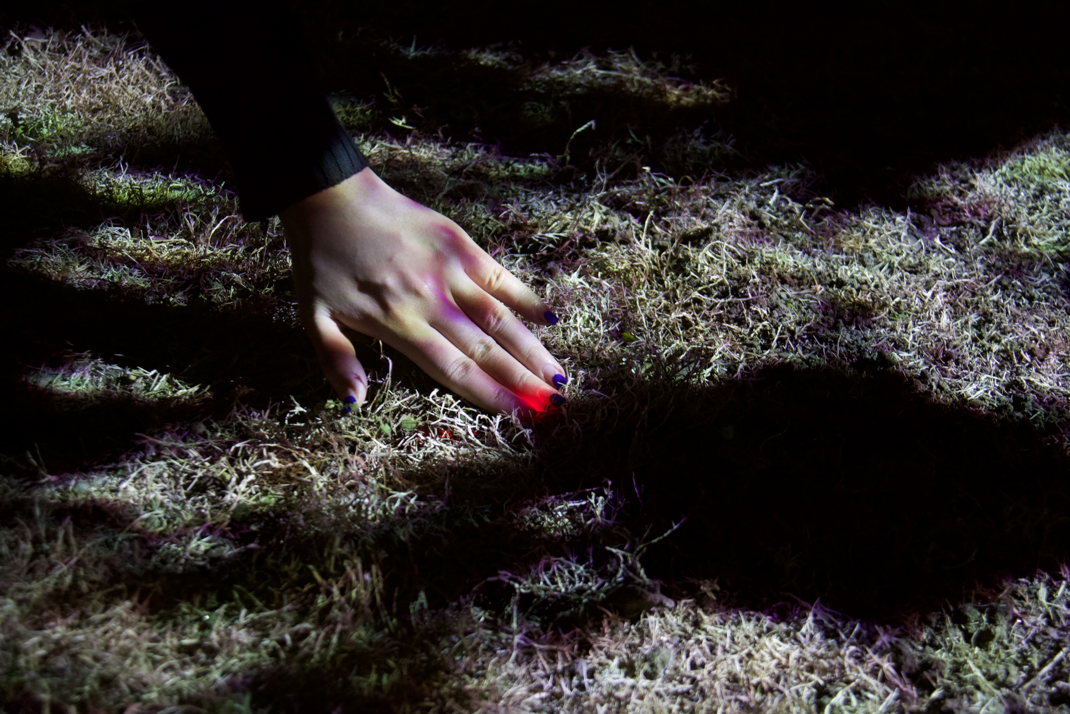 容器,经流,阻碍物(作品现场图),2021 Arduino、定制电路、血液脉搏传感器、废弃塑料、泥土砂石、投影仪 ; 600 × 800 cm 尺寸可变