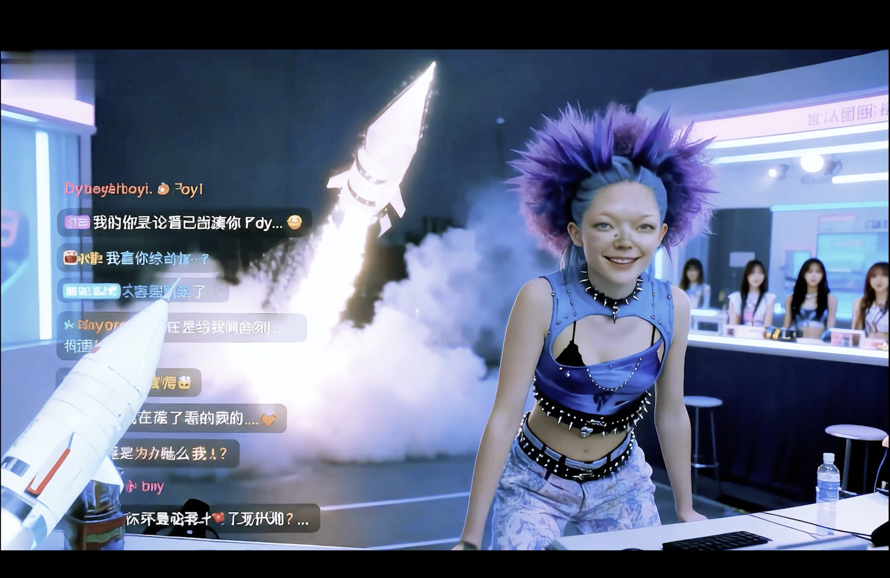 短片从“团播生态”切入,旨在揭示网络团播背后的隐秘逻辑:一个以情绪为流通单位的数字市场。观众支付购买的并非简单的娱乐,而是一种“被看见”的权力幻觉。短片通过高饱和度低保真色彩和与冷峻的数据蓝灰调之间的视觉切换,构建其美学核心。