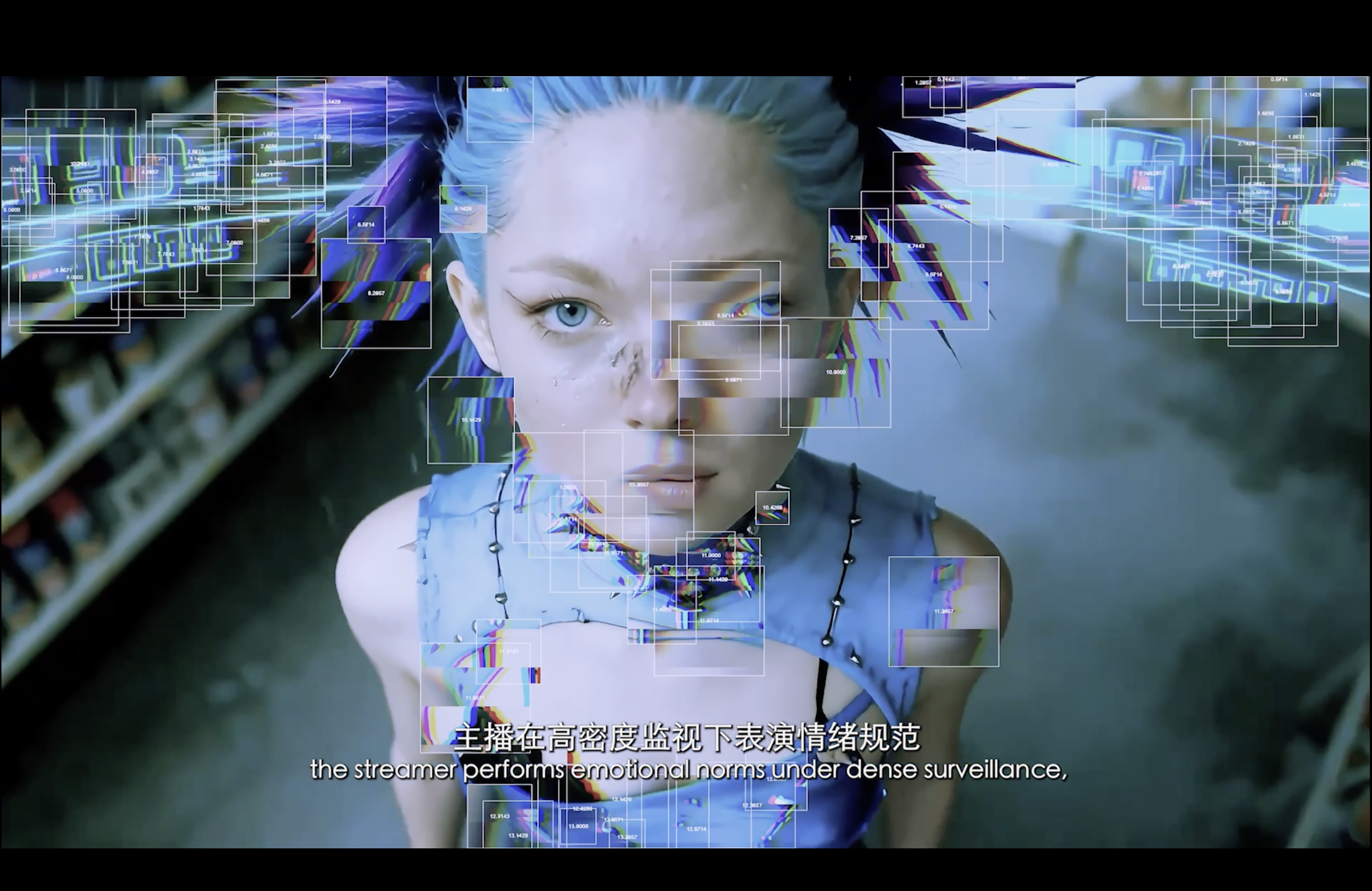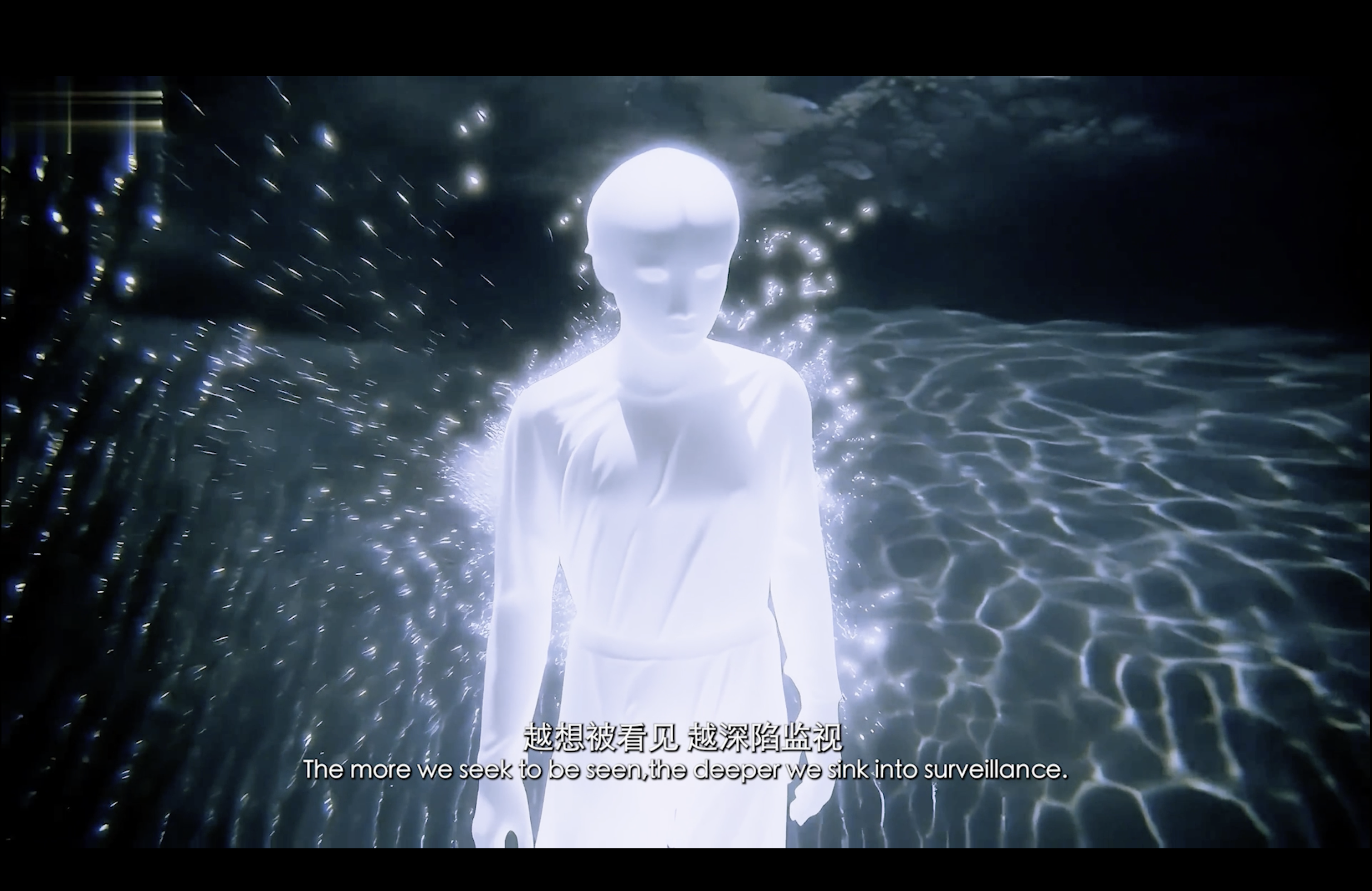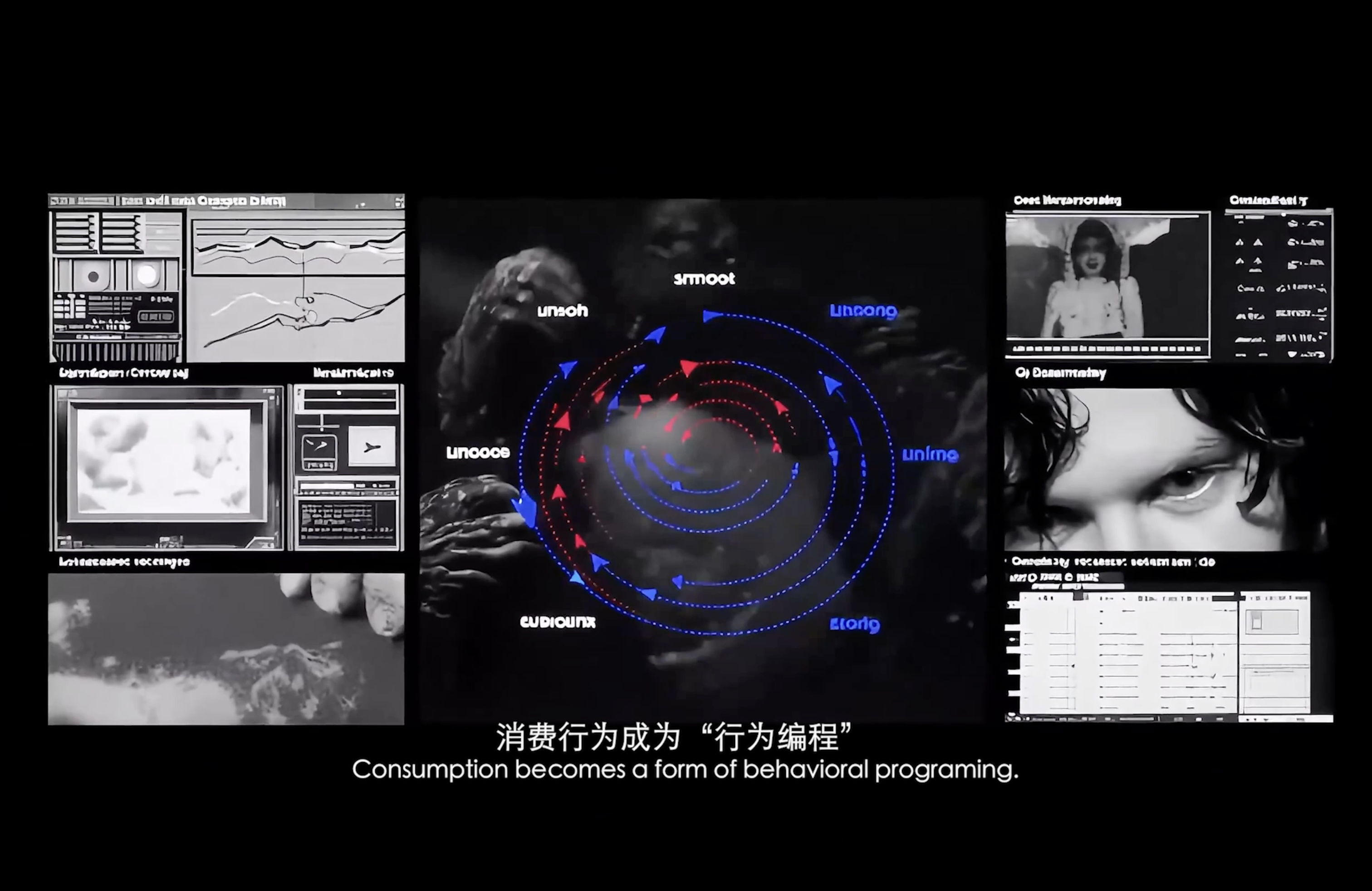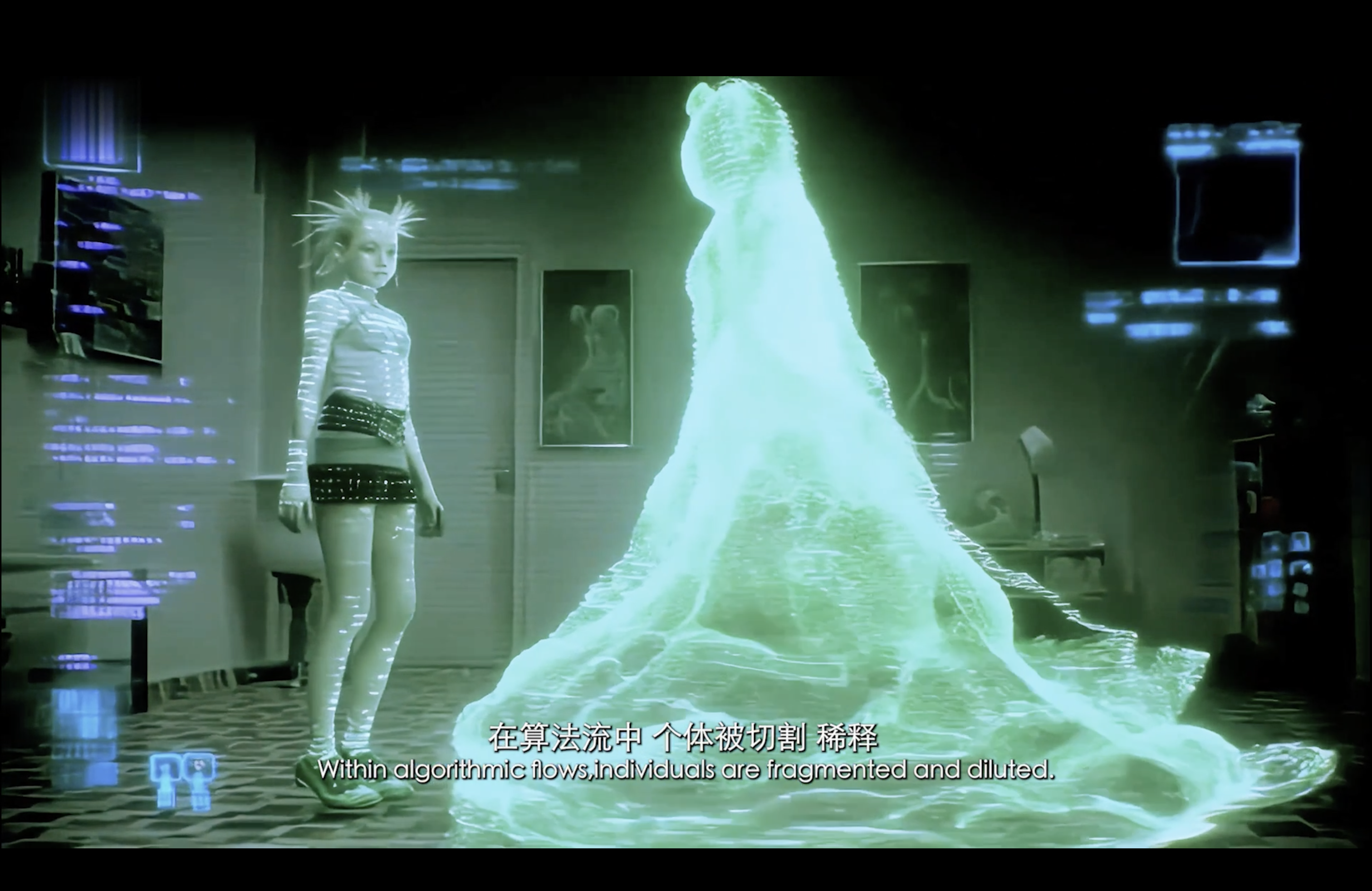 通过现代诗作为作品旁白,揭示了在“后全景敞视主义”时代,权力弥散为无处不在的界面与算法。我们通过“量化自我”进入这结构。我们消费着对他人行为进行编程的幻觉,自身的情感和体验也在过程中被持续数据化、调节,最终生成平滑可流通的“数字孪生”。