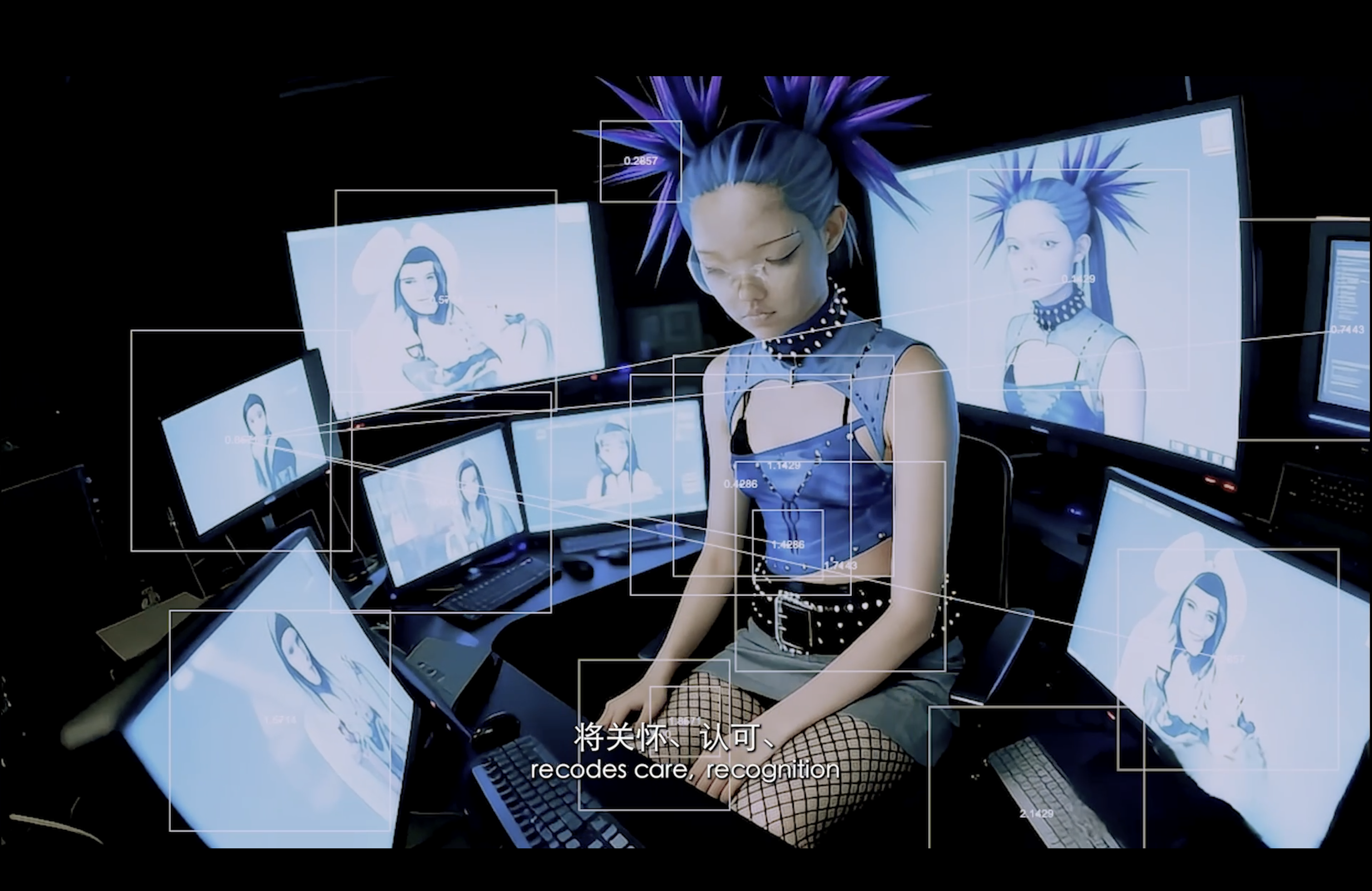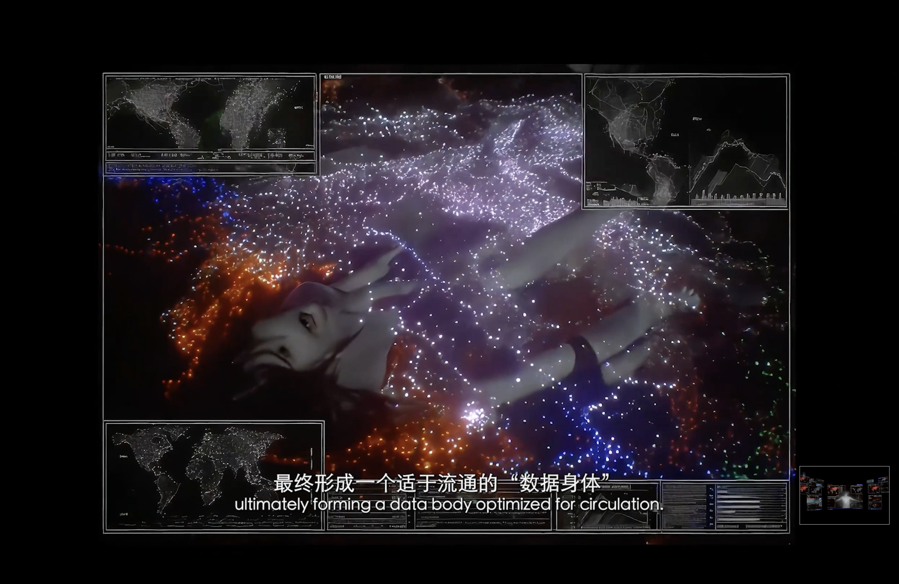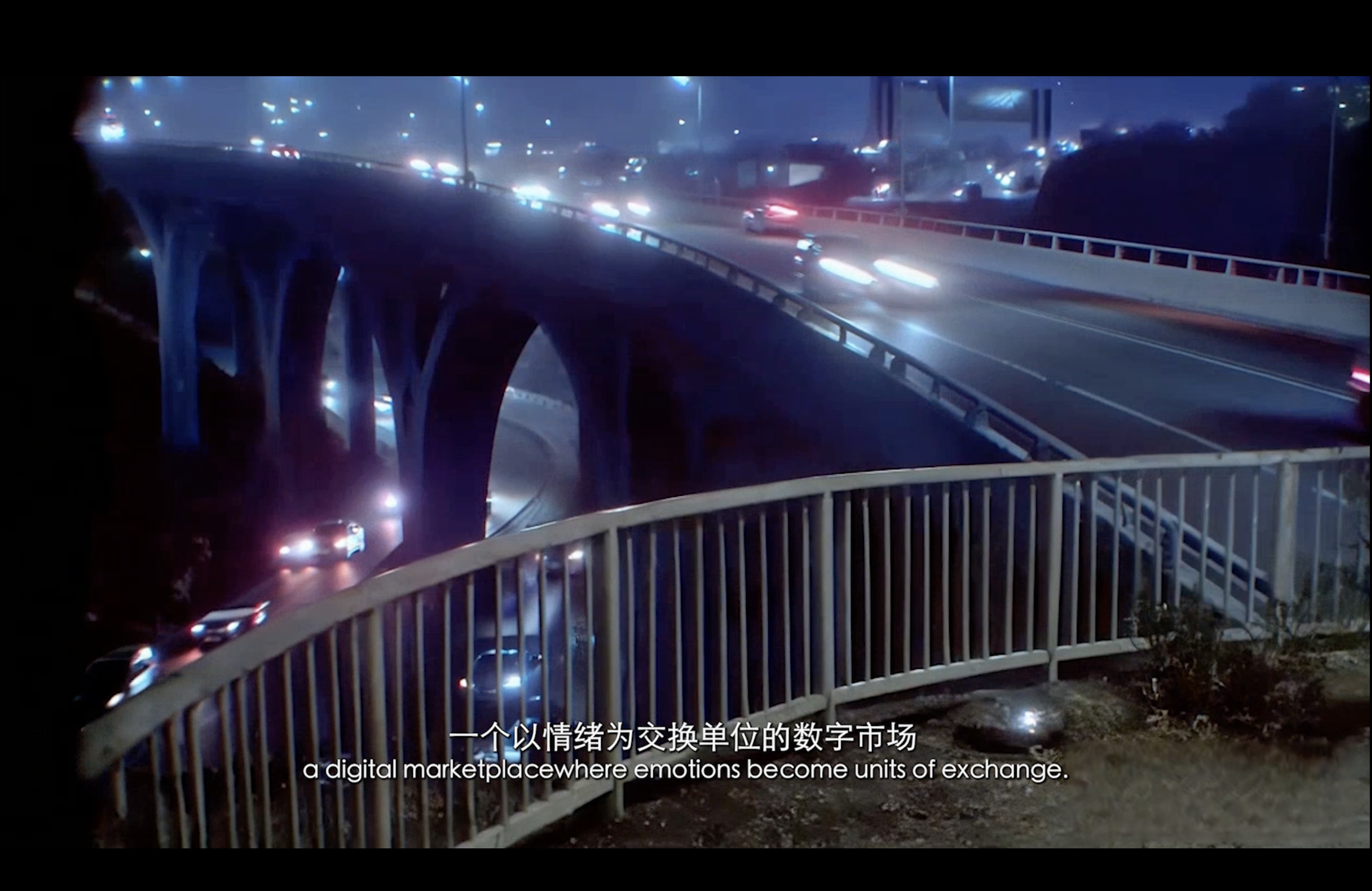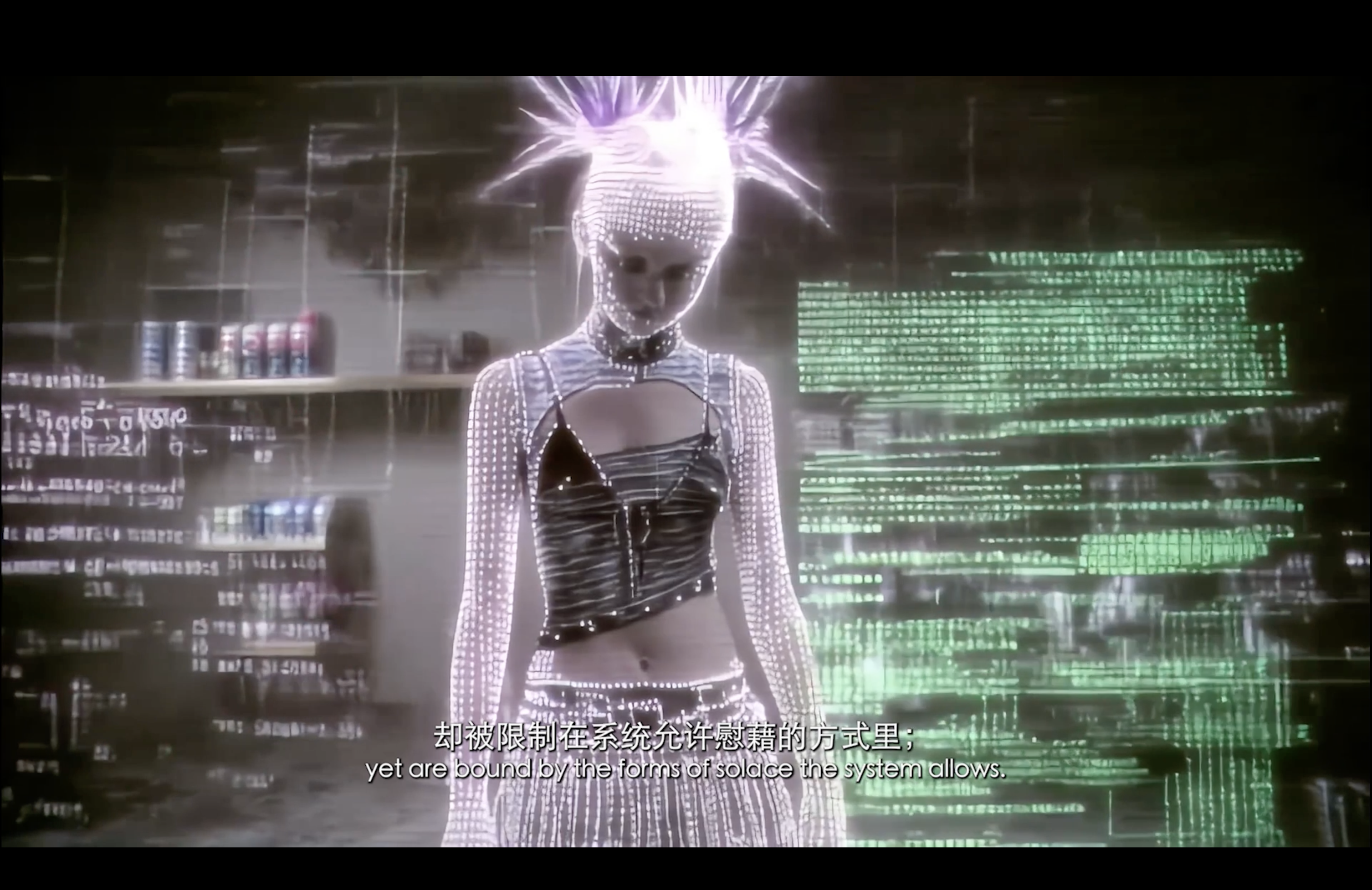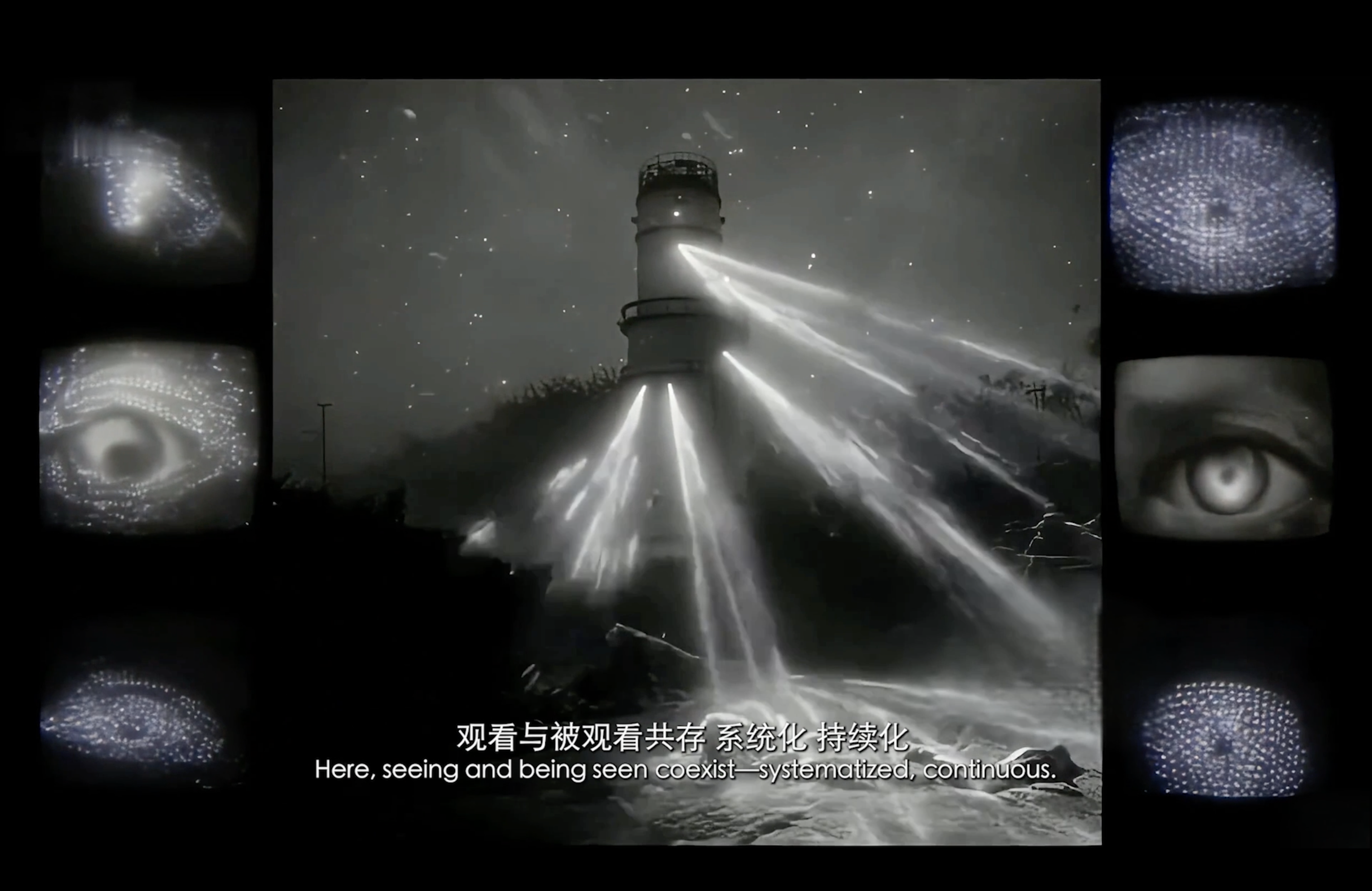 通过现代诗作为作品旁白,揭示了在“后全景敞视主义”时代,权力弥散为无处不在的界面与算法。我们通过“量化自我”进入这结构。我们消费着对他人行为进行编程的幻觉,自身的情感和体验也在过程中被持续数据化、调节,最终生成平滑可流通的“数字孪生”。