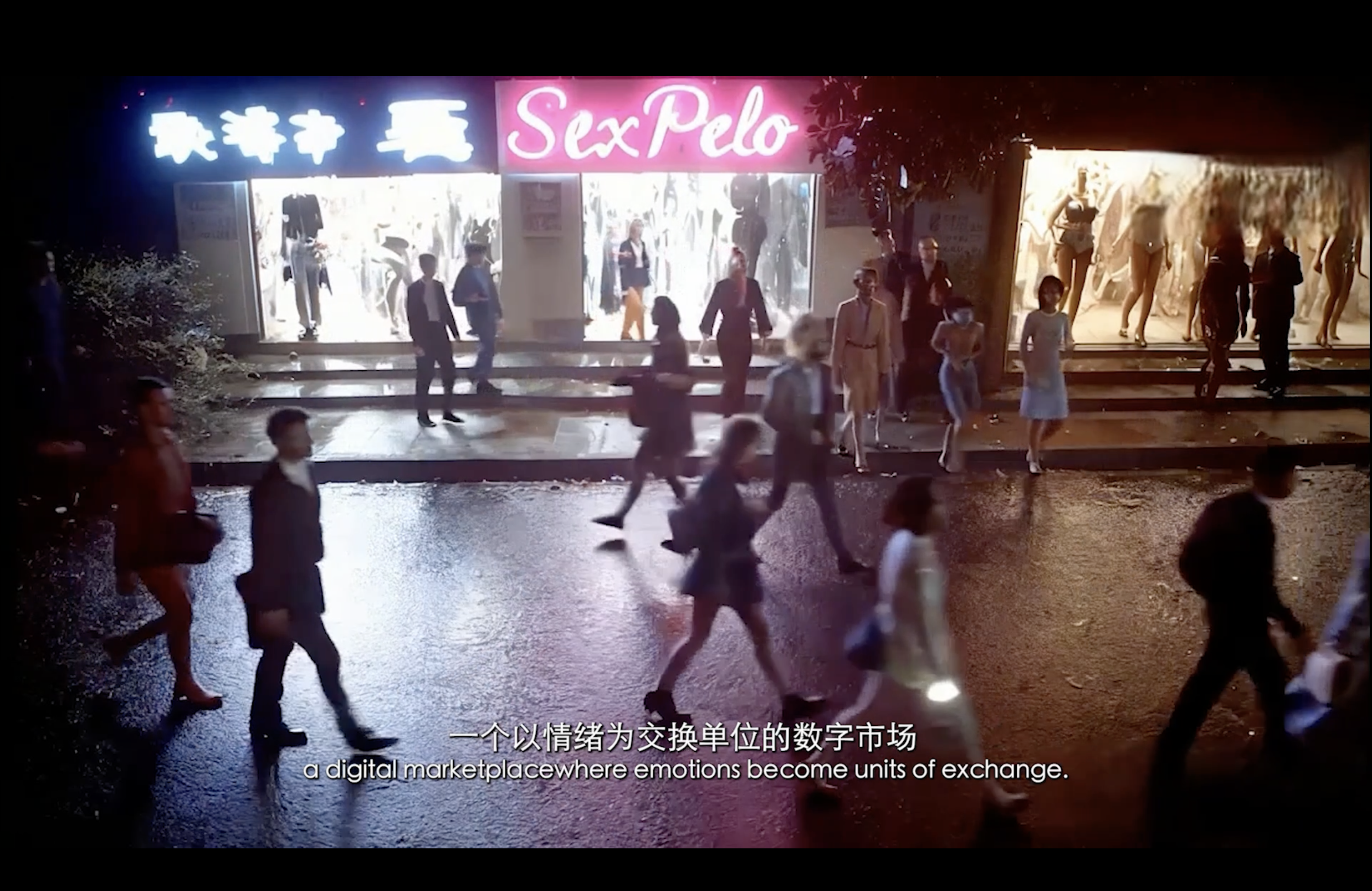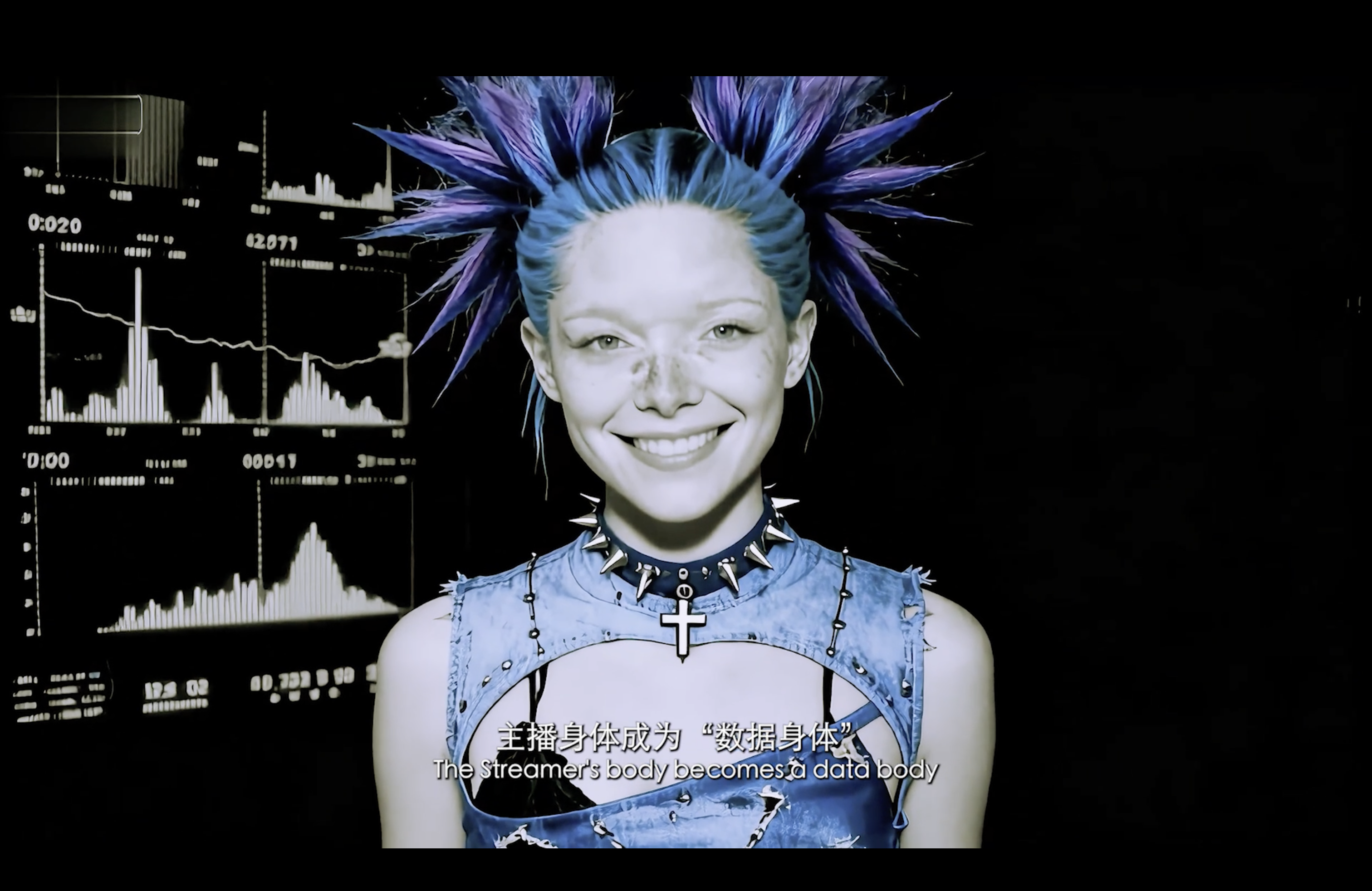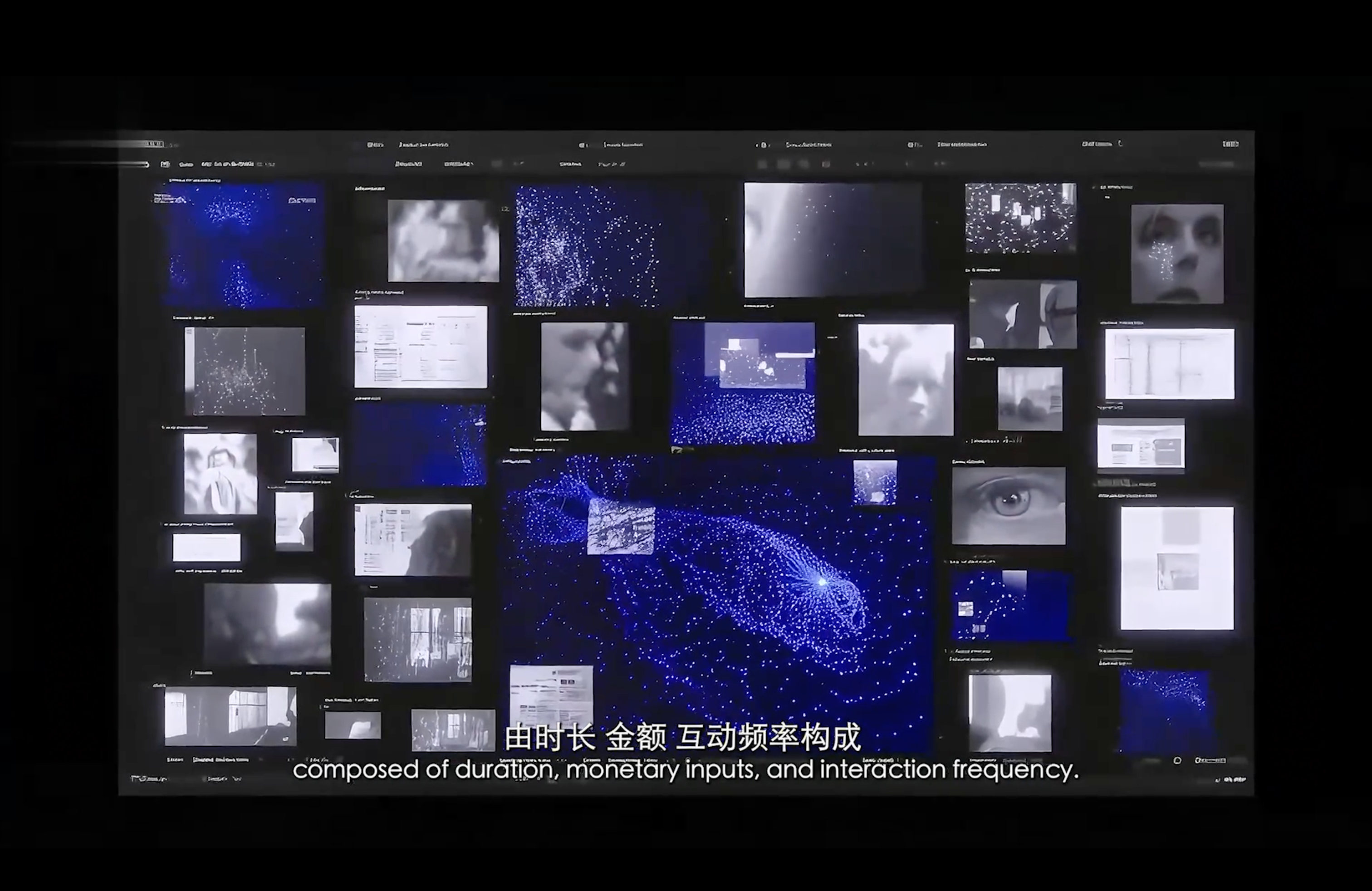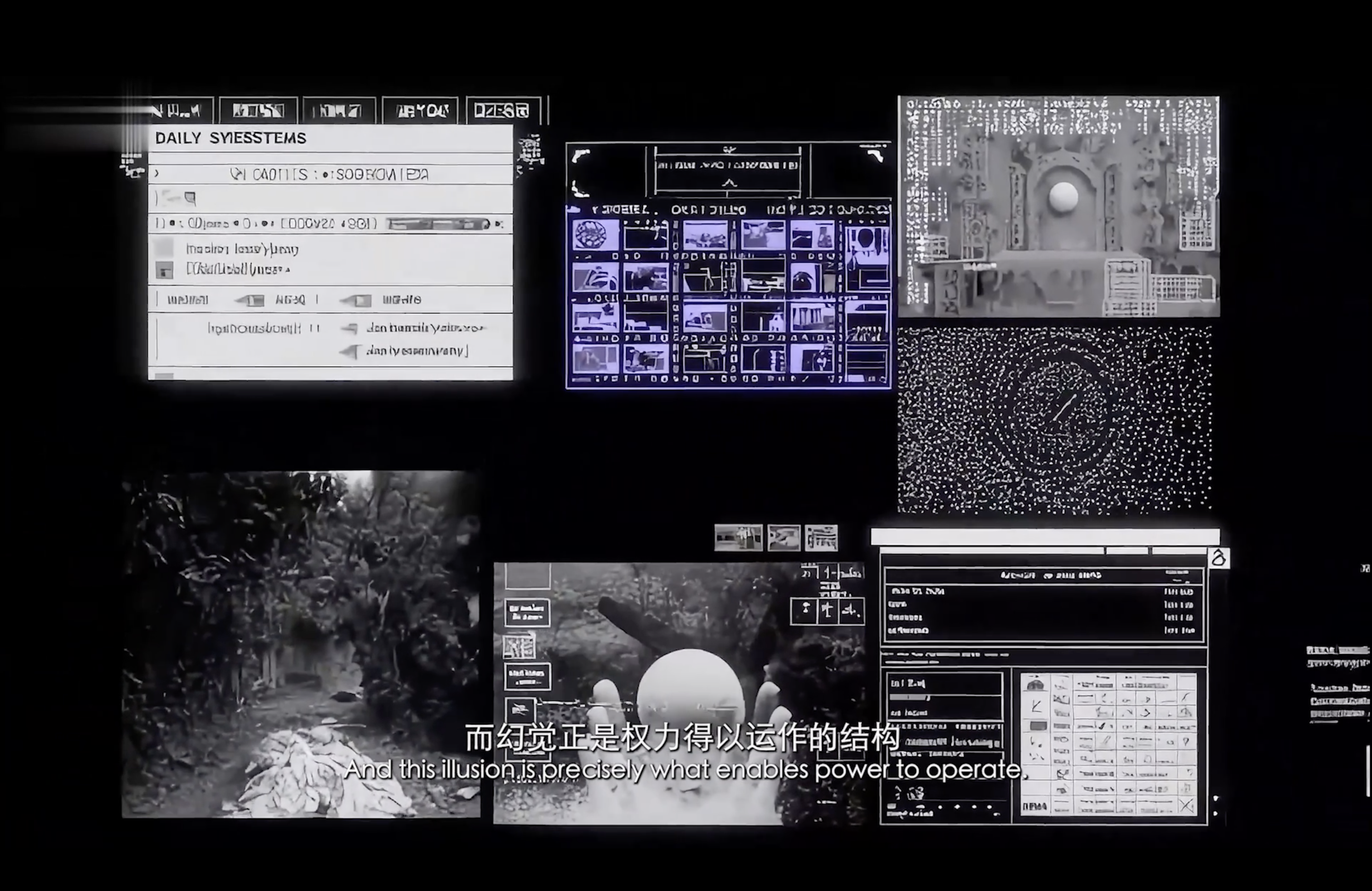通过现代诗作为作品旁白,揭示了在“后全景敞视主义”时代,权力弥散为无处不在的界面与算法。我们通过“量化自我”进入这结构。我们消费着对他人行为进行编程的幻觉,自身的情感和体验也在过程中被持续数据化、调节,最终生成平滑可流通的“数字孪生”。